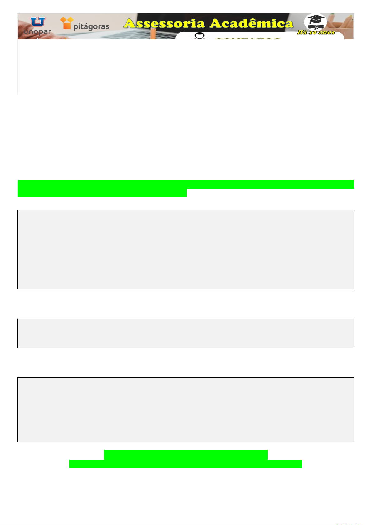 Já imaginou sempre tirar NOTA MÁXIMA em seu Portfólio assim como os demais Cursistas fazem sem precisar quebrar cabeça e perder noites confeccionando-o? Então, seja muito bem vindo(a), meu nome é ALEX, sou especialista em confecção de TRABALHOS ACADEMICOS na área Ciências Contábeis, Economia, Administração, Gestão Financeira, Gestão Comercial, Gestão Púbica, Educação Física, Serviço Social, Produção Industrial, Negócios Imobiliários entre outros Cursos da UNOPAR, ANHNAGUERA, FAVENI, ESTACIO, UNIASSELVI, UNIP, UNINTER. Estou no mercado há 10 (DEZ) anos, tenho muitos clientes satisfeito Graças a DEUS. Estou aqui para te ajudar a tirar uma nota máxima em seu trabalho acadêmico e já tenho pronto para envio este: PORTFÓLIO INDIVIDUAL PROJETO DE EXTENSÃO I - GESTÃO HOSPITALAR 2024 - PROGRAMA DE AÇÃO E DIFUSÃO CULTURAL. FINALIDADE E MOTIVAÇÃO: A finalidade do projeto de extensão no Programa de Ação e Difusão Cultural do curso de CST em Gestão Hospitalar, está relacionado ao fomento à cultura locorregional, promovendo a difusão, a transparência e a democratização das ações culturais, por meio de projetos que possibilitem a transferência para a sociedade de conhecimentos multidisciplinares desenvolvidos no curso e a possibilidade de potencializar a geração de conhecimentos aplicados, permitindo que você tenha um maior envolvimento com às ações culturais no âmbito da ciência, arte, tecnologia e humanidades, articulados com os anseios da comunidade. Os conteúdos programáticos sugeridos para correlacionar as ações são: Ações Educativas em Segurança do Trabalho, Responsabilidade Social e Ambiental, Biossegurança, Direito Hospitalar, Modelos de Gestão, Gestão de Projetos. Processo Saúde e Doença. Os locais que poderão contemplar esse projeto são: Parcerias com a Prefeitura; Associações de Bairros; UBS; Hospitais; Clínicas de Saúde Públicas e Privadas; Centros de Saúde; Casas de Repouso; Instituições de Longa Permanência para Idosos; Creches; Templos Religiosos; Escolas; ONGs. COMPETÊNCIAS: I - Planejar estratégias para a viabilidade e o desenvolvimento institucional; II - Gerenciar pessoas, estimulando o trabalho em equipe e mediando conflitos; III - Gerenciar os recursos financeiros, visando à sustentabilidade organizacional; IV - Gerenciar a qualidade dos serviços das áreas meio e fim de organizações de saúde. PERFIL DO EGRESSO: O perfil do egresso do curso de CST em Gestão Hospitalar idealizado pela IES proporciona a formação profissional que, de acordo com as determinações legais do Curso Superior de Tecnologia em Gestão Hospitalar, tenha como valores e pressupostos essenciais um perfil generalista, crítico, reflexivo, propositivo, humanístico, e dinâmico, apto a agir eticamente, capaz de planejar, organizar, coordenar e controlar os processos de trabalho em organizações da área de saúde, com domínio de gestão de pessoas, dos sistemas de informação, dos recursos materiais e financeiros, organizando fluxos de trabalho e informações, o programa de ação e difusão cultural, permitirá o desenvolvimento de habilidades como, atuação com base em princípios éticos, de maneira sustentável, empregando criatividade e visão empreendedora na solução de problemas presentes na sociedade, considerando aspectos políticos, econômicos, ambientais, culturais e sociais Caso tenha interesse entre em contato: WhatsApp: 073 9 9900 0037 ou pelo email: aleksbraw@gmail.com