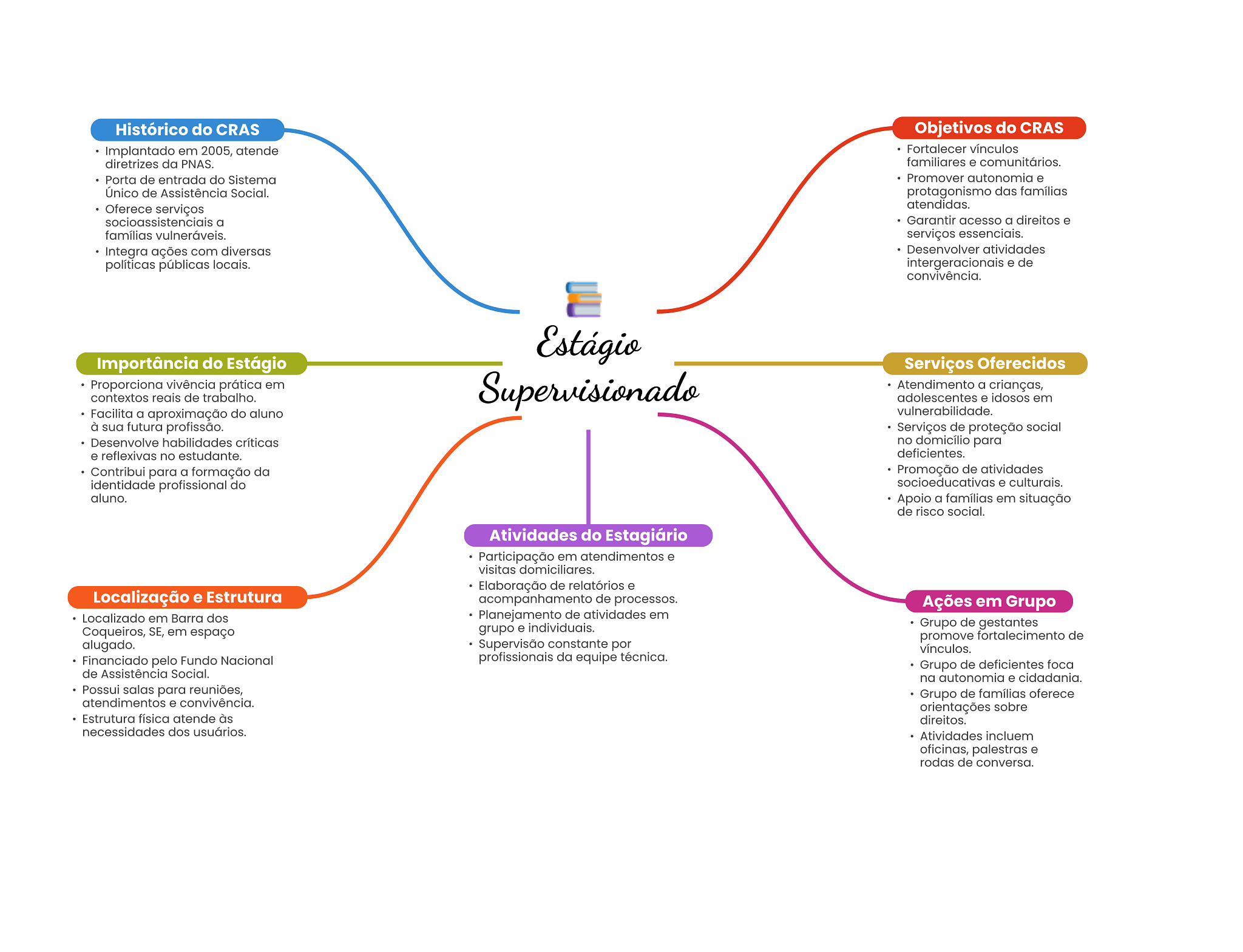 Histórico do CRAS Objetivos do CRAS Implantado em 2005, atende Fortalecer vínculos diretrizes da PNAS. familiares e comunitários. Porta de entrada do Sistema Promover autonomia e Único de Assistência Social. protagonismo das famílias Oferece serviços atendidas. socioassistenciais a Garantir acesso a direitos e famílias vulneráveis. serviços essenciais. Integra ações com diversas Desenvolver atividades políticas públicas locais. intergeracionais e de convivência. Estágio Importância do Estágio Serviços Oferecidos Proporciona vivência prática em contextos reais de trabalho. Supervisionado Atendimento a crianças, adolescentes e idosos em Facilita a aproximação do aluno vulnerabilidade. à sua futura profissão. Serviços de proteção social Desenvolve habilidades críticas no domicílio para e reflexivas no estudante. deficientes. Contribui para a formação da Promoção de atividades identidade profissional do socioeducativas e culturais. aluno. Apoio a famílias em situação de risco social. Atividades do Estagiário Participação em atendimentos e visitas domiciliares. Elaboração de relatórios e Localização e Estrutura acompanhamento de processos. Ações em Grupo Localizado em Barra dos Planejamento de atividades em Coqueiros, SE, em espaço grupo e individuais. Grupo de gestantes promove fortalecimento de alugado. Supervisão constante por vínculos. Financiado pelo Fundo Nacional profissionais da equipe técnica. Grupo de deficientes foca de Assistência Social. na autonomia e cidadania. Possui salas para reuniões, Grupo de famílias oferece atendimentos e convivência. orientações sobre Estrutura física atende às direitos. necessidades dos usuários. Atividades incluem oficinas, palestras e rodas de conversa.