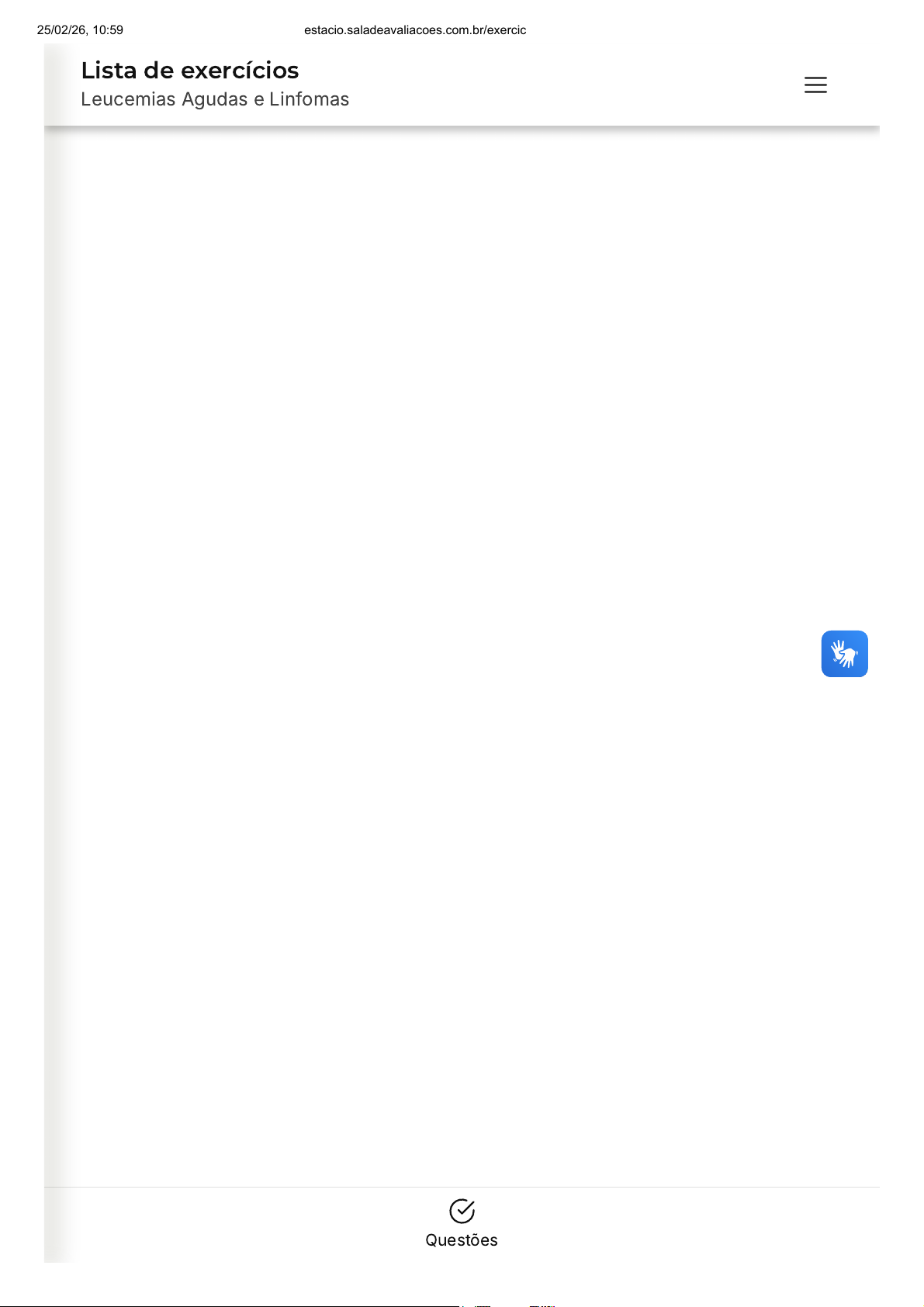 Questões Lista de exercícios Leucemias Agudas e Linfomas 25/02/26, 10:59 estacio.saladeavaliacoes.com.br/exercicio/699f00105dc6e19bb9850c0a/gabarito/ https://estacio.saladeavaliacoes.com.br/exercicio/699f00105dc6e19bb9850c0a/gabarito/ 1/14 Você acertou 2 de 10 questões Verifique o seu desempenho e continue treinando! Você pode refazer o exercício quantas vezes quiser. Verificar Desempenho A B C D E 1 Marcar para revisão A leucemia mieloide aguda foi classificada pela FAB em oito tipos, de LMA-MO até LMA-M3. Essa classificação se baseia na análise morfológica das células encontradas. A seguir são descritas algumas características dos diferentes tipos de leucemia mieloide aguda. Sobre a LMA-M3, analise as afirmativas abaixo. I. Tipo de leucemia característico de mulheres após a menopausa. II. As células apresentam citoplasma com bastante granulações e bastonetes de Auer e o núcleo excêntrico. III. Está presente as células de Fogott. IV. Nesta leucemia há presença de 50% de eritroblastos (precursores dos eritrócitos) e com 30% das células não eritróides. Marque a alternativa que apresenta as afirmativas corretas. I e II. I e III. I e IV. II e III. II e IV 25/02/26, 10:59 estacio.saladeavaliacoes.com.br/exercicio/699f00105dc6e19bb9850c0a/gabarito/ https://estacio.saladeavaliacoes.com.br/exercicio/699f00105dc6e19bb9850c0a/gabarito/ 2/14 E A B C D II e IV. Resposta correta Parabéns, você selecionou a alternativa correta. Confira o gabarito comentado! Gabarito Comentado As afirmativas II e III estão corretas. Representa de 6 a 7% de todas as LMAs e é mais incidente entre 30 e 35 anos. As células apresentam citoplasma com muitas granulações e bastonetes de Auer, sendo o núcleo excêntrico. Às vezes, a quantidade de bastonetes é tão grande que fica difícil distinguir o núcleo do citoplasma; nesse caso, são chamados de células de Fogott. 2 Marcar para revisão (Adaptado de EBSERH CH UFPA-AOCP-2016). A leucemia é originada na medula óssea, local onde as células sanguíneas são produzidas. Os glóbulos brancos (leucócitos) são as células acometidas que se reproduzem de forma descontrolada, gerando os sinais e sintomas da doença. De acordo com a célula envolvida, divide-se em mieloide e linfoide. Marque a alternativa que diferencia uma leucemia da outra. Mieloide deriva da célula-tronco madura e linfoide, dos linfócitos. Mieloide deriva dos leucócitos granulosos e linfoide dos leucócitos granulosos. Mieloide pode ser o granulócito ou o basófilo e linfoide e o linfócito o monócito. Mieloide deriva do precursor mieloide e na linfoide o precursor linfoide é a célula maligna. N mi l id i ófil é él l m li li f id 25/02/26, 10:59 estacio.saladeavaliacoes.com.br/exercicio/699f00105dc6e19bb9850c0a/gabarito/ https://estacio.saladeavaliacoes.com.br/exercicio/699f00105dc6e19bb9850c0a/gabarito/ 3/14 E A B Na mieloide apenas o eosinófilo é a célula maligna e na linfoide a célula maligna é a célula-tronco linfoide ou os eritrócitos. Resposta incorreta Opa! A alternativa correta é a letra D. Confira o gabarito comentado! Gabarito Comentado A leucemia é uma doença complexa que ocorre devido à proliferação desordenada de células hematológicas malignas na medula óssea. Esta doença pode afetar outros órgãos do corpo, como gânglios linfáticos, baço, testículos, fígado e Sistema Nervoso Central. A leucemia linfoide aguda (LLA) é caracterizada pela produção exacerbada dos linfoblastos, que são células precursoras com pouco ou nenhuma maturação e que originam os linfócitos B e T. Isso resulta na diminuição progressiva da produção de células normais, como eritrócitos, outros leucócitos e plaquetas. Na leucemia mieloide aguda (LMA), ocorre a transformação maligna e a proliferação clonal de precursores de linhagem mieloide, os mieloblastos. Assim como na LLA, a produção insuficiente de células sanguíneas causa plaquetopenia, anemia, neutropenia e trombocitopenia. Portanto, a alternativa correta é a D, que afirma que a leucemia mieloide deriva do precursor mieloide e na linfoide o precursor linfoide é a célula maligna. 3 Marcar para revisão O linfoma de Burkitt pode ser dividido em endêmicos (também conhecido como africano) ou como não esporádico. É um tipo de linfoma Não-Hodgkin muito comum em crianças. Morfologicamente, as células apresentam tamanho médio, núcleos redondos com pequenos nucléolos e citoplasma basofílico, podendo apresentar vacúolos no citoplasma. Sabemos que o linfoma Não-Hodgkin endêmico é associado a algumas doenças de base. Assinale a opção que representa de forma correta essas doenças de base. Infecção por EBV e malária. Infecção por Tripanossoma cruzi. 25/02/26, 10:59 estacio.saladeavaliacoes.com.br/exercicio/699f00105dc6e19bb9850c0a/gabarito/ https://estacio.saladeavaliacoes.com.br/exercicio/699f00105dc6e19bb9850c0a/gabarito/ 4/14 C D E A Infecção pelo papilomavírus humano. Infecção por Mycobacterium tuberculosis. Infecção por dengue. Resposta incorreta Opa! A alternativa correta é a letra A. Confira o gabarito comentado! Gabarito Comentado O linfoma de Burkitt africano, ou endêmico, está associado à imunodeficiência resultante da infecção por EBV (Vírus Epstein-Barr) e malária. Este tipo de linfoma é mais comum em crianças, que frequentemente apresentam uma massa celular na mandíbula. Além disso, este linfoma também tem sido associado às infecções pelo HIV. As infecções por Tripanossoma cruzi, papilomavírus humano, Mycobacterium tuberculosis e dengue, presentes nas demais alternativas, não estão associadas ao linfoma de Burkitt. Portanto, a alternativa correta é a "A", que menciona a infecção por EBV e malária como doenças de base associadas ao linfoma de Burkitt. 4 Marcar para revisão Marina, 29 anos, procurou atendimento médico após notar aumento indolor nos linfonodos cervicais e episódios recorrentes de suores noturnos e