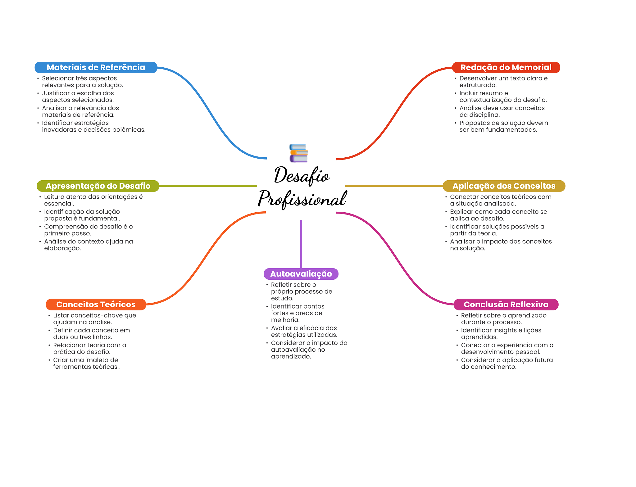 Materiais de Referência Redação do Memorial Selecionar três aspectos Desenvolver um texto claro e relevantes para a solução. estruturado. Justificar a escolha dos Incluir resumo e aspectos selecionados. contextualização do desafio. Analisar a relevância dos Análise deve usar conceitos materiais de referência. da disciplina. Identificar estratégias Propostas de solução devem inovadoras e decisões polêmicas. ser bem Desafio Apresentação do Desafio Aplicação dos Conceitos Leitura atenta das orientações é essencial. Profissional Conectar conceitos teóricos com a situação analisada. Identificação da solução Explicar como cada conceito se proposta é fundamental. aplica ao desafio. Compreensão do desafio é O Identificar soluções possíveis a primeiro passo. partir da teoria. Análise do contexto ajuda na Analisar O impacto dos conceitos elaboração. na solução. Autoavaliação Refletir sobre próprio processo de estudo. Conceitos Teóricos Identificar pontos Conclusão Reflexiva Listar conceitos-chave que fortes e áreas de Refletir sobre aprendizado ajudam na análise. melhoria. durante O processo. Definir cada conceito em Avaliar a eficácia das Identificar insights e lições duas ou três linhas. estratégias utilizadas. aprendidas. Relacionar teoria com a Considerar O impacto da Conectar a experiência com prática do desafio. autoavaliação no desenvolvimento pessoal. Criar uma de aprendizado. Considerar a aplicação futura ferramentas teóricas'. do conhecimento.