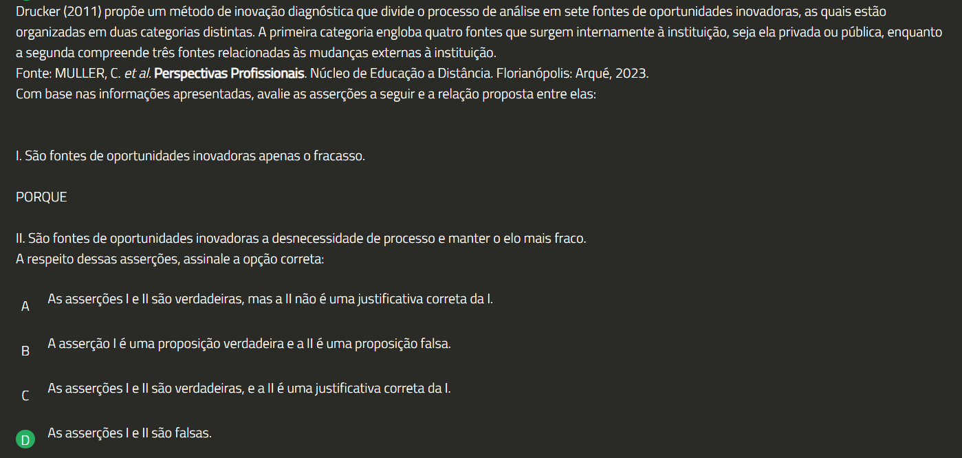 Drucker (2011) propõe um método de inovação diagnóstica que divide 0 processo de análise em sete fontes de oportunidades inovadoras, as quais estão organizadas em duas categorias distintas. A primeira categoria engloba quatro fontes que surgem internamente à instituição, seja ela privada ou pública, enquanto a segunda compreende três fontes relacionadas às mudanças externas à instituição. Fonte: MULLER, C. et al. Perspectivas Profissionais. Núcleo de Educação a Distância. Florianópolis: Arqué, 2023. Com base nas informações apresentadas, avalie as asserções a seguir e a relação proposta entre elas: São fontes de oportunidades inovadoras apenas 0 fracasso. PORQUE II. São fontes de oportunidades inovadoras a desnecessidade de processo e manter 0 elo mais fraco. A respeito dessas asserções, assinale a opção correta: A As asserções I e são verdadeiras, mas a II não é uma justificativa correta da I. A asserção é uma proposição verdadeira e a é uma proposição falsa. As asserções I e são verdadeiras, e a II é uma justificativa correta da I. D As asserções e são falsas.
