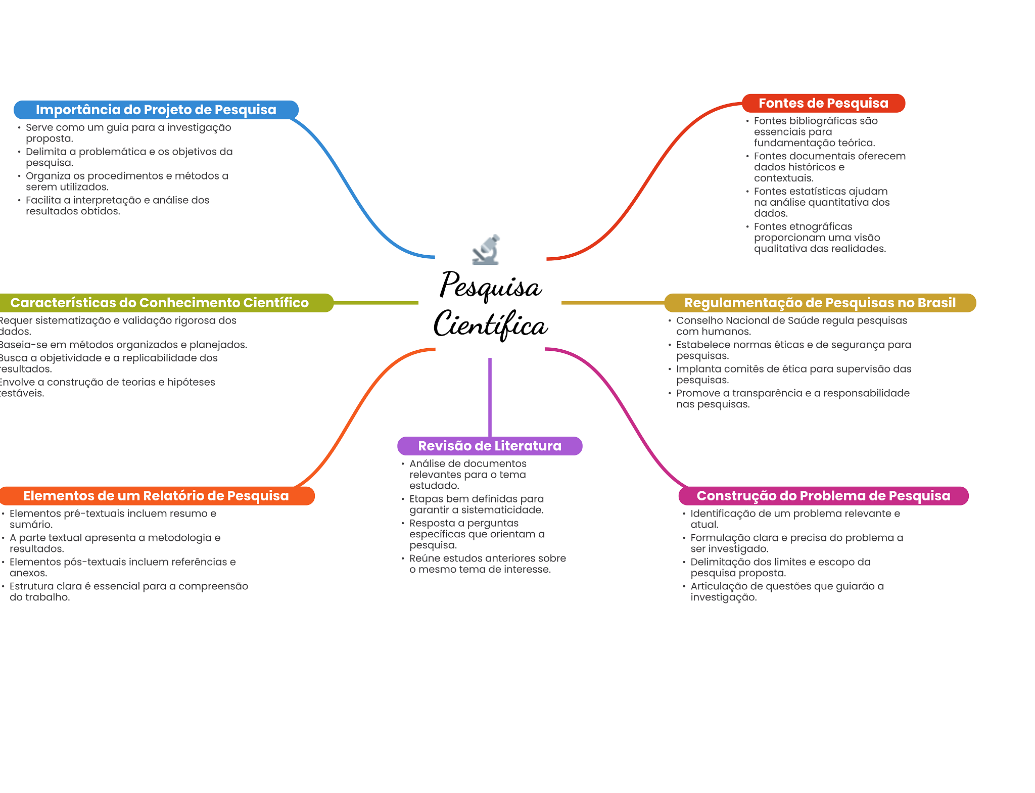 Importância do Projeto de Pesquisa Fontes de Pesquisa Fontes bibliográficas são Serve como um guia para a investigação essenciais para proposta. fundamentação teórica. Delimita a problemática e objetivos da Fontes documentais oferecem pesquisa. dados históricos e Organiza procedimentos e métodos a contextuais. serem utilizados. Fontes estatísticas ajudam Facilita a interpretação e análise dos na análise quantitativa dos resultados obtidos. dados. Fontes etnográficas proporcionam uma visão qualitativa das realidades. Pesquisa Características do Conhecimento Científico Regulamentação de Pesquisas no Brasil Requer sistematização e validação rigorosa dos Científica Conselho Nacional de Saúde regula pesquisas dados. com humanos. Baseia-se em métodos organizados e planejados. Estabelece normas éticas e de segurança para Busca a objetividade e a replicabilidade dos pesquisas. Implanta comitês de ética para supervisão das Envolve a construção de teorias e hipóteses pesquisas. testáveis. Promove a transparência e a responsabilidade nas pesquisas. Revisão de Literatura Análise de documentos relevantes para tema estudado. Elementos de um Relatório de Pesquisa Etapas bem definidas para Construção do Problema de Pesquisa Elementos pré-textuais incluem resumo e garantir a sistematicidade. Identificação de um problema relevante e sumário. Resposta a perguntas atual. A parte textual apresenta a metodologia e específicas que orientam a Formulação clara e precisa do problema a resultados. pesquisa. ser investigado. Elementos pós-textuais incluem referências e Reúne estudos anteriores sobre Delimitação dos limites e escopo da mesmo tema de interesse. anexos. pesquisa proposta. Estrutura clara é essencial para a compreensão Articulação de questões que guiarão a do trabalho. investigação.