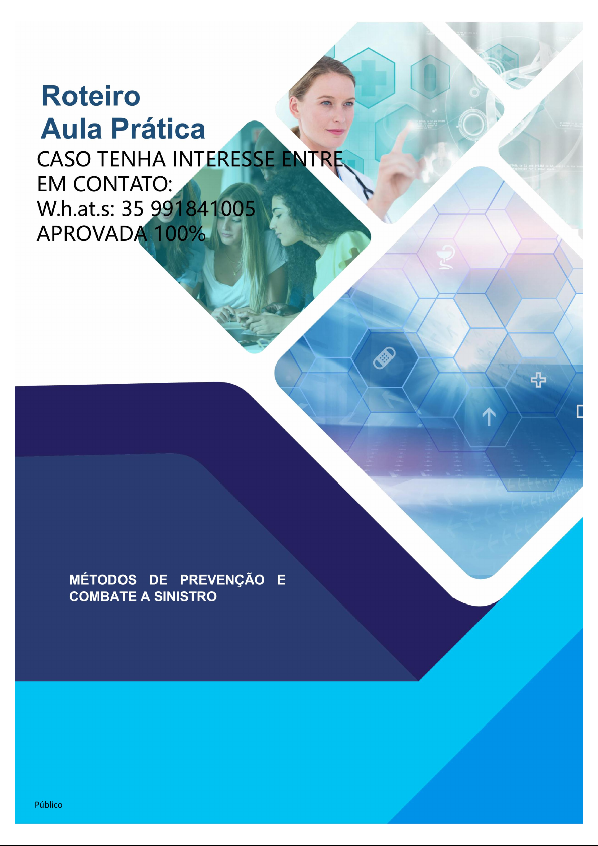 Roteiro Aula Prática CASO TENHA INTERESSE ENTRE EM CONTATO: W.h.at.s: 35 991841005 APROVADA 100% + MÉTODOS DE PREVENÇÃO E COMBATE A SINISTRO PúblicoROTEIRO DE AULA PRÁTICA NOME DA DISCIPLINA: MÉTODOS DE PREVENÇÃO E COMBATE A SINISTRO. Unidade: U2_COMBATE A INCÊNDIOS, LEGISLAÇÃO E CRITÉRIOS DE DIMENSIONAMENTO Aula: A1_AGENTES EXTINTORES, REDE DE HIDRANTES, MANGOTINHOS E SISTEMAS AUTOMÁTICOS DE COMBATE A INCÊNDIO Tempo previsto de execução de aula prática: 2h OBJETIVOS Definição dos objetivos da aula prática: Verificar as classes de incêndio, compreender como o fogo se propaga nos objetos e aprender a usar corretamente os extintores de incêndio. O objetivo é ensinar a identificar os diferentes tipos de incêndio e os métodos apropriados para combatê-los, garantindo a segurança e a eficácia nas ações de combate ao fogo. SOLUÇÃO DIGITAL (OBRIGATÓRIO SE HOUVER - APARECER PARA TODOS) Infraestrutura mínima necessária para execução. O Laboratório Virtual é acessado via AVA do aluno. Recomenda-se utilizar Google Chrome para Windows 10 e Mozilla Firefox para Windows 7, ambos atualizados. Além disso, é essencial uma conexão de internet estável, com um bom teste de velocidade. EQUIPAMENTO DE PROTEÇÃO INDIVIDUAL (EPI) (CAMPO OBRIGATÓRIO - - APARECER PARA TODOS) Por se tratar de uma prática simulada, não são necessários equipamentos de proteção individual para uso do ambiente virtual. PROCEDIMENTOS PRÁTICOS (OBRIGATÓRIO - TODOS) PúblicoProcedimento/Atividade Atividade proposta: Verificação dos procedimentos de prevenção e combate. Procedimentos para a realização da atividade: Explorando a planta do projeto Explore cuidadosamente o local da inspeção e as atividades necessárias, seguindo o passo a passo. Comece verificando cada extintor. Observe as instruções exibidas no tutor virtual. Seja bem-vindo simulador da Nesta realizaremos prevenção contra de uma AVANÇAR » (Q) Extintor de Água Pressurizada Tarefas TROCAR INSPEÇÃO Extintor Água Pressurizada hoje 12/11/2019 Classifique Extintor APROVADO Integridade Perfeita USAR Validade Maio 19 Peso 9Kg Lacre Intacto MANUTENÇÃO Rotacionar Objeto ou Zoom Público(Q) Extintor de Pó Químico Seco (PQS) INSPEÇÃO TROCAR Data de hoje: Extintor Seco Itens Classifique Extintor Pressão: 1 APROVADO Integridade Perfeita Validade: 18 Peso: 4Kg Ausente RECARREGAR Rotacionar Objeto ou Zoom Classe de Incêndio e Procedimento de Combate Observe o feedback da ação e, caso indique um erro, realize a ação de maneira correta. (Q) Tarefas Fogo Selecione extintor correto Pó Químico Seco Água Pressurizada Pó Químico Especial Checklist: Preparação Inicial: Explorar ambiente de trabalho. Checar os extintores e executar a melhor ação Verificar a situação de principio de incendio e tomar uma decisão mais adequada. Elaborar o relatório. RESULTADOS (obrigatório - aparecer para todos) Resultados de Aprendizagem: PúblicoAo final da prática, você deverá compreender os conceitos de combate a incêndios, incluindo a identificação das classes de incêndio, os métodos de extinção apropriados e a utilização correta dos extintores. Você será capaz de executar procedimentos experimentais no simulador, analisando as plantas do projeto, respondendo questionamentos específicos e implementando medidas de combate. Além disso, aprenderá a aplicar esses conceitos na identificação de medidas de controle, identificar possíveis fontes de erro e discutir a precisão dos resultados. A prática também reforçará a importância da inspeção regular e da manutenção dos sistemas de prevenção e proteção contra incêndios para garantir a segurança no ambiente de trabalho. ESTUDANTE, VOCÊ DEVERÁ ENTREGAR (não obrigatório - aparecer para todos) Descrição orientativa sobre a entregada da comprovação da aula prática: Você deverá elaborar um relatório detalhado sobre a prática Verificação dos procedimentos de prevenção e combate. relatório deve incluir uma introdução, explicando objetivo da prática e a importância da identificação das classes de incêndios e dos procedimentos de combate na segurança dos ocupantes e na conformidade com as normas de segurança. Na seção de materiais e métodos, liste os equipamentos e materiais utilizados no simulador, como as plantas 2D e 3D, e descreva os procedimentos realizados, desde a exploração das plantas até a determinação da carga de incêndio, a definição da quantidade de extintores, sistema de iluminação de emergência e a sinalização de abandono de local. Na parte de resultados, apresente os dados coletados em tabelas, incluindo as respostas aos questionamentos em cada fase do projeto. Na discussão, analise os resultados obtidos, construindo gráficos que representem a relação entre as medições e os requisitos normativos, e discuta as possíveis causas das diferenças e a eficácia das medidas de controle propostas. Na conclusão, faça uma síntese dos aprendizados obtidos e uma reflexão sobre a importância do experimento e sua aplicação em contextos profissionais. Além disso, responda aos seguintes questionamentos: 1. Quais são os três elementos que constituem fogo? 2. Quais são e como funcionam as três formas de extinção de fogo? 3. Explique a importância de se fazer uma inspeção periódica dos extintores? 4. Quais as classes de incêndio e quais os extintores recomendados para cada uma? REFERÊNCIAS BIBLIOGRÁFICAS (não obrigatório aparecer para todos) Descrição (em abnt) das referências utilizadas PúblicoBRASIL. Ministério do Trabalho. Norma Regulamentadora NR 23: Proteção Contra Incêndios. Disponível em: https://www.gov.br/trabalho-e-emprego/pt-br/acesso-a- informacao/participacao-social/conselhos-e-orgaos-colegiados/comissao-tripartite- partitaria-permanente/arquivos/normas-regulamentadoras/nr-23-atualizada-2022.pdf FILHO, Antonio Nunes Segurança do Trabalho e Gestão Ambiental, 