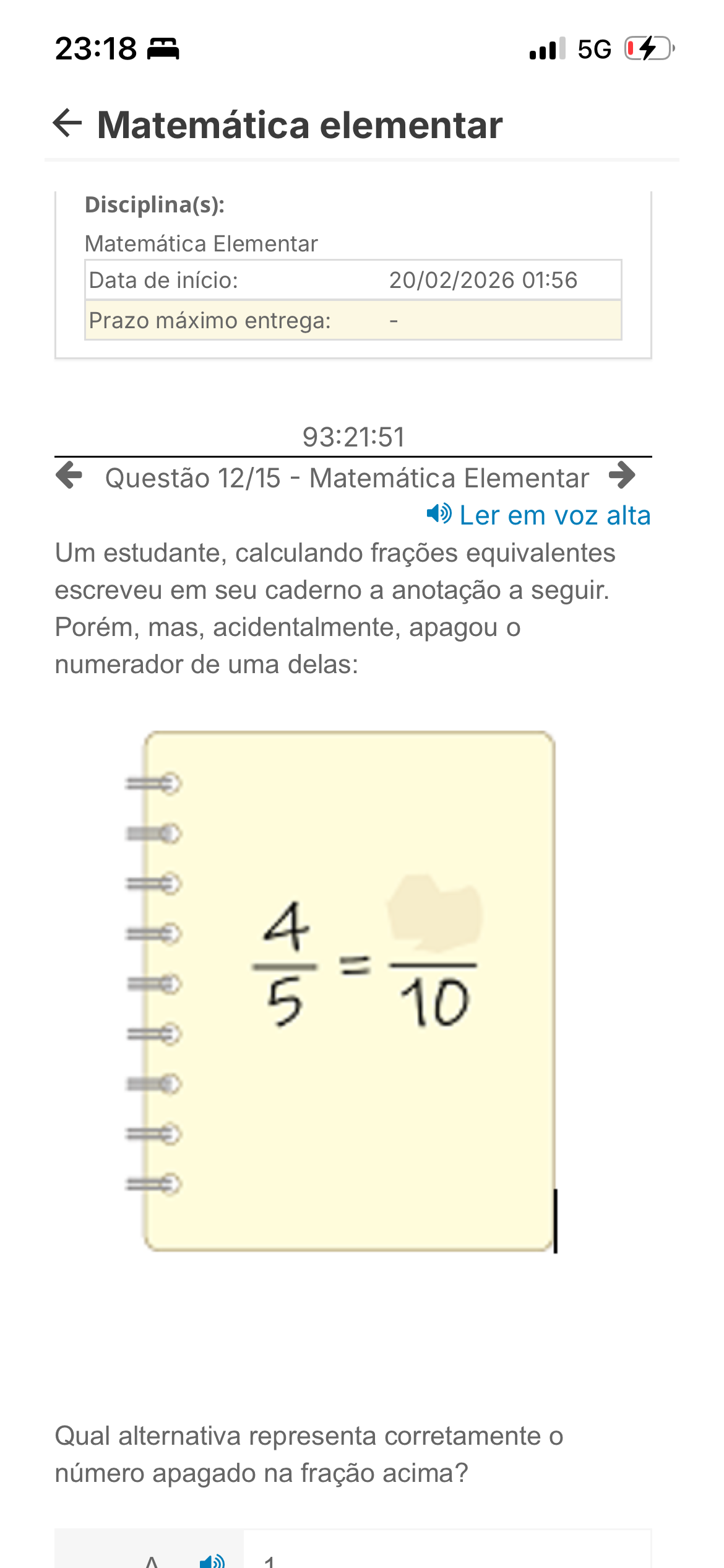 23:18 5G Matemática elementar Disciplina(s): Matemática Elementar Data de início: 20/02/2026 01:56 Prazo máximo entrega: - 93:21:51 Questão 12/15 - Matemática Elementar Ler em voz alta Um estudante, calculando frações equivalentes escreveu em seu caderno a anotação a seguir. Porém, mas, acidentalmente, apagou numerador de uma delas: 4 5 10 Qual alternativa representa corretamente número apagado na fração acima? 1