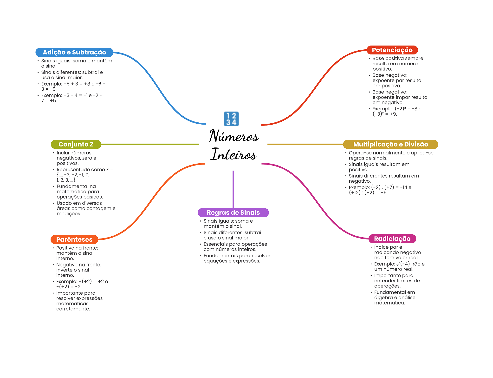 Adição e Subtração Potenciação Sinais iguais: soma e mantém Base positiva sempre resulta em número sinal. positivo. diferentes: subtrai e usa sinal maior. Base negativa: expoente par resulta Exemplo: em positivo. Base negativa: Exemplo: expoente ímpar resulta em negativo. Exemplo: 12 34 Números Conjunto Z Multiplicação e Divisão Inclui números negativos, zero e Inteiros Opera-se normalmente e aplica-se regras de sinais. positivos. Sinais iguais resultam em Representado como Z = positivo. Sinais diferentes resultam em negativo. Fundamental na Exemplo: (-2) (+7) matemática para (+12) : (+2) +6. operações básicas. Usado em diversas áreas como contagem e medições. Regras de Sinais Sinais iguais: soma e mantém sinal. Sinais diferentes: subtrai Parênteses e usa sinal maior. Radiciação Essenciais para operações Positivo na frente: com números inteiros. Indice par e mantém sinal radicando negativo interno. Fundamentais para resolver não tem valor real. equações e expressões. Negativo na frente: Exemplo: não é inverte sinal um número real. interno. Importante para Exemplo: +(+2) entender limites de operações. Importante para Fundamental em resolver expressões álgebra e análise matemáticas matemática. corretamente.