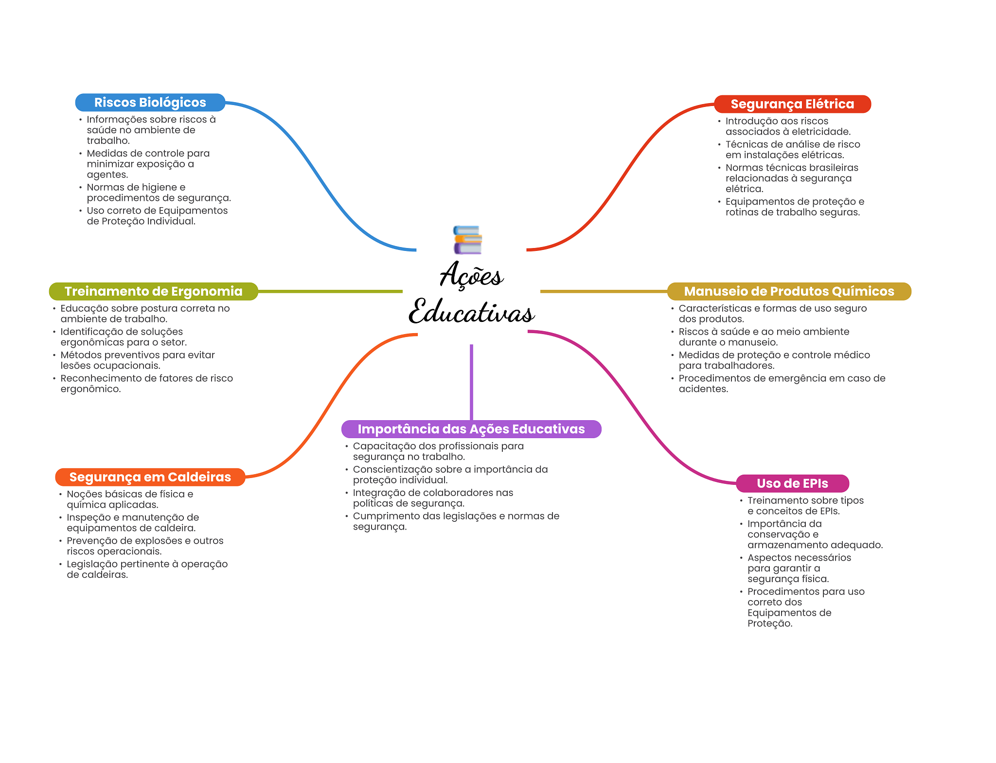 Riscos Biológicos Segurança Elétrica Informações sobre riscos à Introdução aos riscos saúde no ambiente de associados à eletricidade. trabalho. Técnicas de análise de risco Medidas de controle para em instalações elétricas. minimizar exposição a Normas técnicas brasileiras agentes. relacionadas à segurança Normas de higiene e elétrica. procedimentos de segurança. Equipamentos de proteção e Uso correto de Equipamentos rotinas de trabalho seguras. de Proteção Individual. Ações Treinamento de Ergonomia Manuseio de Produtos Químicos Educação sobre postura correta no Educativas Características e formas de uso seguro ambiente de trabalho. dos produtos. Identificação de soluções Riscos à saúde e ao meio ambiente ergonômicas para setor. durante manuseio. Métodos preventivos para evitar Medidas de proteção e controle médico lesões ocupacionais. para trabalhadores. Reconhecimento de fatores de risco Procedimentos de emergência em caso de ergonômico. acidentes. Importância das Ações Educativas Capacitação dos profissionais para segurança no trabalho. Conscientização sobre a importância da Segurança em Caldeiras proteção individual. Uso de EPIs Noções básicas de física e Integração de colaboradores nas química aplicadas. políticas de segurança. Treinamento sobre tipos e conceitos de EPIs. Inspeção e manutenção de Cumprimento das legislações e normas de equipamentos de caldeira. segurança. Importância da conservação e Prevenção de explosões e outros armazenamento adequado. riscos operacionais. Aspectos necessários Legislação pertinente à operação de caldeiras. para garantir a segurança física. Procedimentos para uso correto dos Equipamentos de Proteção.