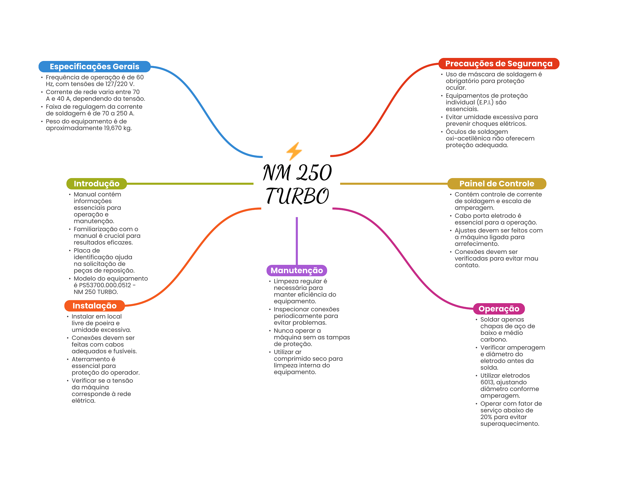 Especificações Gerais Precauções de Segurança Frequência de operação é de 60 Uso de máscara de soldagem é Hz, com tensões de 127/220 V. obrigatório para proteção ocular. Corrente de rede varia entre 70 A e 40 dependendo da tensão. Equipamentos de proteção individual (E.P.I.) são Faixa de regulagem da corrente essenciais. de soldagem é de 70 a 250 A. Evitar umidade excessiva para Peso do equipamento é de prevenir choques elétricos. aproximadamente 19,670 kg. Óculos de soldagem oxi-acetilênica não oferecem proteção adequada. NM 250 Introdução Painel de Controle Manual contém TURBO Contém controle de corrente informações de soldagem e escala de essenciais para amperagem. operação e Cabo porta eletrodo é manutenção. essencial para a operação. Familiarização com Ajustes devem ser feitos com manual é crucial para a máquina ligada para resultados eficazes. arrefecimento. Placa de Conexões devem ser identificação ajuda verificadas para evitar mau na solicitação de contato. peças de reposição. Manutenção Modelo do equipamento Limpeza regular é é PS53700.000.0512 necessária para NM 250 TURBO. manter eficiência do equipamento. Instalação Inspecionar conexões Operação Instalar em local periodicamente para evitar problemas. Soldar apenas livre de poeira e umidade excessiva. chapas de aço de Nunca operar a baixo e médio Conexões devem ser máquina sem as tampas carbono. feitas com cabos de proteção. adequados e fusíveis. Verificar amperagem Utilizar ar e diâmetro do Aterramento é comprimido seco para eletrodo antes da essencial para limpeza interna do solda. proteção do operador. equipamento. Utilizar eletrodos Verificar se a tensão 6013, ajustando da máquina diâmetro conforme corresponde à rede amperagem. elétrica. Operar com fator de serviço abaixo de 20% para evitar superaquecimento.