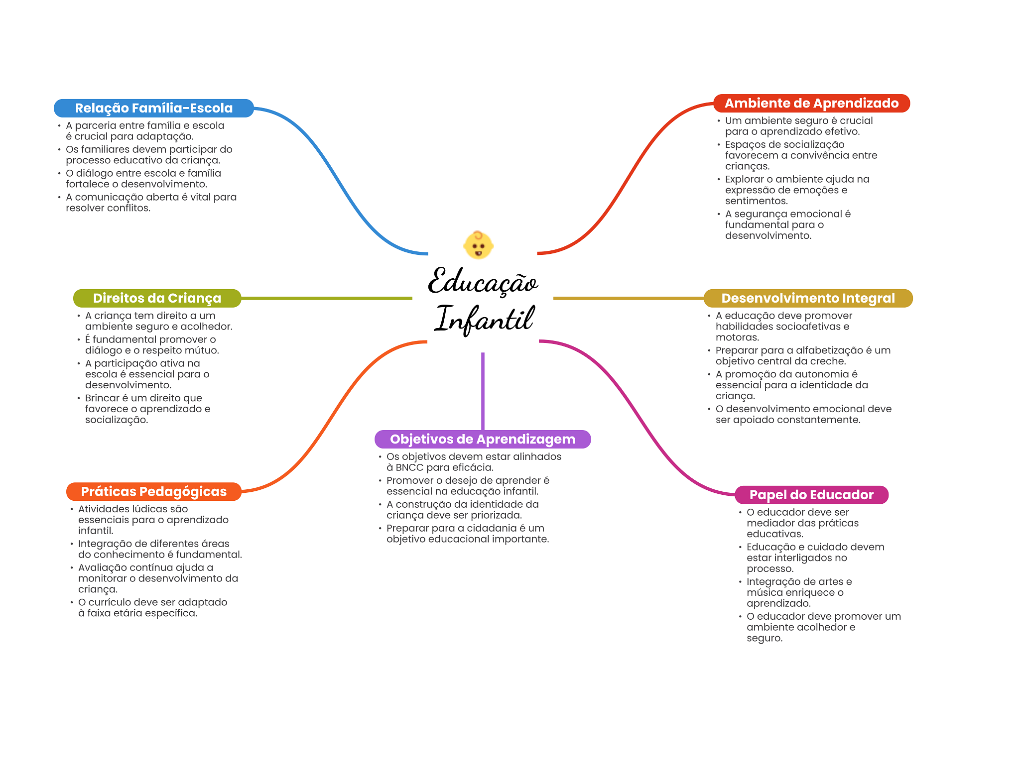 Relação Família-Escola Ambiente de Aprendizado A parceria entre família e escola Um ambiente seguro é crucial é crucial para adaptação. para aprendizado efetivo. Os familiares devem participar do Espaços de socialização favorecem a convivência entre processo educativo da criança. crianças. diálogo entre escola e família fortalece desenvolvimento. Explorar ambiente ajuda na expressão de emoções e A comunicação aberta é vital para sentimentos. resolver conflitos. A segurança emocional é fundamental para desenvolvimento. Educação Direitos da Criança Desenvolvimento Integral A criança tem direito a um Infantil A educação deve promover ambiente seguro e acolhedor. habilidades socioafetivas e É fundamental promover motoras. diálogo e respeito mútuo. Preparar para a alfabetização é um A participação ativa na objetivo central da creche. escola é essencial para A promoção da autonomia é desenvolvimento. essencial para a identidade da Brincar é um direito que criança. favorece aprendizado e O desenvolvimento emocional deve socialização. ser apoiado constantemente. Objetivos de Aprendizagem Os objetivos devem estar alinhados à BNCC para eficácia. Promover desejo de aprender é Práticas Pedagógicas essencial na educação infantil. Papel do Educador Atividades lúdicas são A construção da identidade da essenciais para aprendizado criança deve ser priorizada. educador deve ser infantil. Preparar para a cidadania é um mediador das práticas educativas. Integração de diferentes áreas objetivo educacional importante. Educação e cuidado devem do conhecimento é fundamental. estar interligados no Avaliação contínua ajuda a processo. monitorar desenvolvimento da Integração de artes e criança. música enriquece currículo deve ser adaptado aprendizado. à faixa etária específica. educador deve promover um ambiente acolhedor e seguro.
