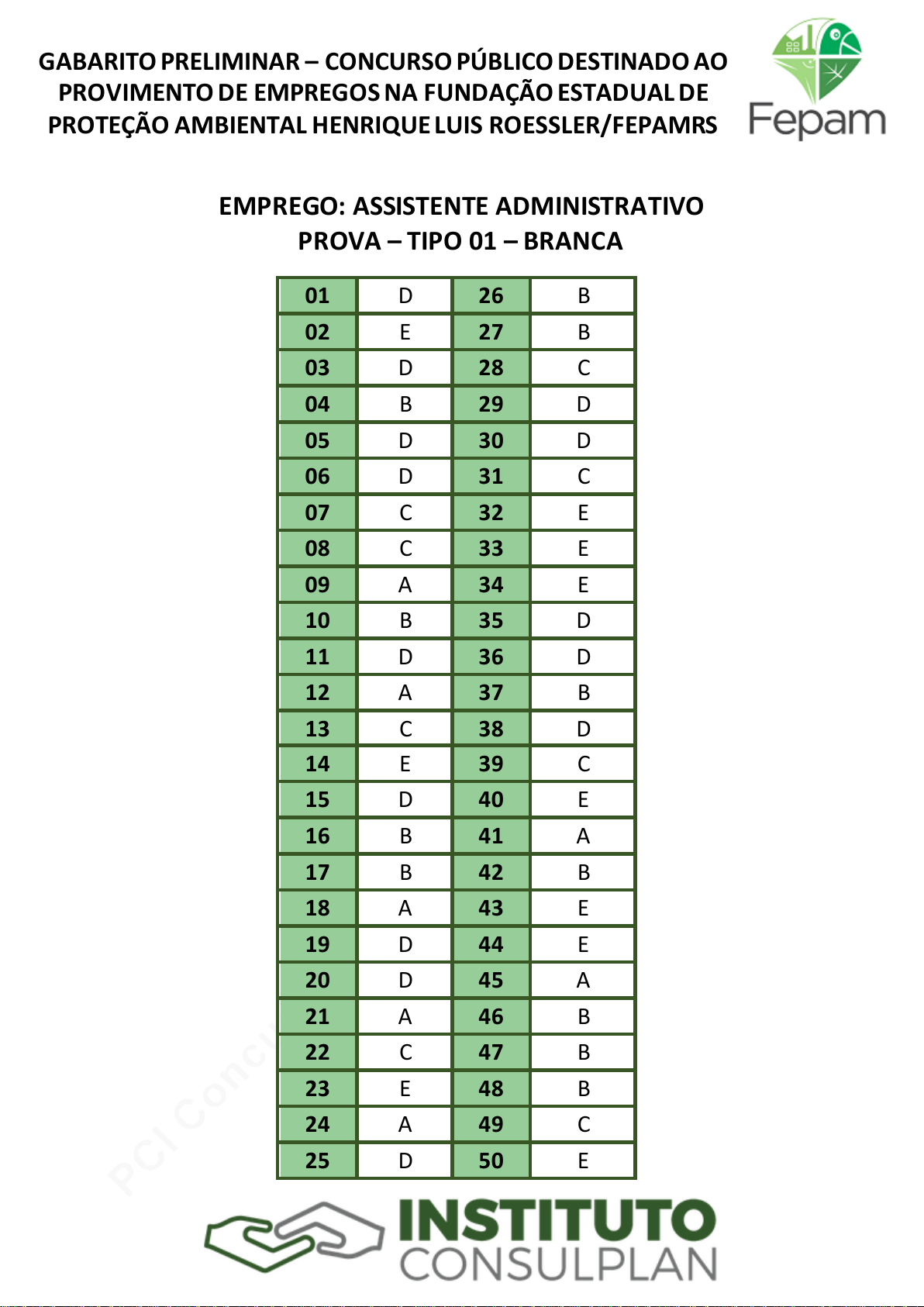 pcimarkpci MjgwNDo2ZmU4OjAxZDU6ZTcwMDpiYzJjOmNkZTI6MjJmOTo0M2Nh:V2VkLCAyNSBGZWIgMjAyNiAyMzowMjo1MyAtMDMwMA== www.pciconcursos.com.br GABARITO PRELIMINAR – CONCURSO PÚBLICO DESTINADO AO PROVIMENTO DE EMPREGOS NA FUNDAÇÃO ESTADUAL DE PROTEÇÃO AMBIENTAL HENRIQUE LUIS ROESSLER/FEPAMRS EMPREGO: ASSISTENTE ADMINISTRATIVO PROVA – TIPO 01 – BRANCA 01 D 26 B 02 E 27 B 03 D 28 C 04 B 29 D 05 D 30 D 06 D 31 C 07 C 32 E 08 C 33 E 09 A 34 E 10 B 35 D 11 D 36 D 12 A 37 B 13 C 38 D 14 E 39 C 15 D 40 E 16 B 41 A 17 B 42 B 18 A 43 E 19 D 44 E 20 D 45 A 21 A 46 B 22 C 47 B 23 E 48 B 24 A 49 C 25 D 50 E pcimarkpci MjgwNDo2ZmU4OjAxZDU6ZTcwMDpiYzJjOmNkZTI6MjJmOTo0M2Nh:V2VkLCAyNSBGZWIgMjAyNiAyMzowMjo1MyAtMDMwMA== www.pciconcursos.com.br GABARITO PRELIMINAR – CONCURSO PÚBLICO DESTINADO AO PROVIMENTO DE EMPREGOS NA FUNDAÇÃO ESTADUAL DE PROTEÇÃO AMBIENTAL HENRIQUE LUIS ROESSLER/FEPAMRS EMPREGO: ASSISTENTE ADMINISTRATIVO PROVA – TIPO 02 – VERDE 01 D 26 A 02 B 27 E 03 A 28 D 04 C 29 C 05 D 30 A 06 D 31 E 07 D 32 C 08 E 33 D 09 D 34 E 10 E 35 D 11 B 36 E 12 C 37 A 13 A 38 B 14 D 39 D 15 C 40 B 16 D 41 C 17 D 42 E 18 A 43 A 19 B 44 B 20 B 45 E 21 D 46 B 22 B 47 C 23 C 48 E 24 B 49 E 25 D 50 B pcimarkpci MjgwNDo2ZmU4OjAxZDU6ZTcwMDpiYzJjOmNkZTI6MjJmOTo0M2Nh:V2VkLCAyNSBGZWIgMjAyNiAyMzowMjo1MyAtMDMwMA== www.pciconcursos.com.br GABARITO PRELIMINAR – CONCURSO PÚBLICO DESTINADO AO PROVIMENTO DE EMPREGOS NA FUNDAÇÃO ESTADUAL DE PROTEÇÃO AMBIENTAL HENRIQUE LUIS ROESSLER/FEPAMRS EMPREGO: ASSISTENTE ADMINISTRATIVO PROVA – TIPO 03 – AMARELA 01 E 26 C 02 D 27 D 03 D 28 E 04 D 29 B 05 A 30 B 06 B 31 D 07 B 32 E 08 D 33 E 09 D 34 D 10 E 35 E 11 D 36 C 12 C 37 C 13 C 38 A 14 C 39 B 15 A 40 D 16 B 41 E 17 D 42 B 18 D 43 E 19 A 44 C 20 B 45 E 21 D 46 B 22 D 47 A 23 A 48 B 24 C 49 B 25 A 50 E pcimarkpci MjgwNDo2ZmU4OjAxZDU6ZTcwMDpiYzJjOmNkZTI6MjJmOTo0M2Nh:V2VkLCAyNSBGZWIgMjAyNiAyMzowMjo1MyAtMDMwMA== www.pciconcursos.com.br GABARITO PRELIMINAR – CONCURSO PÚBLICO DESTINADO AO PROVIMENTO DE EMPREGOS NA FUNDAÇÃO ESTADUAL DE PROTEÇÃO AMBIENTAL HENRIQUE LUIS ROESSLER/FEPAMRS EMPREGO: ASSISTENTE ADMINISTRATIVO PROVA – TIPO 04 – AZUL 01 A 26 B 02 C 27 E 03 D 28 D 04 D 29 A 05 B 30 D 06 E 31 E 07 D 32 E 08 D 33 D 09 D 34 D 10 D 35 C 11 C 36 E 12 C 37 D 13 E 38 C 14 A 39 A 15 B 40 B 16 A 41 E 17 B 42 B 18 D 43 B 19 B 44 B 20 D 45 B 21 B 46 E 22 C 47 E 23 C 48 A 24 A 49 E 25 D 50 C pcimarkpci MjgwNDo2ZmU4OjAxZDU6ZTcwMDpiYzJjOmNkZTI6MjJmOTo0M2Nh:V2VkLCAyNSBGZWIgMjAyNiAyMzowMjo1MyAtMDMwMA== www.pciconcursos.com.br GABARITO PRELIMINAR – CONCURSO PÚBLICO DESTINADO AO PROVIMENTO DE EMPREGOS NA FUNDAÇÃO ESTADUAL DE PROTEÇÃO AMBIENTAL HENRIQUE LUIS ROESSLER/FEPAMRS EMPREGO: ADMINISTRADOR PROVA – TIPO 01 – BRANCA 01 E 26 B 02 C 27 E 03 D 28 A 04 C 29 E 05 D 30 B 06 E 31 A 07 D 32 B 08 D 33 A 09 A 34 A 10 C 35 B 11 C 36 E 12 C 37 C 13 D 38 B 14 C 39 A 15 C 40 A 16 E 41 C 17 A 42 C 18 A 43 B 19 D 44 E 20 A 45 C 21 B 46 E 22 B 47 C 23 B 48 E 24 A 49 D 25 A 50 D pcimarkpci MjgwNDo2ZmU4OjAxZDU6ZTcwMDpiYzJjOmNkZTI6MjJmOTo0M2Nh:V2VkLCAyNSBGZWIgMjAyNiAyMzowMjo1MyAtMDMwMA== www.pciconcursos.com.br GABARITO PRELIMINAR – CONCURSO PÚBLICO DESTINADO AO PROVIMENTO DE EMPREGOS NA FUNDAÇÃO ESTADUAL DE PROTEÇÃO AMBIENTAL HENRIQUE LUIS ROESSLER/FEPAMRS EMPREGO: ADVOGADO PROVA – TIPO 01 – BRANCA 01 E 26 B 02 C 27 E 03 D 28 A 04 C 29 E 05 D 30 B 06 E 31 A 07 D 32 D 08 D 33 B 09 A 34 E 10 C 35 A 11 C 36 C 12 C 37 A 13 D 38 D 14 C 39 D 15 C 40 D 16 E 41 E 17 A 42 E 18 A 43 C 19 D 44 B 20 A 45 B 21 B 46 A 22 B 47 C 23 B 48 D 24 A 49 C 25 A 50 E pcimarkpci MjgwNDo2ZmU4OjAxZDU6ZTcwMDpiYzJjOmNkZTI6MjJmOTo0M2Nh:V2VkLCAyNSBGZWIgMjAyNiAyMzowMjo1MyAtMDMwMA== www.pciconcursos.com.br GABARITO PRELIMINAR – CONCURSO PÚBLICO DESTINADO AO PROVIMENTO DE EMPREGOS NA FUNDAÇÃO ESTADUAL DE PROTEÇÃO AMBIENTAL HENRIQUE LUIS ROESSLER/FEPAMRS EMPREGO: BIÓLOGO PROVA – TIPO 01 – BRANCA 01 E 26 B 02 C 27 E 03 D 28 A 04 C 29 E 05 D 30 B 06 E 31 C 07 D 32 D 08 D 33 E 09 A 34 E 10 C 35 A 11 C 36 E 12 C 37 B 13 D 38 E 14 C 39 D 15 C 40 E 16 E 41 E 17 A 42 E 18 A 43 B 19 D 44 C 20 A 45 E 21 B 46 E 22 B 47 C 23 B 48 B 24 A 49 B 25 A 50 E pcimarkpci MjgwNDo2ZmU4OjAxZDU6ZTcwMDpiYzJjOmNkZTI6MjJmOTo0M2Nh:V2VkLCAyNSBGZWIgMjAyNiAyMzowMjo1MyAtMDMwMA== www.pciconcursos.com.br GABARITO PRELIMINAR – CONCURSO PÚBLICO DESTINADO AO PROVIMENTO DE EMPREGOS NA FUNDAÇÃO ESTADUAL DE PROTEÇÃO AMBIENTAL HENRIQUE LUIS ROESSLER/FEPAMRS EMPREGO: BIÓLOGO PROVA – TIPO 02 – VERDE 01 E 26 E 02 D 27 A 03 D 28 E 04 A 29 B 05 C 30 B 06 E 31 B 07 D 32 E 08 C 33 D 09 C 34 E 10 D 35 E 11 C 36 E 12 E 37 C 13 A 38 E 14 D 39 B 15 C 40 E 16 C 41 C 17 C 42 E 18 A 43 B 19 A 44 D 20 D 45 E 21 B 46 E 22 B 47 C 23 A 48 E 24 B 49 A 25 A 50 B pcimarkpci MjgwNDo2ZmU4OjAxZDU6ZTcwMDpiYzJjOmNkZTI6MjJmOTo0M2Nh:V2VkLCAyNSBGZWIgMjAyNiAyMzowMjo1MyAtMDMwMA== www.pciconcursos.com.br GABARITO PRELIMINAR – CONCURSO PÚBLICO DESTINADO AO PROVIMENTO DE EMPREGOS NA FUNDAÇÃO ESTADUAL DE PROTEÇÃO AMBIENTAL HENRIQUE LUIS ROESSLER/FEPAMRS EMPREGO: ENGENHEIRO AGRÔNOMO PROVA – TIPO 01 – BRANCA 01 E 26 B 02 C 27 E 03 D 28 A 04 C 29 E 05 D 30 B 06 E 31 A 07 D 32 D 08 D 33 B 09 A 34 A 10 C 35 A 11 C 36 D 12 C 37 D 13 D 38 C 14 C 39 A 15 C 40 B 16 E 41 A 17 A 42 C 18 A 43 E 19 D 44 C 20 A 45 B 21 B 46 E 22 B 47 B 23 B 48 D 24 A 49 D 25 A 50 C pcimarkpci MjgwNDo2ZmU4OjAxZDU6ZTcwMDpiYzJjOmNkZTI6MjJmOTo0M2Nh:V2VkLCAyNSBGZWIgMjAyNiAyMzowMjo1MyAtMDMwMA== www.pciconcursos.com.br GABARITO PRELIMINAR – CONCURSO PÚBLICO DESTINADO AO PROVIMENTO DE EMPREGOS NA FUNDAÇÃO ESTADUAL DE PROTEÇÃO AMBIENTAL HENRIQUE LUIS ROESSLER/FEPAMRS EMPREGO: ENGENHEIRO AMBIENTAL PROVA – TIPO 01 – BRANCA 01 E 26 B 02 C 27 E 03 D 28 A 04 C 29 E 05 D 30 B 06 E 31 B 07 D 32 B 08 D 33 B 09 A 34 C 10 C 35 D 11 C 36 D 12 C 37 C 13 C 38 B 14 C 39 A 15 C 40 B 16 E 41 E 17 A 42 C 18 A 43 C 19 D 44 B 20 A 45 D 21 B 46 B 22 B 47 D 23 B 48 A 24 A 49 D 25 A 50 E pcimarkpci MjgwNDo2ZmU4OjAxZDU6ZTcwMDpiYzJjOmN