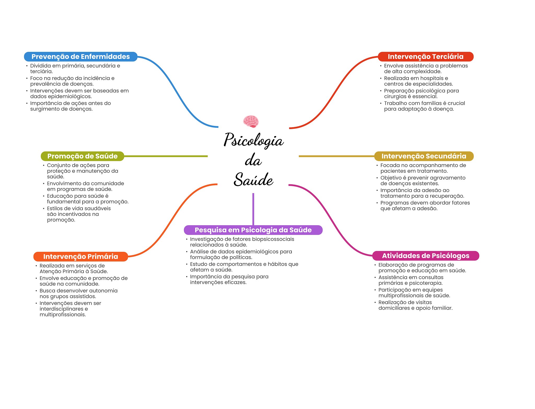Prevenção de Enfermidades Intervenção Terciária Dividida em primária, secundária e Envolve assistência a problemas terciária. de alta complexidade. Foco na redução da incidência e Realizada em hospitais e prevalência de doenças. centros de especialidades. Intervenções devem ser baseadas em Preparação psicológica para dados epidemiológicos. cirurgias é essencial. Importância de ações antes do Trabalho com famílias é crucial surgimento de doenças. para adaptação à doença. Psicologia Promoção de Saúde da Intervenção Secundária Conjunto de ações para Focada no acompanhamento de proteção e manutenção da pacientes em tratamento. saúde. Saúde Objetivo é prevenir agravamento Envolvimento da comunidade de doenças existentes. em programas de saúde. Importância da adesão ao Educação para saúde é tratamento para a recuperação. fundamental para a promoção. Programas devem abordar fatores Estilos de vida saudáveis que afetam a adesão. são incentivados na promoção. Pesquisa em Psicologia da Saúde Investigação de fatores biopsicossociais relacionados à saúde. Análise de dados epidemiológicos para Intervenção Primária formulação de políticas. Atividades de Psicólogos Realizada em serviços de Estudo de comportamentos e hábitos que Elaboração de programas de Atenção Primária à Saúde. afetam a saúde. promoção e educação em saúde. Envolve educação e promoção de Importância da pesquisa para Assistência em consultas saúde na comunidade. intervenções eficazes. primárias e psicoterapia. Busca desenvolver autonomia Participação em equipes nos grupos assistidos. multiprofissionais de saúde. Intervenções devem ser Realização de visitas interdisciplinares e domiciliares e apoio familiar. multiprofissionais.