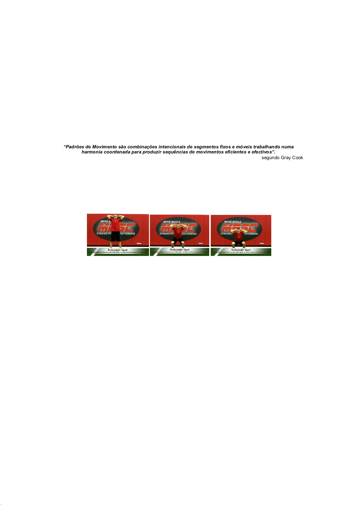 CIRCUITOS DE FORÇA FUNCIONAL Princípios para desenvolvimento da FORÇA através de PADRÕES DE MOVIMENTO Este não é na realidade um artigo totalmente original, mas sim uma recolha de informações de vários autores, principalmente, do preparador físico Gray Cook, do treinador Mike Boyle e fundamentalmente da investigação e aplicação, na prática, dos princípios do treino funcional em modalidades colectivas. Padrão motor é um termo cada vez mais corrente em artigos de profissionais que ganharam notoriedade com o avanço do treino funcional. Padrões são grupos de movimentos simples armazenados no cérebro, como pequenos pedaços de informação. Um padrão representa muitos movimentos individuais usados juntos para uma determinada função, como os elos interconectados de uma corrente. O armazenamento dentro do cérebro dessas sequências de informações ou padrões reduz o tempo de processamento e cria eficiência, como um computador que armazena arquivos com conteúdo parecido dentro de uma mesma pasta, para facilitar e agilizar o acesso aos dados. Movimentos fundamentais ficam armazenados em padrões básicos, assim como os movimentos que são reproduzidos com frequência. “Padrões de Movimento são combinações intencionais de segmentos fixos e móveis trabalhando numa harmonia coordenada para produzir sequências de movimentos eficientes e efectivos”. segundo Gray Cook. Padrões e sequências de movimentos são o modo preferencial de operacionalização dos organismos vivos. Segundo o fisiologista Arthur C. Guyton, autor do “Tratado de Fisiologia Médica” : “A excitação de um único neurónio do córtex motor geralmente visa excitar um movimento específico, e não um músculo específico”. Se analisarmos o movimento abaixo, com base na cinesiologia básica, poderíamos dizer que o individuo está basicamente executando uma dorsiflexão/flexão plantar de tornozelo, uma flexão/extensão do joelho e uma flexão/extensão do quadril, porém, o conjunto destas acções constitui o padrão de movimento do agachamento. Citando Mike Boyle: “O todo é maior do que a soma das partes”. A ciência diz-nos que o cérebro não reconhece actividades individuais dos músculos. Ao invés o nosso cérebro procura os padrões motores, ou padrões de movimento, criando a coordenação necessária entre todos os músculos envolvidos. Esta coordenação é vulgarmente designada por programa motor. A maioria das actividades no desporto usa padrões de movimento básicos similares. Vou aproveitar um exemplo dado pelo Gray Cook: “Arremessar uma bola de basebol, o serviço no ténis e o serviço no Voleibol dependem de alguns dos mesmos programas motores básicos de mudança de peso corporal de um pé a outro, e rotação do corpo, para desenvolver uma velocidade rotacional nos quadris e nos ombros para acelerar o braço”. O cérebro não precisa de se lembrar de milhões de actividades isoladas porque muitas delas se sobrepõem ou estão inter-relacionadas. Isto poupa espaço de memória e permite um acesso mais rápido e fácil à informação do movimento. ENTÃO POR QUE TREINAMOS OS MÚSCULOS DE UMA FORMA ISOLADA? O desenvolvimento de músculos isolados não desempenha um grande papel no desenvolvimento de padrões motores, pelo contrário, o desenvolvimento de diferentes padrões de movimento fará com que os músculos se desenvolvam naturalmente. Explicitando melhor o desenvolvimento da função fará com que haja um desenvolvimento da forma. O que observamos na maioria dos casos é uma busca frenética pela forma que não resulta em desenvolvimento da função. Um exemplo evidente e facilmente observável é o facto de os jogadores que treinam de uma forma mais tradicional quando fazem o movimento equivalente ao agachamento na prensa com o máximo da carga das máquinas e a seguir lhes pedimos que efectuem um agachamento completo apoiado numa perna sem qualquer carga e não conseguem sequer executar o afundo completo, quanto mais subir. O jogador tem força mas não tem estabilidade, mobilidade e controlo motor para a aplicar na totalidade. Isto, inevitavelmente resulta em departamentos médicos cheios de atletas e jogadores lesionados e frustrados por não conseguirem ver-se livres dos seus problemas, com o consequente aumento substancial dos custos inerentes, sem resultados efectivos no longo prazo e um rendimento desportivo muito incerto e inconstante. Uma das principais razões apontadas para trabalharmos a força desta forma reside no facto de termos “ido beber” aos atletas que na altura treinavam força, assim, treinamos como treinam os levantadores de pesos, os halterofilistas e os culturistas. As outras duas razões apontadas são o factor tempo, o treino funcional (unilateral e unipodal) exige mais tempo que o treino tradicional (bilateral) e por ultimo é a tão referenciada e mal equacionada questão da segurança, esta exigência existe essencialmente pelo facto do treino tradicional fazer a utilização de cargas muito elevadas em cima de estruturas debilitadas, desequilibradas, poucos estáveis e limitadas em termos de mobilidade, o que implica por questões de “segurança” a utilização preferencial de movimentos guiados muito padronizados e monoarticulares. Deste modo, ficamos a perder na funcionalidade e na possibilidade de aplicar força de uma forma dinâmica e efectiva, aumentado os riscos de lesões na prática da modalidade. Efectivamente, na prática o que importa não é taxa de produção força que Mobile User manifesto, mas sim quanta dessa força consigo aplicar com efectividade nas habilidades de jogo. Mas isto é algo que por si só justifica um artigo. PASSEMOS A ASPECTOS MAIS OPERACIONAIS - COMO DESENVOLVER FORÇA USANDO PADRÕES DE MOVIMENTO Antes de nos referirmos aos exemplos de como desenvolver força usando padrões de movimento e não exercícios para “partes do corpo ou músculos isolados”, é obrigatório lem