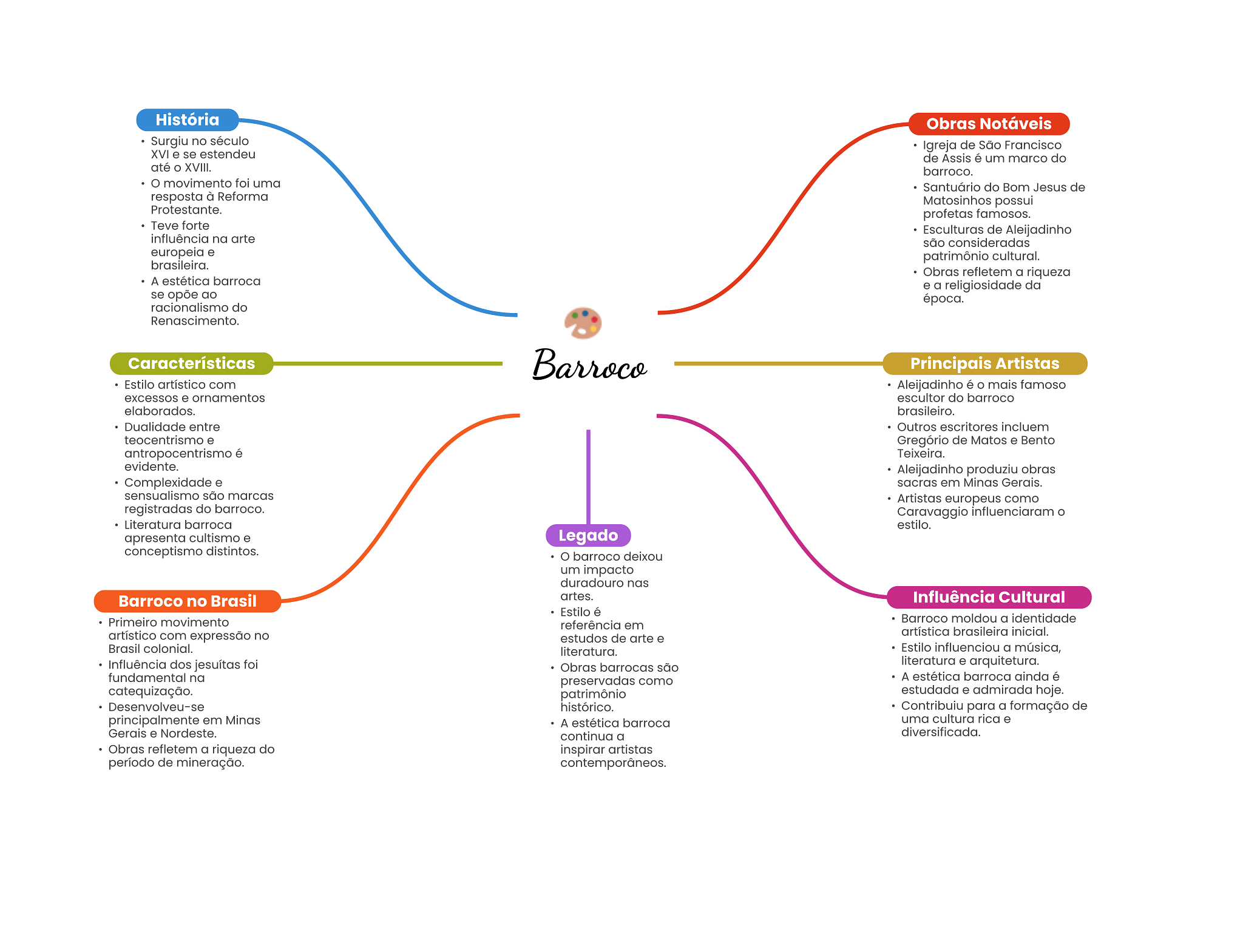 História Obras Notáveis Surgiu no século Igreja de São Francisco XVI e se estendeu de Assis é um marco do até XVIII. barroco. movimento foi uma Santuário do Bom Jesus de resposta à Reforma Matosinhos possui Protestante. profetas famosos. Teve forte Esculturas de Aleijadinho influência na arte são consideradas europeia e patrimônio cultural. brasileira. Obras refletem a riqueza A estética barroca e a religiosidade da se opõe ao época. racionalismo do Renascimento. Características Barroco Principais Artistas Estilo artístico com Aleijadinho é mais famoso excessos e ornamentos escultor do barroco elaborados. brasileiro. Dualidade entre Outros escritores incluem teocentrismo e Gregório de Matos e Bento antropocentrismo é Teixeira. evidente. Aleijadinho produziu obras Complexidade e sacras em Minas Gerais. sensualismo são marcas Artistas europeus como registradas do barroco. Caravaggio influenciaram O Literatura barroca estilo. apresenta cultismo e Legado conceptismo distintos. barroco deixou um impacto duradouro nas Barroco no Brasil artes. Influência Cultural Estilo é Primeiro movimento Barroco moldou a identidade referência em artístico com expressão no artística brasileira inicial. estudos de arte e Brasil colonial. literatura. Estilo influenciou a música, Influência dos jesuítas foi Obras barrocas são literatura e arquitetura. fundamental na preservadas como A estética barroca ainda é catequização. patrimônio estudada e admirada hoje. Desenvolveu-se histórico. Contribuiu para a formação de principalmente em Minas A estética barroca uma cultura rica e Gerais e Nordeste. continua a diversificada. Obras refletem a riqueza do inspirar artistas período de mineração. contemporâneos.