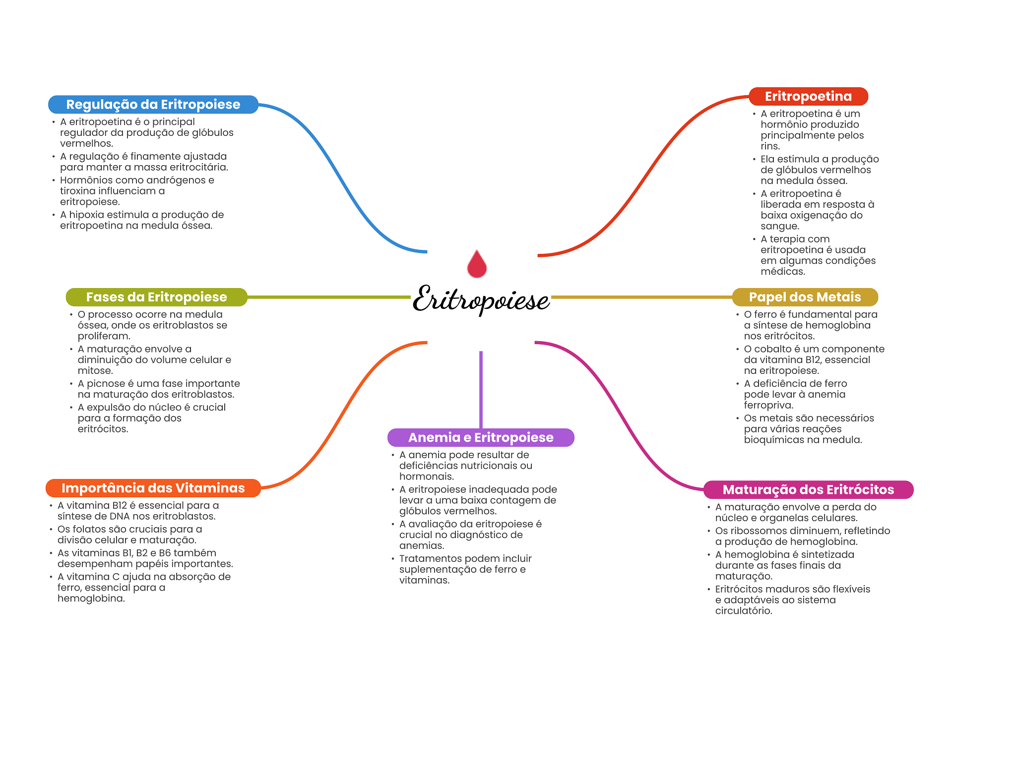 Eritropoetina Regulação da Eritropoiese A eritropoetina é um A eritropoetina é principal hormônio produzido regulador da produção de glóbulos principalmente pelos vermelhos. rins. A regulação é finamente ajustada Ela estimula a produção para manter a massa eritrocitária. de glóbulos vermelhos Hormônios como andrógenos e na medula óssea. tiroxina influenciam a A eritropoetina é eritropoiese. liberada em resposta à A hipoxia estimula a produção de baixa oxigenação do eritropoetina na medula óssea. sangue. A terapia com eritropoetina é usada em algumas condições médicas. Fases da Eritropoiese Eritropoiese Papel dos Metais processo ocorre na medula ferro é fundamental para óssea, onde eritroblastos se a síntese de hemoglobina proliferam. nos eritrócitos. A maturação envolve a cobalto é um componente diminuição do volume celular e da vitamina B12, essencial mitose. na eritropoiese. A picnose é uma fase importante A deficiência de ferro na maturação dos eritroblastos. pode levar à anemia A expulsão do núcleo é crucial ferropriva. para a formação dos Os metais são necessários eritrócitos. para várias reações Anemia e Eritropoiese bioquímicas na medula. A anemia pode resultar de deficiências nutricionais ou hormonais. Importância das Vitaminas A eritropoiese inadequada pode Maturação dos Eritrócitos A vitamina B12 é essencial para a levar a uma baixa contagem de de DNA nos eritroblastos. glóbulos vermelhos. A maturação envolve a perda do núcleo e organelas celulares. Os folatos são cruciais para a A avaliação da eritropoiese é crucial no diagnóstico de Os ribossomos diminuem, refletindo divisão celular e maturação. anemias. a produção de hemoglobina. As vitaminas B1, B2 e B6 também desempenham papéis importantes. Tratamentos podem incluir A hemoglobina é sintetizada suplementação de ferro e durante as fases finais da A vitamina ajuda na absorção de vitaminas. maturação. ferro, essencial para a Eritrócitos maduros são flexíveis hemoglobina. e adaptáveis ao sistema circulatório.