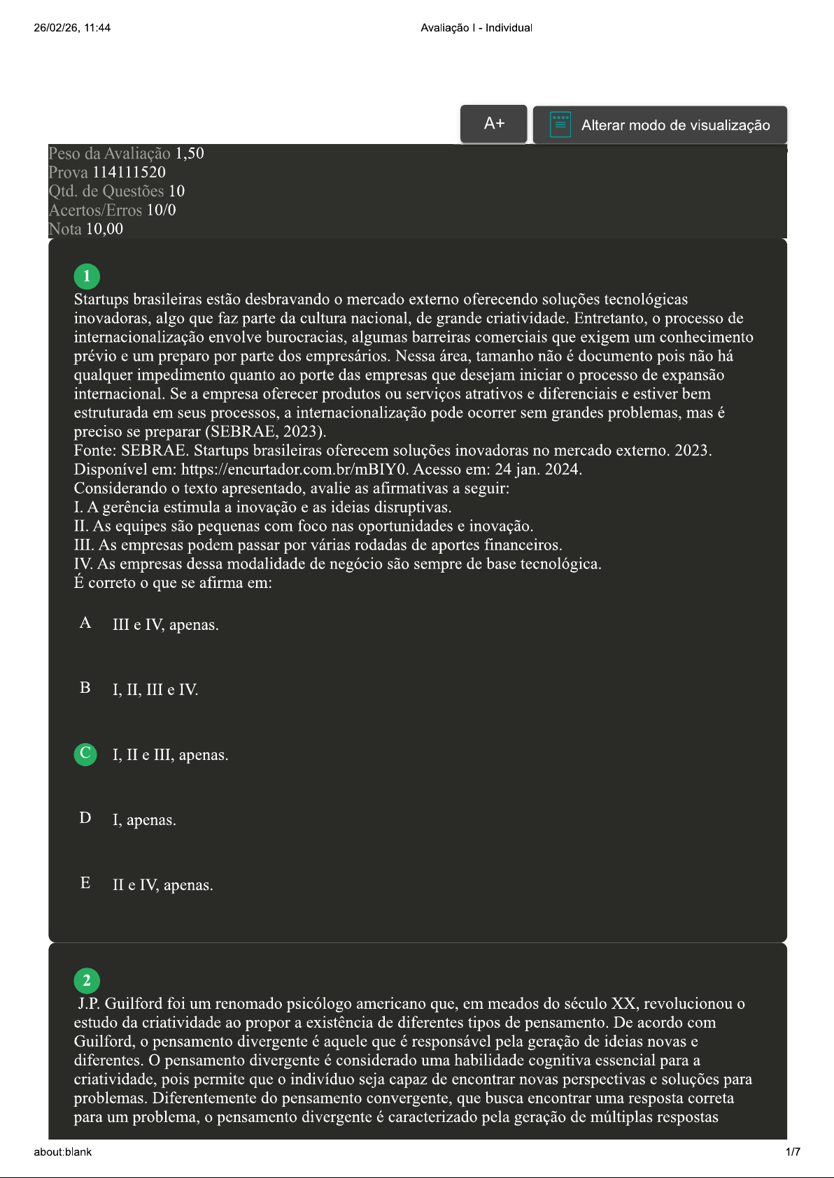 26/02/26, 11:44 Avaliação Individual A+ Alterar modo de visualização Peso da Avaliação 1,50 Prova 114111520 Qtd. de Questões 10 Acertos/Erros 10/0 Nota 10,00 1 Startups brasileiras estão desbravando o mercado externo oferecendo soluções tecnológicas inovadoras, algo que faz parte da cultura nacional, de grande criatividade. Entretanto, o processo de internacionalização envolve burocracias, algumas barreiras comerciais que exigem um conhecimento prévio e um preparo por parte dos empresários. Nessa área, tamanho não é documento pois não há qualquer impedimento quanto ao porte das empresas que desejam iniciar o processo de expansão internacional. Se a empresa oferecer produtos ou serviços atrativos e diferenciais e estiver bem estruturada em seus processos, a internacionalização pode ocorrer sem grandes problemas, mas é preciso se preparar (SEBRAE, 2023). Fonte: SEBRAE. Startups brasileiras oferecem soluções inovadoras no mercado externo. 2023. Disponível em: https://encurtador.com.br/mBIY0. Acesso em: 24 jan. 2024. Considerando o texto apresentado, avalie as afirmativas a seguir: I. A gerência estimula a inovação e as ideias disruptivas. II. As equipes são pequenas com foco nas oportunidades e inovação. III. As empresas podem passar por várias rodadas de aportes financeiros. IV. As empresas dessa modalidade de negócio são sempre de base tecnológica. É correto o que se afirma em: A III e IV, apenas. I, II, III e IV. I, II e III, apenas. D I, apenas. E II e IV, apenas. 2 J.P. Guilford foi um renomado psicólogo americano que, em meados do século XX, revolucionou o estudo da criatividade ao propor a existência de diferentes tipos de pensamento. De acordo com Guilford, o pensamento divergente é aquele que é responsável pela geração de ideias novas e diferentes. pensamento divergente é considerado uma habilidade cognitiva essencial para a criatividade, pois permite que o indivíduo seja capaz de encontrar novas perspectivas e soluções para problemas. Diferentemente do pensamento convergente, que busca encontrar uma resposta correta para um problema, o pensamento divergente é caracterizado pela geração de múltiplas respostas about:blank 1/726/02/26, 11:44 Avaliação Individual possíveis, que podem ser originais e surpreendentes. Segundo Guilford, a criatividade é um processo que envolve a combinação de diferentes habilidades cognitivas, incluindo o pensamento divergente. Além disso, ele propôs que a criatividade é um traço de personalidade que pode ser desenvolvido por meio de treinamento e prática. Essa teoria contribuiu para mudar o entendimento de que a criatividade era um dom inato e não podia ser ensinada (GUILFORD, 1967). Fonte: adaptado de: GUILFORD, J. The Nature of Human Intelligence. New York: McGraw-Hill, 1967. Considerando o texto exposto, sobre o empreendedorismo, a criatividade e o principal responsável pela geração de ideias criativas, analise as afirmativas a seguir: I. seguimento de um único meio de resolução para o problema. II. A criatividade inata de alguns indivíduos e a ausência do tempo para criação. III. pensamento divergente, integrado ao uso de metodologias como o design thinking. É correto o que se afirma em: A II e III, apenas. I, apenas. III, apenas. D I e II, apenas. E I, II e III. 3 A criatividade é um fator crucial para o sucesso das empresas nos dias de hoje. Com o aumento da competitividade e a constante mudança no mercado, as empresas precisam ser inovadoras e encontrar soluções criativas para se destacarem. Nesse sentido, a criatividade pode ser utilizada como uma ferramenta estratégica para gerar novos produtos e serviços, melhorar processos e aumentar a eficiência e eficácia organizacional. A inovação é um dos principais resultados da criatividade nas empresas. Através da criatividade, as empresas podem desenvolver novos produtos e serviços, melhorar os existentes e criar novas formas de atender às necessidades dos clientes. A inovação também pode ser aplicada nos processos organizacionais, gerando maior eficiência e redução de custos. Outro benefício da criatividade nas empresas é a capacidade de solucionar problemas de forma criativa e eficiente. A criatividade pode ser utilizada para encontrar soluções inovadoras para problemas complexos, gerando resultados positivos e impactantes para a empresa (CATMULL; WALLACE, 2014; 2019; BONO, 1992). Fonte: adaptado de: CATMULL, E.; WALLACE, Criatividade S.A.: como a Pixar faz suas ideias se tornarem reais. Rio de Janeiro: Intrínseca, 2014. Fonte: adaptado de: CATMULL, E.; WALLACE, Poder da Criatividade. Rio de Janeiro: Intrínseca, 2019. Fonte: adaptado de: BONO, E. Pensamento Lateral: manual de criatividade. São Paulo: Papirus, 1992. Considerando o texto exposto e os benefícios da criatividade nas empresas, avalie as afirmativas a seguir: I. Reduzir a competitividade no mercado e dificultar a inovação. II. Diferenciar a empresa no mercado e aumentar a sua visibilidade e reputação. III. Aumentar a burocracia, reduzir a eficiência organizacional, sistematizar processos. about:blank 2/726/02/26, 11:44 Avaliação Individual IV. Fomentar a capacidade para analisar e resolver problemas complexos para facilitar a tomada de decisões. É correto o que se afirma em: A III e IV, apenas. B II e IV, apenas. I, apenas. D I, II e III, apenas. E I, II, III e IV. 4 objetivo primordial de qualquer organização é maximizar o retorno sobre o capital investido, utilizando ferramentas disponíveis para se destacar entre os concorrentes, conquistando maiores margens e participações de mercado. No entanto, com as transformações de natureza global, além dos fatores econômicos e estruturais, surgem novas responsabilidades para as empresas, relacionadas às questões ambientais e sociais. Para contribuir com a sustentabilidade, as organizações devem ajustar seus processos produtivos, quando necessário, para tornarem-se ecol