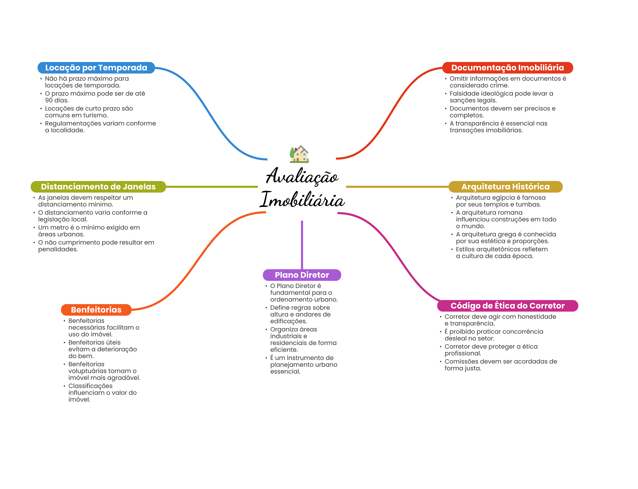 Locação por Temporada Documentação Imobiliária Não há prazo máximo para Omitir informações em documentos é locações de temporada. considerado crime. prazo máximo pode ser de até Falsidade ideológica pode levar a 90 dias. sanções legais. Locações de curto prazo são Documentos devem ser precisos e comuns em turismo. completos. Regulamentações variam conforme A transparência é essencial nas a localidade. transações imobiliárias. Avaliação Distanciamento de Janelas Arquitetura Histórica As janelas devem respeitar um Imobiliária Arquitetura egípcia é famosa distanciamento mínimo. por seus templos e tumbas. distanciamento varia conforme a A arquitetura romana legislação local. influenciou construções em todo Um metro é mínimo exigido em mundo. áreas urbanas. A arquitetura grega é conhecida não cumprimento pode resultar em por sua estética e proporções. penalidades. Estilos arquitetônicos refletem a cultura de cada época. Plano Diretor Plano Diretor é fundamental para ordenamento urbano. Benfeitorias Define regras sobre Código de Ética do Corretor altura e andares de Corretor deve agir com honestidade Benfeitorias edificações. necessárias facilitam e transparência. Organiza áreas uso do imóvel. É proibido praticar concorrência industriais e desleal no setor. Benfeitorias úteis residenciais de forma evitam a deterioração eficiente. Corretor deve proteger a ética do bem. profissional. É um instrumento de Benfeitorias Comissões devem ser acordadas de planejamento urbano voluptuárias tornam essencial. forma justa. imóvel mais agradável. Classificações influenciam valor do imóvel.