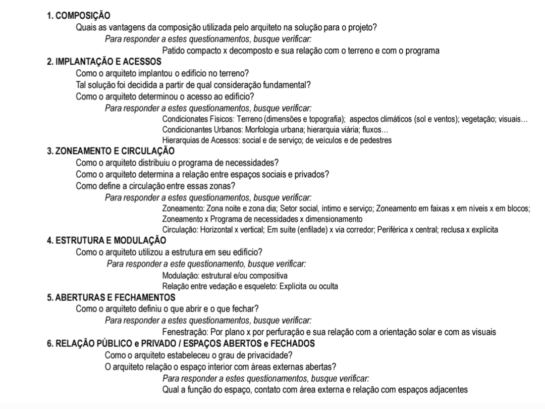 1. COMPOSIÇÃO Quais as vantagens da composição utilizada pelo arquiteto na solução para 0 projeto? Para responder a estes questionamentos, busque verificar: Patido compacto X decomposto e sua relação com terreno e com programa 2. IMPLANTAÇÃO E ACESSOS Como 0 arquiteto implantou 0 edifício no terreno? Tal solução foi decidida a partir de qual consideração fundamental? Como 0 arquiteto determinou acesso ao edificio? Para responder a estes questionamentos, busque verificar: Condicionates Físicos: Terreno (dimensões e topografia); aspectos climáticos (sol e ventos); vegetação; visuais... Condicionantes Urbanos: Morfologia urbana; hierarquia viária; fluxos... Hierarquias de Acessos: social e de serviço; de e de pedestres 3. ZONEAMENTO E CIRCULAÇÃO Como 0 arquiteto distribuiu 0 programa de necessidades? Como 0 arquiteto determina a relação entre espaços sociais e privados? Como define a circulação entre essas zonas? Para responder a estes questionamentos, busque verificar: Zoneamento: Zona noite e zona dia; Setor social, intimo e serviço; Zoneamento em faixas X em niveis X em blocos; Zoneamento X Programa de necessidades X dimensionamento Circulação: Horizontal X vertical; Em suite (enfilade) X via corredor; Periférica X central; reclusa X 4. ESTRUTURA E MODULAÇÃO Como 0 arquiteto utilizou a estrutura em seu edificio? Para responder a este questionamento, busque verificar: Modulação: estrutural e/ou compositiva Relação entre vedação e esqueleto: Explicita ou oculta 5. ABERTURAS E FECHAMENTOS Como 0 arquiteto definiu que abrir e que fechar? Para responder a estes questionamentos, busque verificar: Fenestração: Por plano X por perfuração e sua relação com a orientação solar e com as visuais 6. RELAÇÃO PÚBLICO e PRIVADO ESPAÇOS ABERTOS e FECHADOS Como 0 arquiteto estabeleceu grau de privacidade? 0 arquiteto relação 0 espaço interior com áreas externas abertas? Para responder a estes questionamentos, busque verificar: Qual a função do espaço, contato com área externa e relação com espaços adjacentes