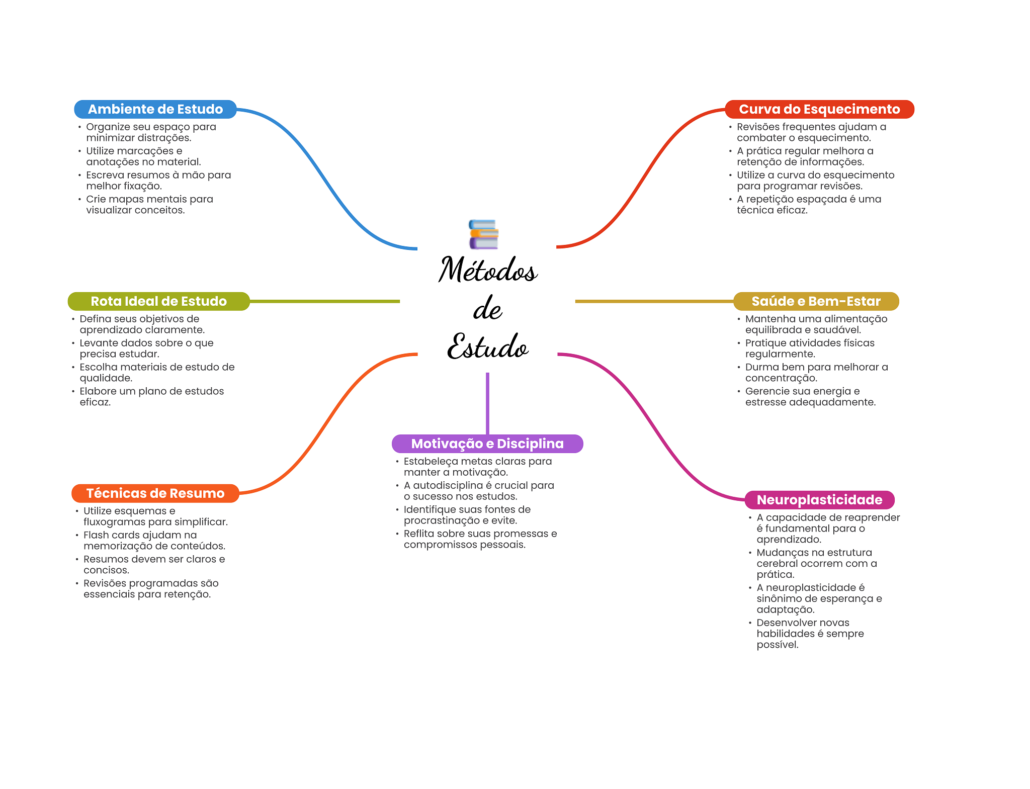 Ambiente de Estudo Curva do Esquecimento Organize seu espaço para Revisões frequentes ajudam a minimizar distrações. combater esquecimento. Utilize marcações e A prática regular melhora a anotações no material. retenção de informações. Escreva resumos à mão para Utilize a curva do esquecimento melhor fixação. para programar revisões. Crie mapas mentais para A repetição espaçada é uma visualizar conceitos. técnica eficaz. Métodos Rota Ideal de Estudo de Saúde e Bem-Estar Defina seus objetivos de Mantenha uma alimentação aprendizado claramente. equilibrada e saudável. Levante dados sobre O que Estudo Pratique atividades físicas precisa estudar. regularmente. Escolha materiais de estudo de Durma bem para melhorar a qualidade. concentração. Elabore um plano de estudos Gerencie sua energia e eficaz. estresse adequadamente. Motivação e Disciplina Estabeleça metas claras para manter a motivação. A autodisciplina é crucial para Técnicas de Resumo O sucesso nos estudos. Neuroplasticidade Utilize esquemas e Identifique suas fontes de fluxogramas para simplificar. procrastinação e evite. A capacidade de reaprender Flash cards ajudam na Reflita sobre suas promessas e é fundamental para memorização de conteúdos. compromissos pessoais. aprendizado. Mudanças na estrutura Resumos devem ser claros e cerebral ocorrem com a concisos. prática. Revisões programadas são A neuroplasticidade é essenciais para retenção. sinônimo de esperança e adaptação. Desenvolver novas habilidades é sempre possível.
