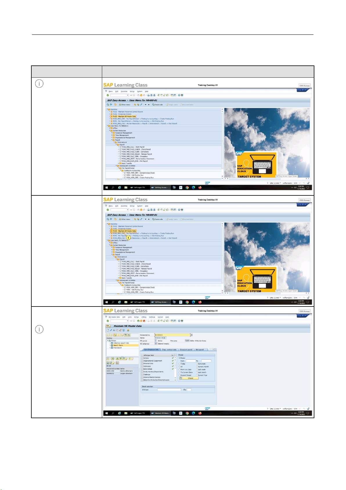 How to perform prerequisites for posting run 1 How to perform prerequisites for posting run Explanation Screenshot This is a demo on how to process a posting run for payments. To make sure that the Master Datas are correct, take a closer look into the system. Select transaction code PA30. 1. Double-click on PA30 - Maintain HR Master Data. This is the master data of Viktor Krum. It is important to make sure that the bank details of Viktor Krum are correct. Select Bank Details. How to perform prerequisites for posting run 2 Explanation Screenshot 2. Select the Infotype Text, Bank Details. 3. Choose Display. Now, it’s time to check which payroll area is assigned to Viktor Krum. How to perform prerequisites for posting run 3 Explanation Screenshot 4. Choose Back to navigate back to the Maintain HR Master Data screen. 5. Select the Infotype Text, Organizational Assignment. 6. Choose Display. How to perform prerequisites for posting run 4 Explanation Screenshot Check if the Viktor Krum is working in payroll area X9 or not. 7. Choose Back to navigate back to the Maintain HR Master Data screen. 8. Choose Back to navigate back to the SAP Easy Access screen. How to perform prerequisites for posting run 5 Explanation Screenshot Next step is to make sure that Viktor’s payroll run is processed. 9. Double-click on PA03 - Maintain Personnel Control Record. Take a closer look into the payroll area of Viktor Krum X9. How to perform prerequisites for posting run 6 Explanation Screenshot 10. Choose Change. You can see that you have exited Viktor’s payroll run. The payroll has been run successfully for the payroll period of 01 in 2022. 11. Choose Back to navigate back to the SAP Easy Access screen. How to perform prerequisites for posting run 7 Explanation Screenshot These are all prerequisites before processing a posting run for payments. You have now performed prerequisition for a posting run.
