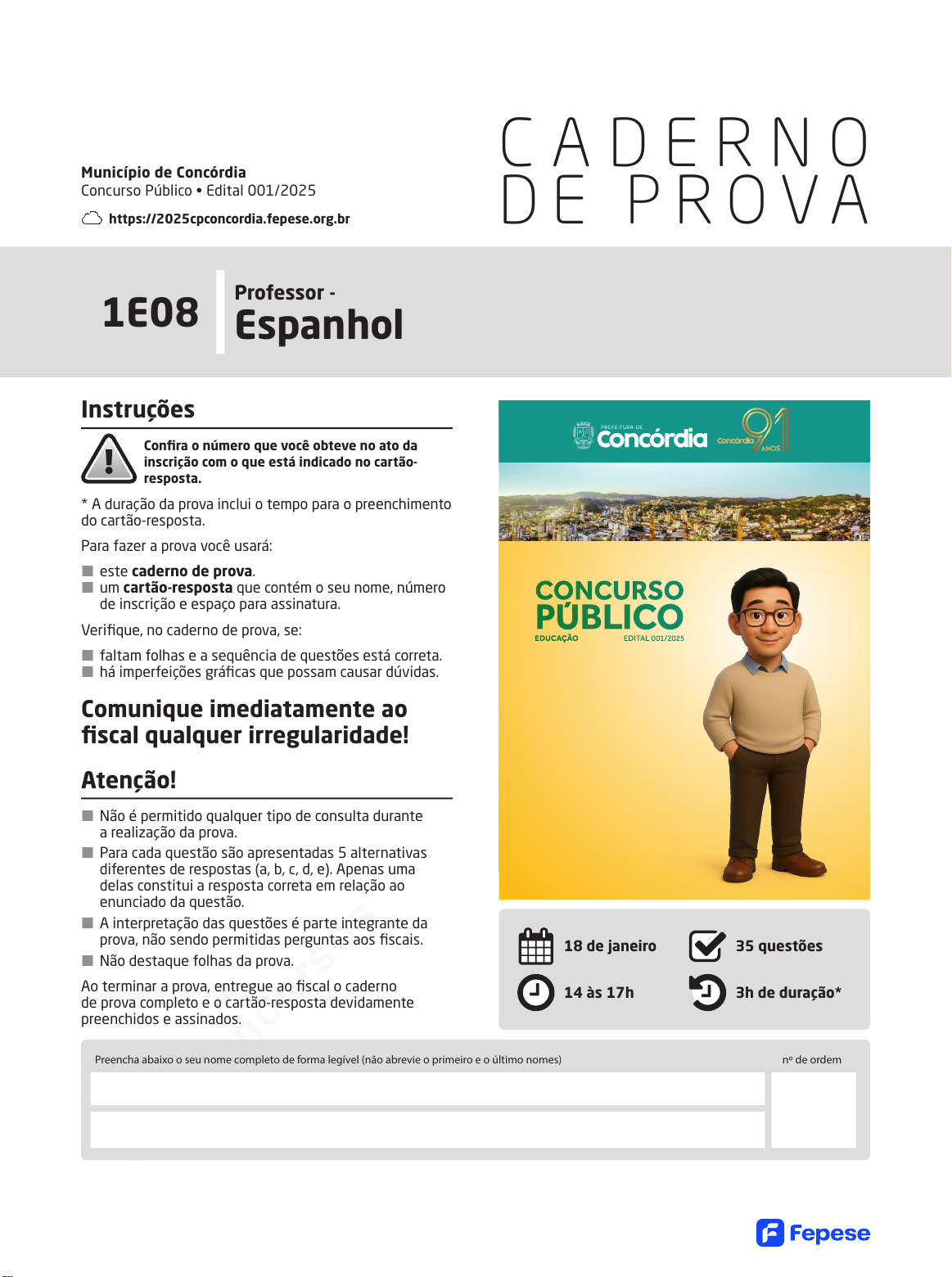 pcimarkpci MDAwMDowMDAwOjAwMDA6MDAwMDowMDAwOmZmZmY6YjE4ODpiMzFh:VGh1LCAyNiBGZWIgMjAyNiAxNTozNjo0NiAtMDMwMA== www.pciconcursos.com.br C A D E R N O D E P R O V A Município de Concórdia Concurso Público • Edital 001/2025 https://2025cpconcordia.fepese.org.br 1E08 Professor - Espanhol 18 de janeiro 14 às 17h 35 questões 3h de duração* Preencha abaixo o seu nome completo de forma legível (não abrevie o primeiro e o último nomes) nº de ordem Instruções Confira o número que você obteve no ato da inscrição com o que está indicado no cartão- resposta. * A duração da prova inclui o tempo para o preenchimento do cartão-resposta. Para fazer a prova você usará: � este caderno de prova. � um cartão-resposta que contém o seu nome, número de inscrição e espaço para assinatura. Verifique, no caderno de prova, se: � faltam folhas e a sequência de questões está correta. � há imperfeições gráficas que possam causar dúvidas. Comunique imediatamente ao fiscal qualquer irregularidade! Atenção! � Não é permitido qualquer tipo de consulta durante a realização da prova. � Para cada questão são apresentadas 5 alternativas diferentes de respostas (a, b, c, d, e). Apenas uma delas constitui a resposta correta em relação ao enunciado da questão. � A interpretação das questões é parte integrante da prova, não sendo permitidas perguntas aos fiscais. � Não destaque folhas da prova. Ao terminar a prova, entregue ao fiscal o caderno de prova completo e o cartão-resposta devidamente preenchidos e assinados. pcimarkpci MDAwMDowMDAwOjAwMDA6MDAwMDowMDAwOmZmZmY6YjE4ODpiMzFh:VGh1LCAyNiBGZWIgMjAyNiAxNTozNjo0NiAtMDMwMA== www.pciconcursos.com.br . Observações Para prestar a Prova Escrita com questões objetivas, o candidato receberá um caderno de questões e um cartão-resposta, sendo responsável pela confe- rência dos dados impressos no seu cartão-resposta, pela verificação da cor- respondência do seu caderno de prova com o cartão-resposta e pela trans- crição correta das letras correspondentes às respostas que julgar corretas. A existência de qualquer irregularidade no caderno de questões e/ou no car- tão-resposta deve ser comunicada imediatamente ao Fiscal de Sala. A Coor- denação do certame envidará todos os esforços para a rápida substituição dos materiais com defeito. Na impossibilidade da substituição do caderno de provas, o fiscal de sala fará a leitura correta do item impresso com incorreção ou o copiará para que todos anotem. O tempo gasto para a substituição ou correção dos materiais será acrescido ao tempo de duração da prova. O candidato deverá marcar suas respostas no cartão-resposta utilizando caneta esferográfica feita de material transparente, de tinta azul ou preta, seguindo as instruções nele contidas. As provas serão corrigidas exclusivamente com base nas marcações do car- tão-resposta, sendo desconsideradas quaisquer anotações realizadas no caderno de questões. O caderno de provas não será disponibilizado ao candidato e será descar- tado após o término do período recursal. O preenchimento do cartão-resposta é de inteira responsabilidade do candi- dato, que deverá proceder em conformidade com as instruções específicas contidas no Edital e no cartão que não será substituído por erro do candidato. Ao terminar a prova ou no horário determinado para o seu encerramento, o candidato entregará o cartão-resposta devidamente assinado e o caderno de questões. Os três últimos candidatos que restarem na sala de prova só poderão entregar as provas simultaneamente. pcimarkpci MDAwMDowMDAwOjAwMDA6MDAwMDowMDAwOmZmZmY6YjE4ODpiMzFh:VGh1LCAyNiBGZWIgMjAyNiAxNTozNjo0NiAtMDMwMA== www.pciconcursos.com.br Página 3 Município de Concórdia • Concurso Público • Edital 001/2025 1E08 Professor - Espanhol Língua Portuguesa 10 questões Leia a crônica de Rubem Braga. MAR A primeira vez que eu vi o mar eu não estava sozinho. Estava no meio de um bando enorme de meninos. Nós tínhamos viajado para ver o mar. No meio de nós havia apenas um menino que já o tinha visto. Ele nos contava que havia três espécies de mar: o mar mesmo, a maré, que é menor que o mar, e a marola, que é menor que a maré. Logo a gente fazia ideia de um lago enorme e duas lagoas. Mas o menino explicava que não. O mar entrava pela maré e a maré entrava pela marola. A marola vinha e voltava. A maré enchia e vazava. O mar às vezes tinha espuma e às vezes não tinha. Isso perturbava ainda mais a imagem. Três lagoas mexendo, esvaziando e enchendo, com uns rios no meio, às vezes uma porção de espumas, tudo isso muito salgado, azul, com ventos. Fomos ver o mar. Era de manhã, fazia sol. De repente houve um grito: o mar! Era qualquer coisa de largo, de inesperado. Estava bem verde perto da terra, e mais longe estava azul. Nós todos gritamos, numa gritaria infernal, e saímos correndo para o lado do mar. As ondas batiam nas pedras e jogavam espuma que bri- lhava ao sol. Ondas grandes, cheias, que explodiam com barulho. Ficamos ali parados, com a respiração apressada, vendo o mar… Depois o mar entrou na minha infância e tomou conta de uma adolescência toda, com seu cheiro bom, os seus ventos, suas chuvas, seus peixes, seu barulho, sua grande e espantosa beleza. Um menino de calças curtas, pernas queimadas pelo sol, cabelos cheios de sal, chapéu de palha. Um menino que pescava e que passava horas e horas dentro da canoa, longe da terra, atrás de uma bobagem qualquer – como aquela caravela de franjas azuis que boiava e afundava e que, afinal, queimou sua mão… Um rapaz de 14 ou 15 anos que nas noites de lua cheia, quando a maré baixa e descobre tudo e a praia é imensa, ia na praia sentar numa canoa, entrar numa roda, amar perdidamente, eternamente, alguém que passava pelo areal branco e dava boa noite… Que andava longas horas pela praia infinita para catar conchas e búzios crespos e conver- sa