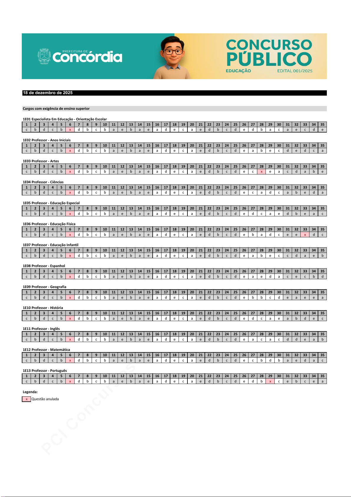 pcimarkpci MDAwMDowMDAwOjAwMDA6MDAwMDowMDAwOmZmZmY6YjE4ODpiMzFh:VGh1LCAyNiBGZWIgMjAyNiAxNTozNjo1MCAtMDMwMA== www.pciconcursos.com.br 18 de dezembro de 2025 Cargos com exigência de ensino superior 1E01 Especialista Em Educação - Orientação Escolar 1 2 3 4 5 6 7 8 9 10 11 12 13 14 15 16 17 18 19 20 21 22 23 24 25 26 27 28 29 30 31 32 33 34 35 c b d c b x d b c b a e b a e a d e c a e d b c d e d b a c a e c d e 1E02 Professor - Anos Iniciais 1 2 3 4 5 6 7 8 9 10 11 12 13 14 15 16 17 18 19 20 21 22 23 24 25 26 27 28 29 30 31 32 33 34 35 c b d c b x d b c b a e b a e a d e c a e d b c d e a b e c d e d c a 1E03 Professor - Artes 1 2 3 4 5 6 7 8 9 10 11 12 13 14 15 16 17 18 19 20 21 22 23 24 25 26 27 28 29 30 31 32 33 34 35 c b d c b x d b c b a e b a e a d e c a e d b c d e c x e a c d a b e 1E04 Professor - Ciências 1 2 3 4 5 6 7 8 9 10 11 12 13 14 15 16 17 18 19 20 21 22 23 24 25 26 27 28 29 30 31 32 33 34 35 c b d c b x d b c b a e b a e a d e c a e d b c d e c a d c a b e d a 1E05 Professor - Educação Especial 1 2 3 4 5 6 7 8 9 10 11 12 13 14 15 16 17 18 19 20 21 22 23 24 25 26 27 28 29 30 31 32 33 34 35 c b d c b x d b c b a e b a e a d e c a e d b c d e d c a e d b e a c 1E06 Professor - Educação Física 1 2 3 4 5 6 7 8 9 10 11 12 13 14 15 16 17 18 19 20 21 22 23 24 25 26 27 28 29 30 31 32 33 34 35 c b d c b x d b c b a e b a e a d e c a e d b c d e b a d c e e x d c 1E07 Professor - Educação Infantil 1 2 3 4 5 6 7 8 9 10 11 12 13 14 15 16 17 18 19 20 21 22 23 24 25 26 27 28 29 30 31 32 33 34 35 c b d c b x d b c b a e b a e a d e c a e d b c d e a b e c c d a e b 1E08 Professor - Espanhol 1 2 3 4 5 6 7 8 9 10 11 12 13 14 15 16 17 18 19 20 21 22 23 24 25 26 27 28 29 30 31 32 33 34 35 c b d c b x d b c b a e b a e a d e c a e d b c d e a e d a c e c b d 1E09 Professor - Geografia 1 2 3 4 5 6 7 8 9 10 11 12 13 14 15 16 17 18 19 20 21 22 23 24 25 26 27 28 29 30 31 32 33 34 35 c b d c b x d b c b a e b a e a d e c a e d b c d e b b c d e a e e a 1E10 Professor - História 1 2 3 4 5 6 7 8 9 10 11 12 13 14 15 16 17 18 19 20 21 22 23 24 25 26 27 28 29 30 31 32 33 34 35 c b d c b x d b c b a e b a e a d e c a e d b c d e d c a e a b d e c 1E11 Professor - Inglês 1 2 3 4 5 6 7 8 9 10 11 12 13 14 15 16 17 18 19 20 21 22 23 24 25 26 27 28 29 30 31 32 33 34 35 c b d c b x d b c b a e b a e a d e c a e d b c d e a c a c d d e a b 1E12 Professor - Matemática 1 2 3 4 5 6 7 8 9 10 11 12 13 14 15 16 17 18 19 20 21 22 23 24 25 26 27 28 29 30 31 32 33 34 35 c b d c b x d b c b a e b a e a d e c a e d b c d e c b d b a e d a c 1E13 Professor - Português 1 2 3 4 5 6 7 8 9 10 11 12 13 14 15 16 17 18 19 20 21 22 23 24 25 26 27 28 29 30 31 32 33 34 35 c b d c b x d b c b a e b a e a d e c a e d b c d e d b x c e b c e a Legenda: x Questão anulada
