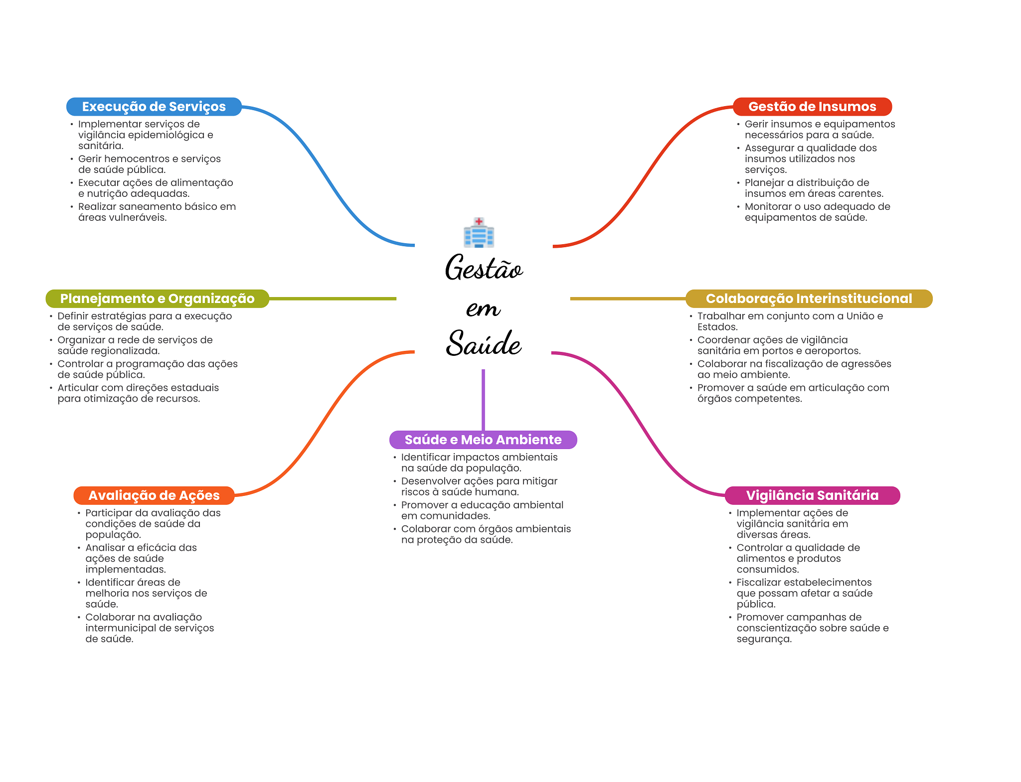 Execução de Serviços Gestão de Insumos Implementar serviços de Gerir insumos e equipamentos vigilância epidemiológica e necessários para a saúde. sanitária. Assegurar a qualidade dos Gerir hemocentros e serviços insumos utilizados nos de saúde pública. serviços. Executar ações de alimentação Planejar a distribuição de e nutrição adequadas. insumos em áreas carentes. Realizar saneamento básico em Monitorar uso adequado de áreas vulneráveis. equipamentos de saúde. Gestão Planejamento e Organização Colaboração Interinstitucional em Definir estratégias para a execução Trabalhar em conjunto com a União e de serviços de saúde. Estados. Organizar a rede de serviços de saúde regionalizada. Saúde Coordenar ações de vigilância sanitária em portos e aeroportos. Controlar a programação das ações Colaborar na fiscalização de agressões de saúde pública. ao meio ambiente. Articular com direções estaduais Promover a saúde em articulação com para otimização de recursos. órgãos competentes. Saúde e Meio Ambiente Identificar impactos ambientais na saúde da população. Desenvolver ações para mitigar Avaliação de Ações riscos à saúde humana. Vigilância Sanitária Promover a educação ambiental Participar da avaliação das em comunidades. Implementar ações de condições de saúde da Colaborar com órgãos ambientais vigilância sanitária em população. diversas áreas. na proteção da saúde. Analisar a eficácia das Controlar a qualidade de ações de saúde alimentos e produtos implementadas. consumidos. Identificar áreas de Fiscalizar estabelecimentos melhoria nos serviços de que possam afetar a saúde saúde. pública. Colaborar na avaliação Promover campanhas de intermunicipal de serviços conscientização sobre saúde e de saúde. segurança.