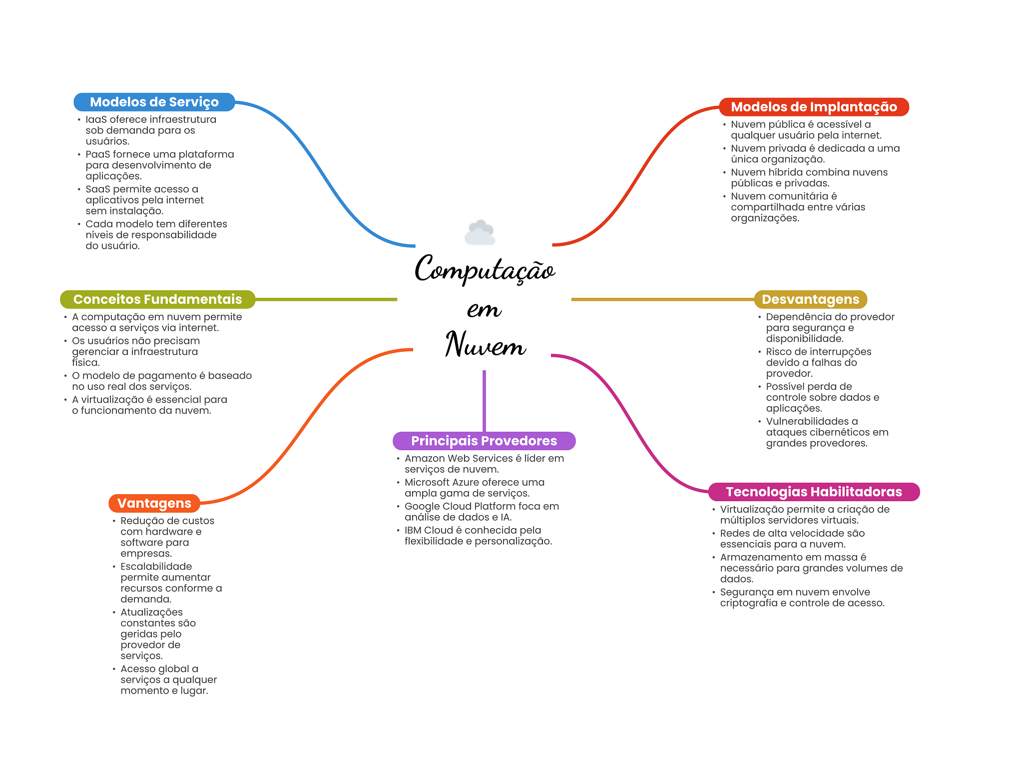 Modelos de Serviço Modelos de Implantação laas oferece infraestrutura Nuvem pública é acessível a sob demanda para usuários. qualquer usuário pela internet. Nuvem privada é dedicada a uma fornece uma plataforma única organização. para desenvolvimento de aplicações. Nuvem híbrida combina nuvens públicas e privadas. permite acesso a aplicativos pela internet Nuvem comunitária é sem instalação. compartilhada entre várias Cada modelo tem diferentes organizações. níveis de responsabilidade do usuário. Computação Conceitos Fundamentais Desvantagens em A computação em nuvem permite Dependência do provedor acesso a serviços via internet. para segurança e Os usuários não precisam Nuvem disponibilidade. gerenciar a infraestrutura Risco de interrupções física. devido a falhas do modelo de pagamento é baseado provedor. no uso real dos serviços. Possível perda de A virtualização é essencial para controle sobre dados e funcionamento da nuvem. aplicações. Vulnerabilidades a ataques cibernéticos em Principais Provedores grandes provedores. Amazon Web Services é líder em serviços de nuvem. Microsoft Azure oferece uma ampla gama de serviços. Tecnologias Habilitadoras Vantagens Google Cloud Platform foca em Virtualização permite a criação de Redução de custos análise de dados e IA. múltiplos servidores virtuais. com hardware e IBM Cloud é conhecida pela Redes de alta velocidade são software para flexibilidade e personalização. essenciais para a nuvem. empresas. Armazenamento em massa é Escalabilidade necessário para grandes volumes de permite aumentar dados. recursos conforme a Segurança em nuvem envolve demanda. criptografia e controle de acesso. Atualizações constantes são geridas pelo provedor de serviços. Acesso global a serviços a qualquer momento e lugar.