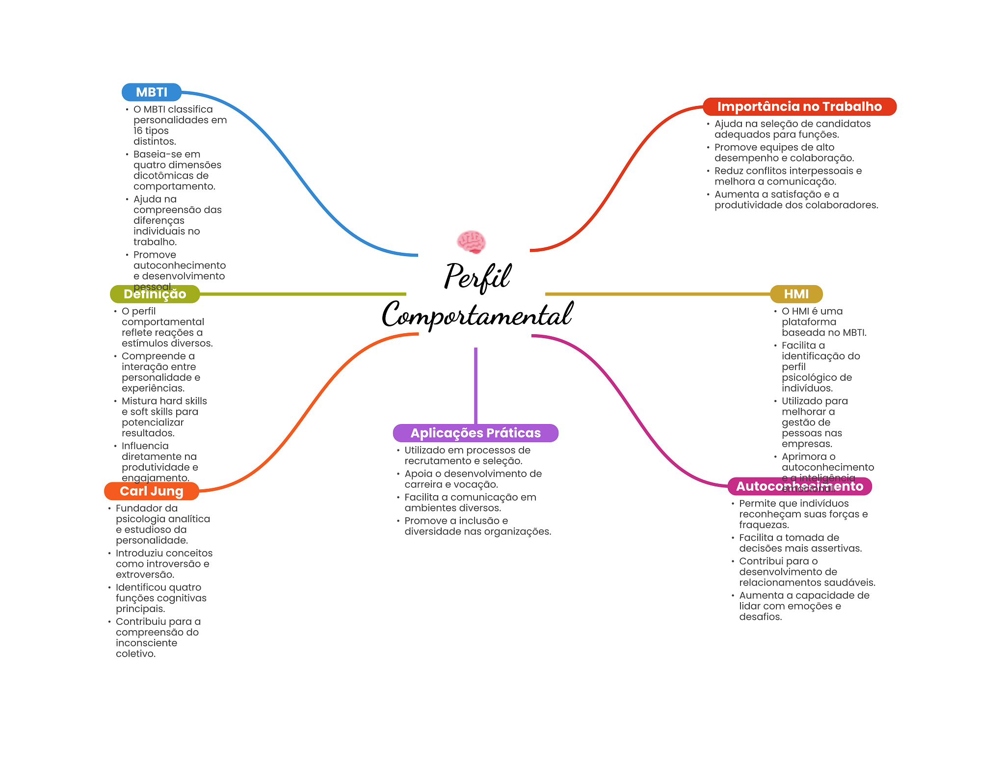 MBTI MBTI classifica Importância no Trabalho personalidades em Ajuda na seleção de candidatos 16 tipos adequados para funções. distintos. Promove de alto Baseia-se em desempenho e colaboração. quatro dimensões dicotômicas de Reduz conflitos interpessoais e comportamento. melhora a comunicação. Ajuda na Aumenta a satisfação e a compreensão das produtividade dos colaboradores. diferenças individuais no trabalho. Promove autoconhecimento e desenvolvimento pessoal. Perfil Definição HMI perfil Comportamental HMI é uma comportamental plataforma reflete reações a baseada no MBTI. estímulos diversos. Facilita a Compreende a identificação do interação entre perfil personalidade e psicológico de experiências. indivíduos. Mistura hard skills Utilizado para e soft skills para melhorar a potencializar gestão de resultados. Aplicações Práticas pessoas nas Influencia empresas. Utilizado em processos de diretamente na recrutamento e seleção. Aprimora produtividade e autoconhecimento engajamento. Apoia O desenvolvimento de carreira e vocação. Carl Jung Facilita a comunicação em Fundador da ambientes diversos. Permite que indivíduos psicologia analítica reconheçam suas forças e Promove a inclusão e e estudioso da fraquezas. diversidade nas organizações. personalidade. Facilita a tomada de Introduziu conceitos decisões mais assertivas. como introversão e Contribui para extroversão. desenvolvimento de relacionamentos saudáveis. Identificou quatro funções cognitivas Aumenta a capacidade de principais. lidar com emoções e desafios. Contribuiu para a compreensão do inconsciente coletivo.