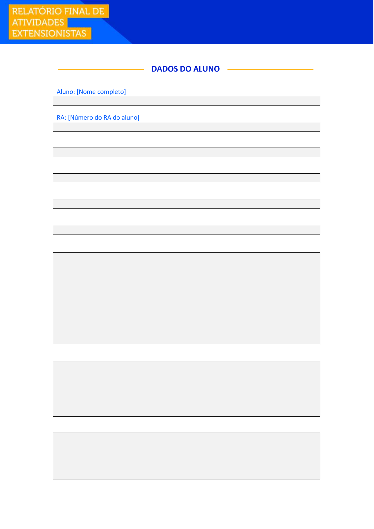 1 DADOS DO ALUNO: Aluno: [Nome completo] RA: [Número do RA do aluno] POLO / UNIDADE: CURSO: CIÊNCIAS ECONÔMICAS - BACHARELADO COMPONENTE CURRICULAR: PROJETO DE EXTENSÃO I - CIÊNCIAS ECONÔMICAS PROGRAMA DE EXTENSÃO: PROGRAMA DE CONTEXTO À COMUNIDADE. FINALIDADE E MOTIVAÇÃO: A busca para contribuir com resolução de problemas presentes no contexto por meio das atividades extensionistas do curso de Ciências Econômicas vinculadas pelo Programa de Contexto à Comunidade podem proporcionar o estretamento do relacionamento do saber universitário com a comunidade, , por meio das contribuições na resolução de problemas sociais presentes no contexto, e, ainda, desenvolver competências profissionais e de cidadania e soft skills específicas no corpo discente do curso. As ações poderão ser realizadas em diferentes locais, dependendo do problema identificado, sendo essas algumas das possibilidades: Associação de Bairro, Prefeitura, ONG, Igreja, Escola, Micro e Pequena Empresa, Banco, Cooperativa de Crédito. COMPETÊNCIAS: I - Analisar e interpretar a conjuntura econômica e política global e seus impactos sobre a realidade econômica brasileira; II - Analisar e interpretar bases teóricas e contextos históricos, bem como condicionantes estruturais das transformações socioeconômicas; III - Analisar as inter-relações entre as dimensões local, regional e global dos fenômenos econômicos. PERFIL DO EGRESSO: A IES busca que o egresso do curso de Ciências Econômicas seja um profissional que tenha como pressupostos essenciais um perfil generalista, crítico, reflexivo, propositivo, humanístico e dinâmico, para atuar como Economista com sólida formação teórica, histórica e técnica, de caráter abrangente e multidisciplinar, para a compreensão e a solução de problemas concretos, sendo que pelas atividades ARLENO Caixa de texto ADQUIRA EM NOSSO SITE ESTE PROJETO https://www.flasheducacional.com/ Whatsapp (91)988309316 2 extensionistas vinculadas ao Programa de Extensão Contexto à Comunidade, esse egresso poderá desenvolver habilidades e capacidade para conduzir atividades referentes à compreensão da realidade social, cultural e econômica do meio em que está inserido, direcionando suas ações para a transformação da realidade e para o desenvolvimento social e da qualidade de vida. SOFT SKILLS (COMPETÊNCIAS SOCIOEMOCIONAIS): Flexibilidade e adaptação Inteligência Emocional Aprendizado Ativo OBJETIVOS DE APRENDIZAGEM: O principal objetivo das atividades extensionistas do curso de Ciências Econômicas, vinculadas ao Programa de Contexto à Comunidade, é o novo saber gerado pela aplicação do conhecimento adquirido no curso que ocorre durante a busca da contribuição à resolução de problemas contextuais à sociedade, e, ainda, ao desenvolvimento social e da melhoria da qualidade de vida, dessa forma, oportunizando que o corpo discente realize ações a partir de sua aprendizagem multidisciplinar adquirida no curso. CONTEÚDOS: I - Macroeconomia e Microeconomia; II - Economia brasileira contemporânea; III - Desenvolvimento socioeconômico; IV - Sociedade e direitos humanos. INDICAÇÕES BIBLIOGRÁFICAS: BOECHAT, Andréia Moreira da Fonseca. Economia brasileira contemporânea. Londrina : Editora e Distribuidora Educacional S.A., 2016. CIZOTO, Sonelise Auxiliadora. Homem, cultura e sociedade. Londrina: Editora e Distribuidora Educacional S.A., 2016. DOMINGUES JÚNIOR, Juradir et al. Economia. Londrina: Editora e Distribuidora Educacional S.A., 2014. LEITTE, Ademir Cavalheiro. Teorias do desenvolvimento econômico. Londrina: Editora e Distribuidora Educacional S.A., 2017. MASCARO, Laura Degaspare Monte. Direitos humanos e cidadania. Londrina: Editora e Distribuidora Educacional S.A., 2017. RELATÓRIO FINAL: Aluno e Aluna, após realizar suas atividades de extensão, é necessário que você o formalize, enviando esse Relatório Final para ser avaliado junto ao seu Ambiente Virtual (AVA) e também para você poder comprovar sua atuação. Para o preenchimento, busque as anotações junto ao TEMPLATE PCDA para auxiliar na apresentação das atividades desenvolvidas. 3 Todos os campos são de preenchimento obrigatório! DESCRIÇÃO DA AÇÃO COM RESULTADOS ALCANÇADOS Metas dos Objetivos de Desenvolvimento Sustentável (ODS) aderentes a este projeto: CAMPO OBRIGATÓRIO – busque no seu Template PDCA quais Metas você selecionou como aderentes ao seu projeto, conforme cada Objetivo de Desenvolvimento Sustentável (ODS) da Organização das Nações Unidas (ONU) que você explorou no seu planejamento. Liste as Metas selecionadas (pelo menos uma opção): Local de realização da atividade extensionista: Durante a ação: Caso necessário, houve mudança de estratégia para alcançar o resultado: Resultado da ação: Conclusão: Depoimentos (se houver): RELATE SUA PERCEPÇÃO DAS AÇÕES EXTENSIONISTAS REALIZADAS NO PROGRAMA DESENVOLVIDO: CAMPO OBRIGATÓRIO – relate em no mínimo 15 (quinze) linhas sua experiência com as ações extensionistas. O texto deve ser de sua autoria e inédito, evite plágio. Questões norteadoras: (1) Você notou que suas habilidades profissionais foram aprimoradas, com a atuação nas ações extensionistas? (2) Você identificou melhoria/resolução do problema identificado? (3) Você conseguiu articular os conhecimentos adquiridos no curso com as ações extensionistas? Ao escrever seu texto evite deixá-lo em forma de respostas as questões norteadoras, relate sua experiência em forma de texto dissertativo com justificativas. DEPOIMENTO DA INSTITUIÇÃO PARTICIPANTE 4 CAMPO OBRIGATÓRIO - insira depoimento(s) do(s) gestor(es) da instituição/órgão/associação participante que contribuam como um feedback da ação realizada por você. REFERÊNCIAS BIBLIOGRÁFICAS CAMPO OBRIGATÓRIO – Siga a normas ABNT, para isso consulte sua Biblioteca Virtual; Utilize como referências bibliográficas as indicações do Campo: Ind
