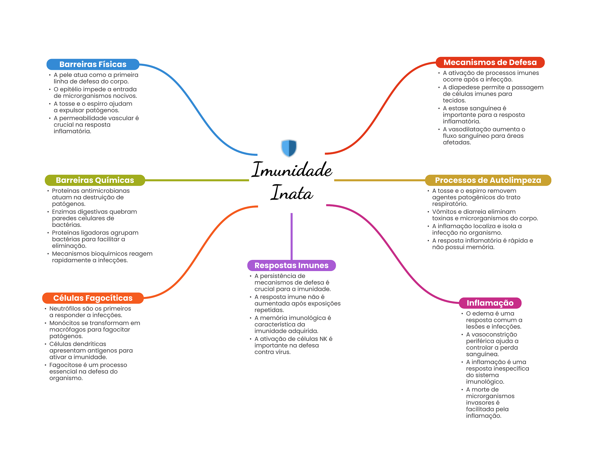 Barreiras Físicas Mecanismos de Defesa A pele atua como a primeira A ativação de processos imunes linha de defesa do corpo. ocorre após a infecção. epitélio impede a entrada A diapedese permite a passagem de microrganismos nocivos. de células imunes para tecidos. A tosse e espirro ajudam a expulsar patógenos. A estase sanguínea é A permeabilidade vascular é importante para a resposta inflamatória. crucial na resposta inflamatória. A vasodilatação aumenta fluxo sanguíneo para áreas afetadas. Imunidade Barreiras Químicas Processos de Autolimpeza Proteínas antimicrobianas Inata A tosse e O espirro removem atuam na destruição de agentes patogênicos do trato patógenos. respiratório. Enzimas digestivas quebram Vômitos e diarreia eliminam paredes celulares de toxinas e microrganismos do corpo. bactérias. A inflamação localiza e isola a Proteínas ligadoras agrupam infecção no organismo. bactérias para facilitar a A resposta inflamatória é rápida e eliminação. não possui memória. Mecanismos bioquímicos reagem rapidamente a infecções. Respostas Imunes A persistência de mecanismos de defesa é crucial para a imunidade. Células Fagocíticas A resposta imune não é aumentada após exposições Inflamação Neutrófilos são os primeiros repetidas. a responder a infecções. edema é uma A memória imunológica é Monócitos se transformam em resposta comum a característica da macrófagos para fagocitar lesões e infecções. imunidade adquirida. patógenos. A vasoconstrição A ativação de células NK é Células dendríticas periférica ajuda a importante na defesa apresentam antígenos para controlar a perda contra vírus. ativar a imunidade. sanguínea. Fagocitose é um processo A inflamação é uma essencial na defesa do resposta inespecífica do sistema organismo. imunológico. A morte de microrganismos invasores é facilitada pela inflamação.