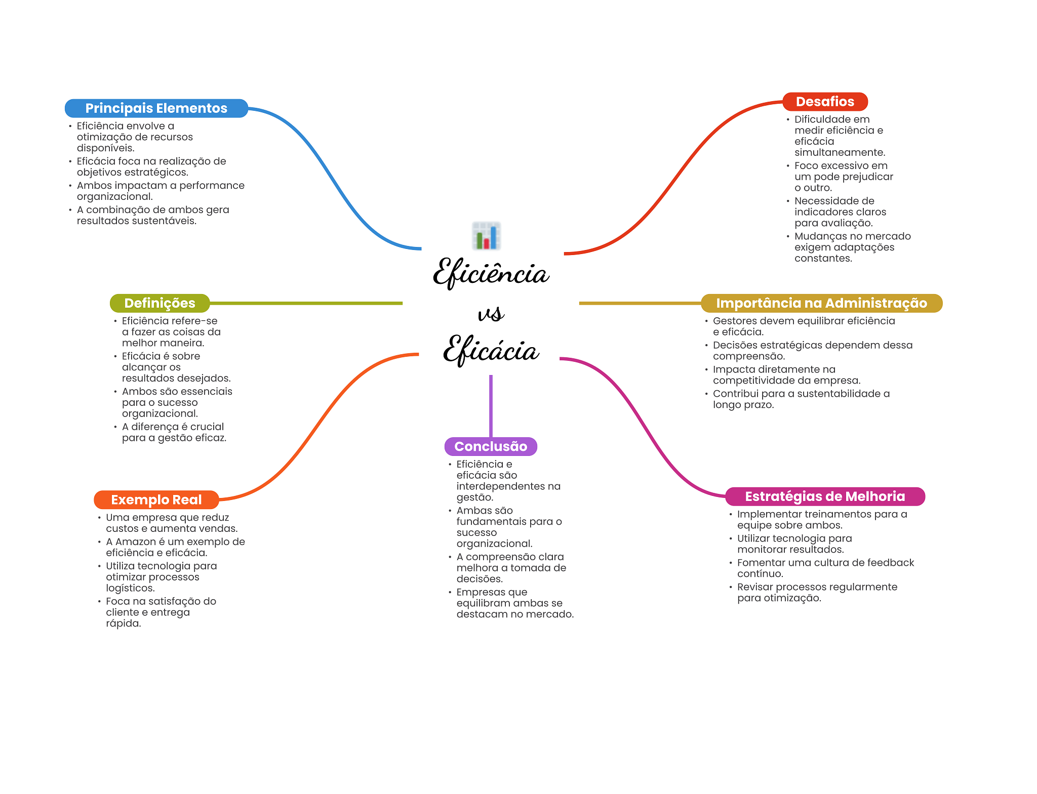 Desafios Principais Elementos Dificuldade em Eficiência envolve a medir eficiência e otimização de recursos eficácia disponíveis. simultaneamente. Eficácia foca na realização de Foco excessivo em objetivos estratégicos. um prejudicar Ambos impactam a performance outro. organizacional. Necessidade de A combinação de ambos gera indicadores claros resultados sustentáveis. para avaliação. Mudanças no mercado exigem adaptações constantes. Eficiência Definições Importância na Administração Eficiência refere-se us Gestores devem equilibrar eficiência a fazer as coisas da e eficácia. melhor maneira. Eficácia é sobre Eficácia Decisões estratégicas dependem dessa compreensão. alcançar OS Impacta diretamente na resultados desejados. competitividade da empresa. Ambos são essenciais Contribui para a sustentabilidade a para O sucesso longo prazo. organizacional. A diferença é crucial para a gestão eficaz. Conclusão Eficiência e eficácia são interdependentes na Exemplo Real gestão. Estratégias de Melhoria Ambas são Uma empresa que reduz Implementar treinamentos para a fundamentais para O custos e aumenta vendas. equipe sobre ambos. sucesso A Amazon é um exemplo de organizacional. Utilizar tecnologia para eficiência e eficácia. monitorar resultados. A compreensão clara Utiliza tecnologia para Fomentar uma cultura de feedback melhora a tomada de otimizar processos contínuo. decisões. logísticos. Empresas que Revisar processos regularmente Foca na satisfação do equilibram ambas se para otimização. cliente e entrega destacam no mercado. rápida.