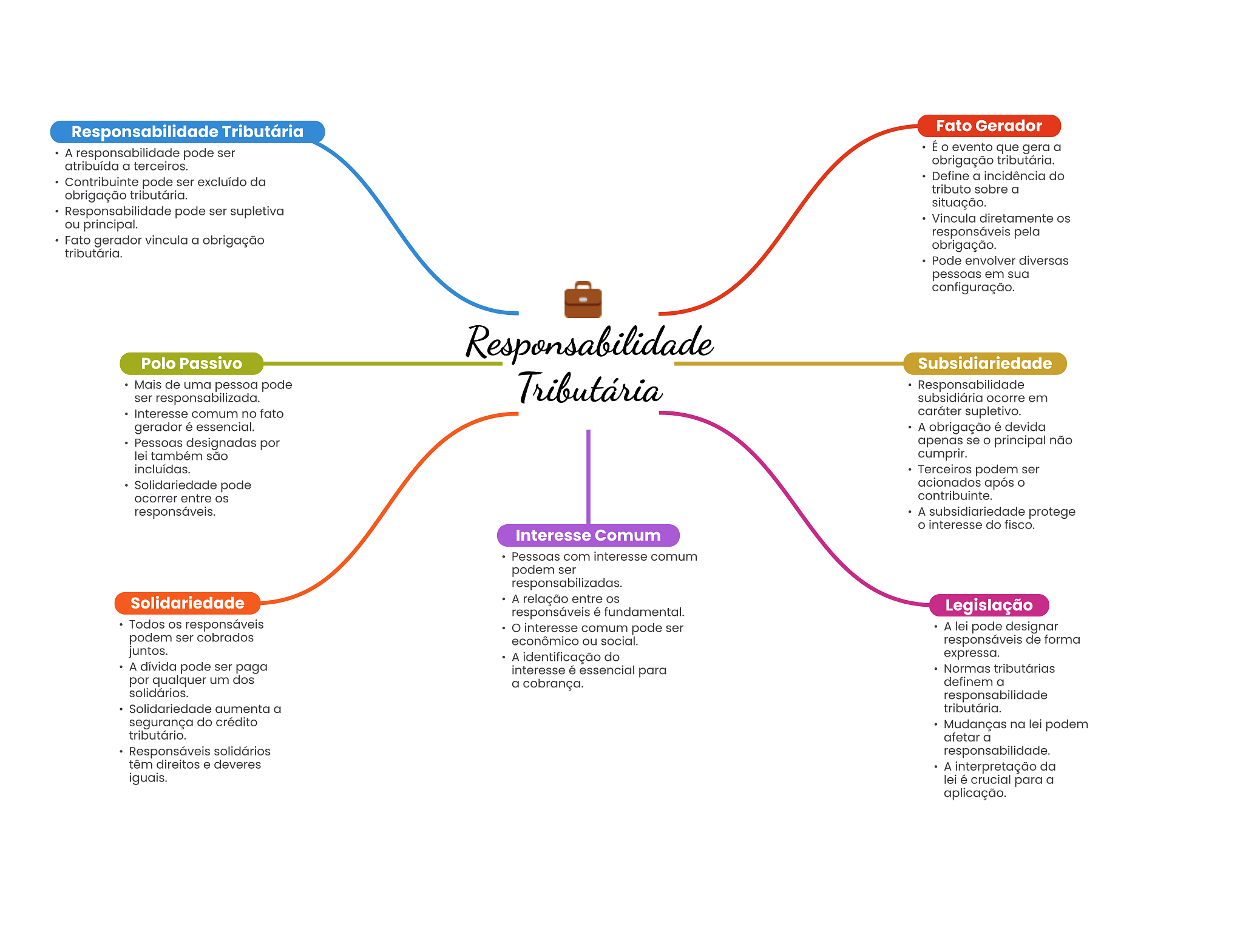 Responsabilidade Tributária Fato Gerador A responsabilidade pode ser É evento que gera a atribuída a terceiros. obrigação tributária. Define a incidência do Contribuinte pode ser excluído da tributo sobre a obrigação tributária. situação. Responsabilidade pode ser supletiva Vincula diretamente ou principal. responsáveis pela Fato gerador vincula a obrigação obrigação. tributária. Pode envolver diversas pessoas em sua configuração. Responsabilidade Polo Passivo Subsidiariedade Mais de uma pessoa pode ser responsabilizada. Tributária Responsabilidade subsidiária ocorre em Interesse comum no fato caráter supletivo. gerador é essencial. A obrigação é devida Pessoas designadas por apenas se O principal não lei também são cumprir. incluídas. Terceiros podem ser Solidariedade pode acionados após ocorrer entre contribuinte. responsáveis. A subsidiariedade protege interesse do fisco. Interesse Comum Pessoas com interesse comum podem ser responsabilizadas. Solidariedade A relação entre OS responsáveis é fundamental. Legislação Todos responsáveis interesse comum pode ser A lei pode designar podem ser cobrados econômico ou social. responsáveis de forma juntos. A identificação do expressa. A dívida pode ser paga interesse é essencial para Normas tributárias por qualquer um dos a cobrança. definem a solidários. responsabilidade Solidariedade aumenta a tributária. segurança do crédito Mudanças na lei podem tributário. afetar a Responsáveis solidários responsabilidade. têm direitos e deveres A interpretação da iguais. lei é crucial para a aplicação.
