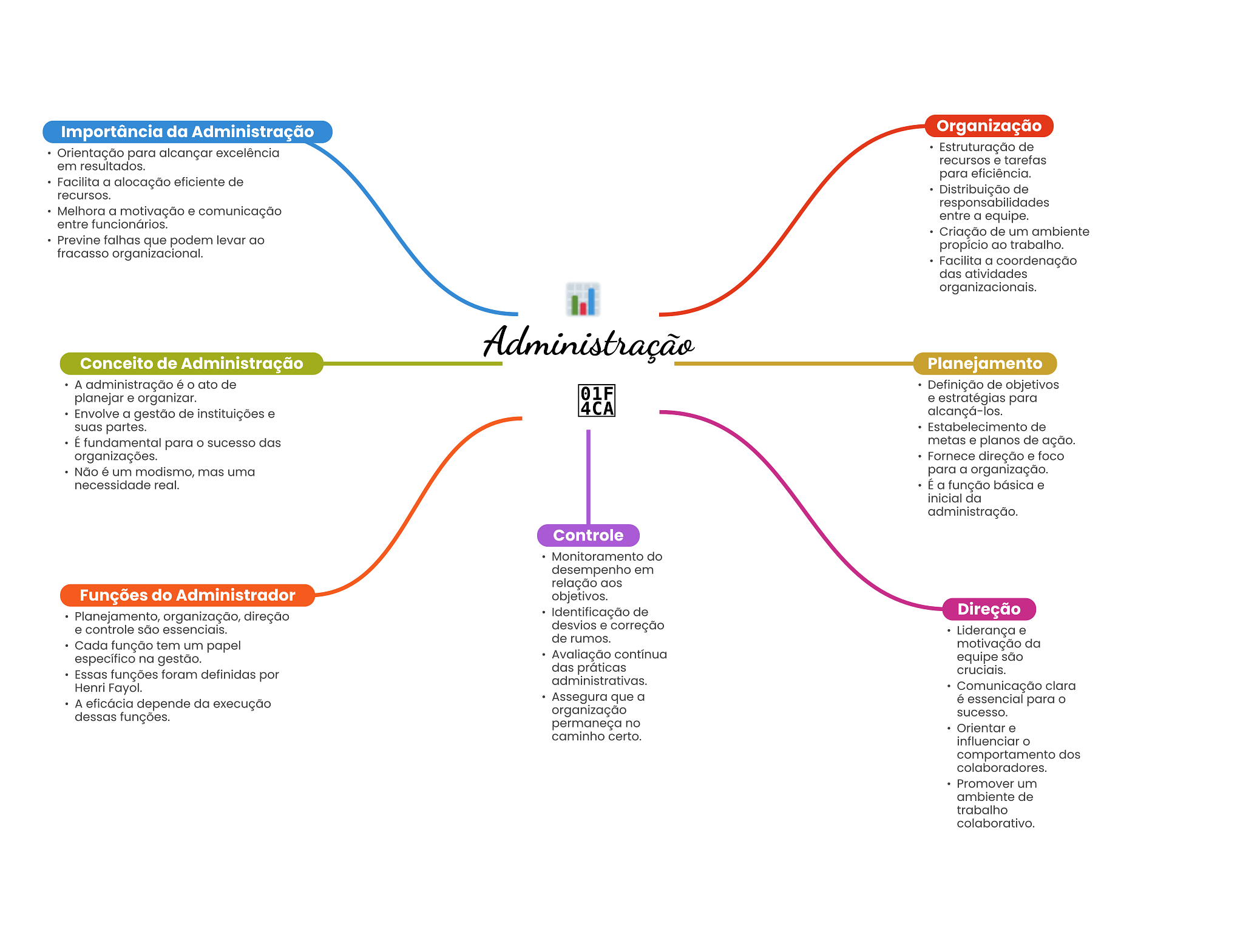 Importância da Administração Organização Orientação para alcançar excelência Estruturação de recursos e tarefas em resultados. para eficiência. Facilita a alocação eficiente de Distribuição de recursos. responsabilidades Melhora a motivação e comunicação entre a equipe. entre funcionários. Criação de um ambiente Previne falhas que podem levar ao propício ao trabalho. fracasso organizacional. Facilita a coordenação das atividades organizacionais. Administração Conceito de Administração Planejamento A administração é ato de Definição de objetivos planejar e organizar. 01F e estratégias para Envolve a gestão de instituições e 4CA alcançá-los. suas partes. Estabelecimento de É fundamental para sucesso das metas e planos de ação. organizações. Fornece direção e foco Não é um modismo, mas uma para a organização. necessidade real. É a função básica e inicial da administração. Controle Monitoramento do desempenho em relação aos Funções do Administrador objetivos. Planejamento, organização, direção Identificação de Direção e controle são essenciais. desvios e correção Liderança e de rumos. Cada função tem um papel motivação da específico na gestão. Avaliação contínua equipe são Essas funções foram definidas por das práticas cruciais. administrativas. Henri Fayol. Comunicação clara A eficácia depende da execução Assegura que a é essencial para O dessas funções. organização sucesso. permaneça no Orientar e caminho certo. influenciar comportamento dos colaboradores. Promover um ambiente de trabalho colaborativo.