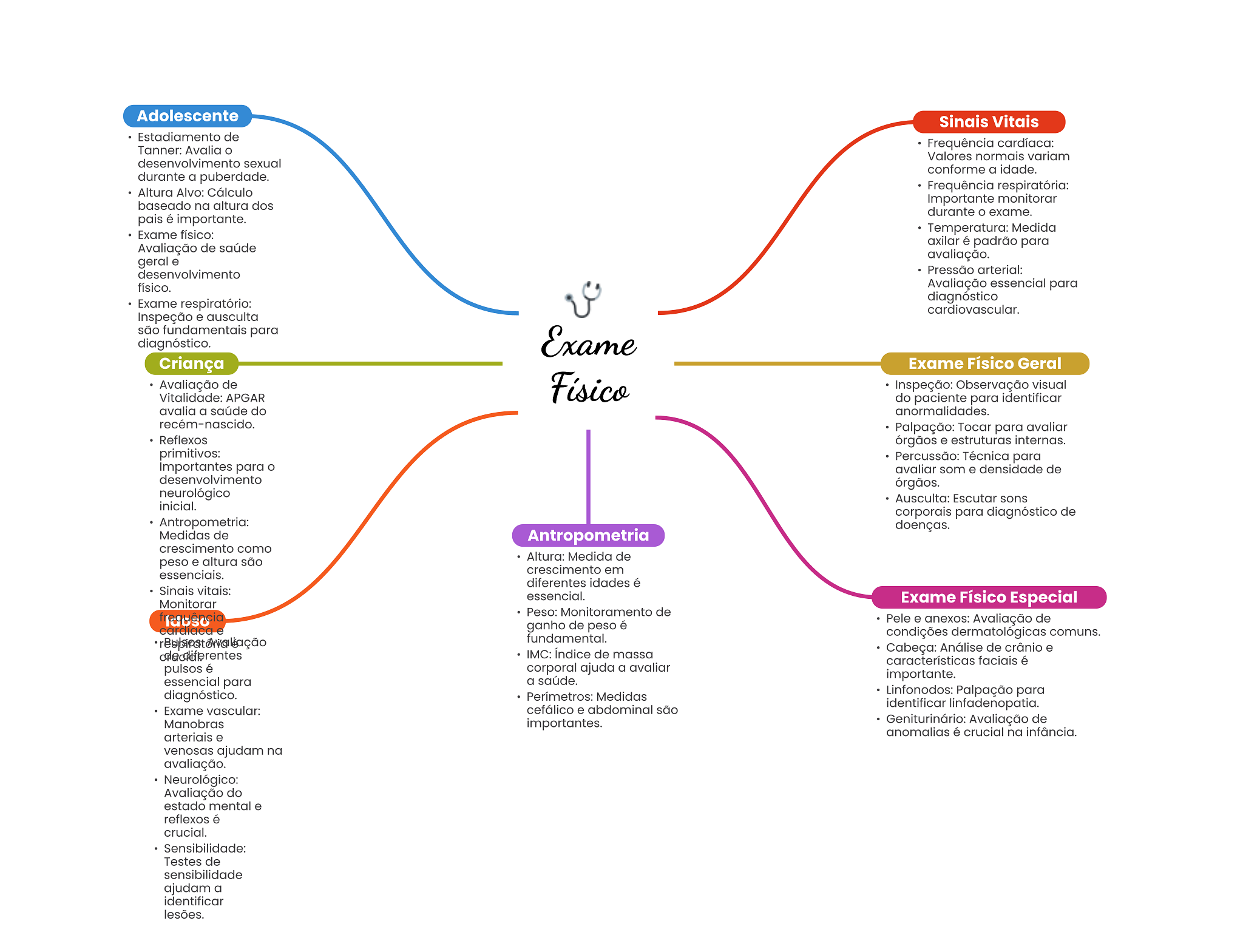 Adolescente Sinais Vitais Estadiamento de Tanner: Avalia Frequência cardíaca: Valores normais variam desenvolvimento sexual conforme a idade. durante a puberdade. Altura Alvo: Cálculo Frequência respiratória: baseado na altura dos Importante monitorar durante exame. pais é importante. Exame físico: Temperatura: Medida axilar é padrão para Avaliação de saúde avaliação. geral e desenvolvimento Pressão arterial: físico. Avaliação essencial para Exame respiratório: diagnóstico cardiovascular. Inspeção e ausculta são fundamentais para diagnóstico. Exame Criança Exame Físico Geral Avaliação de Físico Inspeção: Observação visual Vitalidade: APGAR do paciente para identificar avalia a saúde do anormalidades. recém-nascido. Palpação: Tocar para avaliar Reflexos órgãos e estruturas internas. primitivos: Percussão: Técnica para Importantes para avaliar som e densidade de desenvolvimento órgãos. neurológico Ausculta: Escutar sons inicial. corporais para diagnóstico de Antropometria: doenças. Medidas de Antropometria crescimento como Altura: Medida de peso e altura são essenciais. crescimento em diferentes idades é Sinais vitais: essencial. Monitorar Exame Físico Especial Peso: Monitoramento de ganho de peso é Pele e anexos: Avaliação de cardiaca fundamental. condições dermatológicas comuns. IMC: Indice de massa Cabeça: Análise de crânio e características faciais é pulsos é corporal ajuda a avaliar a saúde. importante. essencial para diagnóstico. Perímetros: Medidas Linfonodos: Palpação para Exame vascular: cefálico e abdominal são identificar linfadenopatia. Manobras importantes. Geniturinário: Avaliação de arteriais e anomalias é crucial na infância. venosas ajudam na avaliação. Neurológico: Avaliação do estado mental e reflexos é crucial. Sensibilidade: Testes de sensibilidade ajudam a identificar lesões.