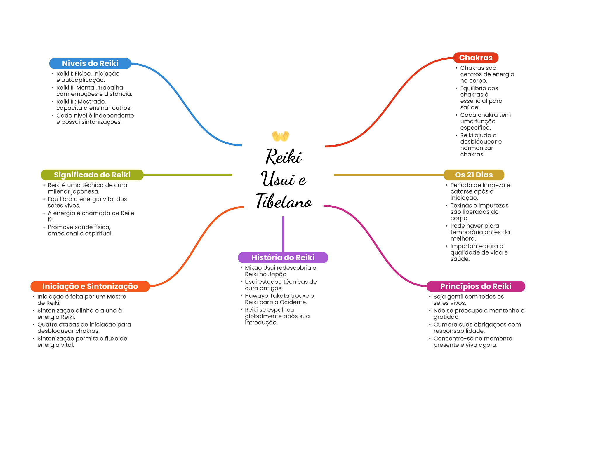 Chakras Níveis do Reiki Chakras são Reiki I: Físico, iniciação centros de energia e autoaplicação. no corpo. Reiki II: Mental, trabalha Equilíbrio dos com emoções e distância. chakras é Reiki III: Mestrado, essencial para capacita a ensinar outros. saúde. Cada nível é independente Cada chakra tem e possui sintonizações. uma função específica. Reiki ajuda a desbloquear e harmonizar Reiki chakras. Significado do Reiki Usuie Os 21 Dias Reiki é uma técnica de cura Período de limpeza e milenar japonesa. catarse após a Equilibra a energia vital dos seres vivos. Tibetano iniciação. Toxinas e impurezas A energia é chamada de Rei e são liberadas do Ki. corpo. Promove saúde física, Pode haver piora emocional e espiritual. temporária antes da melhora. Importante para a qualidade de vida e História do Reiki saúde. Mikao Usui redescobriu Reiki no Japão. Usui estudou técnicas de Iniciação e Sintonização cura antigas. Princípios do Reiki Iniciação é feita por um Mestre Hawayo Takata trouxe Seja gentil com todos de Reiki. Reiki para Ocidente. seres vivos. Sintonização alinha aluno à Reiki se espalhou Não se preocupe e mantenha a energia Reiki. globalmente após sua gratidão. Quatro etapas de iniciação para introdução. Cumpra suas obrigações com desbloquear chakras. responsabilidade. Sintonização permite fluxo de Concentre-se no momento energia vital. presente e viva agora.