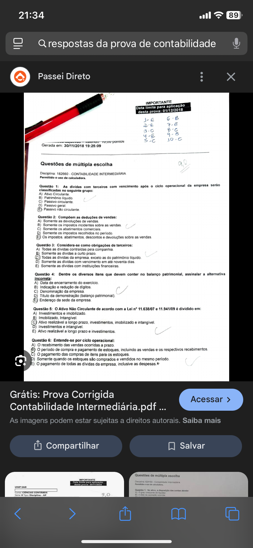 21:34 89 respostas da prova de contabilidade Passei Direto X IMPORTANTE Data limite para aplicação desta prova: 01/12/2018 6-B 2-E 4-E 9-B 10,00 pontos Gerada em: 30/11/2018 19:25:09 Questões de múltipla escolha 182660 - CONTABILIDADE INTERMEDIÁRIA Permitido uso de Questão 1: As dividas com terceiros com vencimento após ciclo operacional da empresa serão classificadas no seguinte grupo: A) Ativo Circulante B) Patrimônio líquido C) Passivo circulante D) Passivo Passivo não circulante Questão 2: as deduções de vendas: A) Somente as devoluções de vendas B) Somente impostos incidentes sobre as vendas C) Somente abatimentos comerciais D) Somente impostos recolhidos no periodo E Os descontos e devoluções sobre as vendas Questão 3: Considera-se como obrigações de terceiros: A) Todas as dividas contraidas pela B) Somente as dividas a curto Todas as dividas da exceto as do patrimônio D) Somente as dividas com vencimento em noventa dias E) Somente as dividas com instituições financeiras Questão 4: Dentre os diversos itens que devem conter no balanço patrimonial, assinalar a alternativa incorreta: A) Data de encerramento do B) Indicação e redução de digitos. C) Denominação da D) da demonstração (balanço Endereço da sede da Questão 5: O Ativo Não Circulante de acordo com a Lei n° 11.638/07 e 11.941/09 é dividido em: A) Investimentos e B) Imobilizado, C Ativo realizável a longo prazo, imobilizado e D) Investimentos e E) Ativo realizável a longo prazo e Questão 6: Entende-se por ciclo operacional: A) recebimento das vendas ocorridas a O periodo de compra e pagamento de estoques, incluindo as vendas e os respectivos recebimentos pagamento das compras de itens para estoques. P) Somente quando estoques são comprados e vendidos no mesmo E) pagamento de todas as da empresa, inclusive as despesas.* Grátis: Prova Corrigida Acessar > Contabilidade Intermediária.pdf As imagens podem estar sujeitas a direitos autorais. Saiba mais Compartilhar Salvar Questões de múltipla escolha IMPORTANTE Data limite Disciplina 624180 desta prova 307 11/2024 UNIP EAD Questão No disposição contas CIENCIAS Disciplina AP 9,0 operação
