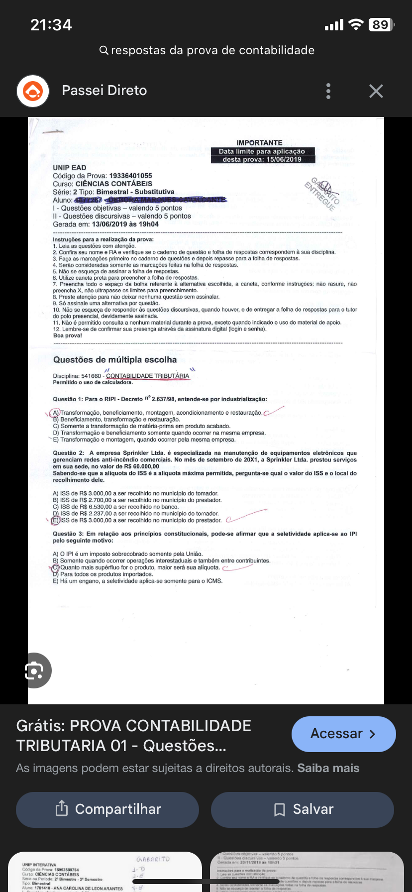 21:34 89 Q respostas da prova de contabilidade Passei Direto X IMPORTANTE Data limite para aplicação desta prova: 15/06/2019 UNIP EAD Código da Prova: 19336401055 Curso: CIÊNCIAS CONTÁBEIS Série: 2 Tipo: Bimestral Substitutiva Aluno: I Questões objetivas valendo 5 pontos II Questões discursivas valendo 5 pontos Gerada em: 13/06/2019 às 19h04 Instruções para a realização da prova: 1. Leia as questões com atenção. 2. Confira seu nome e RA e verifique se 0 caderno de questão e folha de respostas correspondem à sua disciplina. 3. Faça as marcações primeiro no caderno de questões e depois repasse para a folha de respostas. 4. consideradas somente as marcações feitas na folha de respostas. 5. Não se esqueça de assinar a folha de respostas. 6. Utilize caneta preta para preencher a folha de respostas. 7. Preencha todo espaço da bolha referente à alternativa escolhida, a caneta, conforme instruções: não rasure, não preencha não ultrapasse limites para preenchimento. 8. Preste atenção para não deixar nenhuma questão sem 9. Só assinale uma alternativa por questão. 10. Não se esqueça de responder às questões discursivas, quando houver, e de entregar a folha de respostas para tutor do polo presencial, devidamente 11. Não é permitido consulta a nenhum material durante a prova, exceto quando indicado 0 uso do material de apoio. 12. Lembre-se de confirmar sua presença através da assinatura digital (login e senha). Boa prova! Questões de múltipla escolha Disciplina: 541660 CONTABILIDADE TRIBUTÁRIA Permitido uso de calculadora. Questão 1: Para RIPI - Decreto n° 2.637/98, entende-se por industrialização: A) Transformação, beneficiamento, montagem, acondicionamento e restauração B) Beneficiamento, transformação e restauração. C) Somente a transformação de matéria-prima em produto acabado. D) Transformação e beneficiamento somente quando ocorrer na mesma empresa. Transformação e montagem, quando ocorrer pela mesma empresa. Questão 2: A empresa Sprinkler Ltda. especializada na manutenção de equipamentos eletrônicos que gerenciam redes anti-incêndio comerciais. No mês de setembro de 20X1, a Sprinkler Ltda. prestou serviços em sua sede, no valor de Sabendo-se que a do ISS é a aliquota máxima permitida, pergunta-se qual O valor do ISS e local do recolhimento dele. A) ISS de R$ 3.000,00 a ser recolhido no do tomador. B) ISS de 2.700,00 a ser recolhido no do prestador. C) ISS de a ser recolhido no banco. D) ISS de 2.237,00 a ser recolhido no do tornador. ISS de R$ 3.000,00 a ser recolhido no municipio do prestador. Questão 3: Em relação aos principios constitucionais, pode-se afirmar que a seletividade aplica-se ao IPI pelo seguinte motivo: A) IPI é um imposto sobrecobrado somente pela União. B) Somente quando ocorrer operações interestaduais e também entre Quanto mais supérfluo for produto, maior será sua alíquota. Para todos produtos importados. Há um engano, a seletividade aplica-se somente para ICMS. Grátis: PROVA CONTABILIDADE Acessar > TRIBUTARIA 01 Questões... As imagens podem estar sujeitas a direitos autorais. Saiba mais Compartilhar Salvar GABARITO Questões discursives valendo Gerada 20/11/2019 15h31 UNIP INTERATIVA da Curso CIENCIAS CONTABEIS Bimestre Somestre Tipo: Bimestral 1701410 ANA CAROLINA DE LEON ARANTES