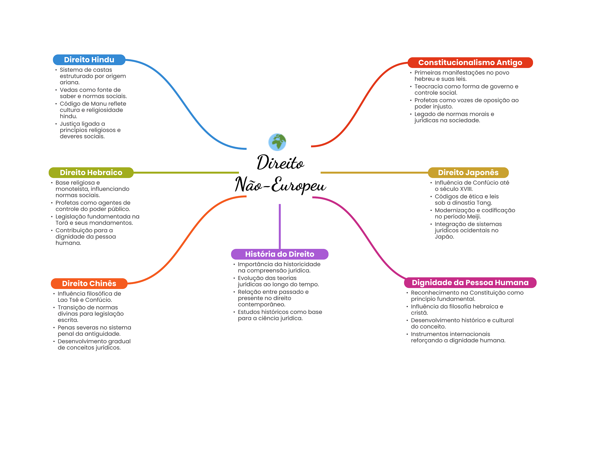 Direito Hindu Constitucionalismo Antigo Sistema de castas Primeiras manifestações no povo estruturado por origem hebreu e suas leis. ariana. Vedas como fonte de Teocracia como forma de governo e controle social. saber e normas sociais. Código de Manu reflete Profetas como vozes de oposição ao cultura e religiosidade poder injusto. hindu. Legado de normas morais e jurídicas na sociedade. Justiça ligada a princípios religiosos e deveres sociais. Direito Direito Hebraico Direito Japonês Base religiosa e Não-Europeu Influência de Confúcio até monoteísta, influenciando século XVIII. normas sociais. Códigos de ética e leis Profetas como agentes de sob a dinastia Tang. controle do poder público. Modernização e codificação Legislação fundamentada na no período Meiji. Torá e seus mandamentos. Integração de sistemas Contribuição para a jurídicos ocidentais no dignidade da pessoa Japão. humana. História do Direito Importância da historicidade na compreensão jurídica. Evolução das teorias Direito Chinês jurídicas ao longo do tempo. Dignidade da Pessoa Humana Influência filosófica de Relação entre passado e Reconhecimento na Constituição como Lao Tsé e Confúcio. presente no direito princípio fundamental. Transição de normas contemporâneo. Influência da filosofia hebraica e divinas para legislação Estudos históricos como base cristã. escrita. para a ciência jurídica. Desenvolvimento histórico e cultural Penas severas no sistema do conceito. penal da antiguidade. Instrumentos internacionais Desenvolvimento gradual reforçando a dignidade humana. de conceitos jurídicos.