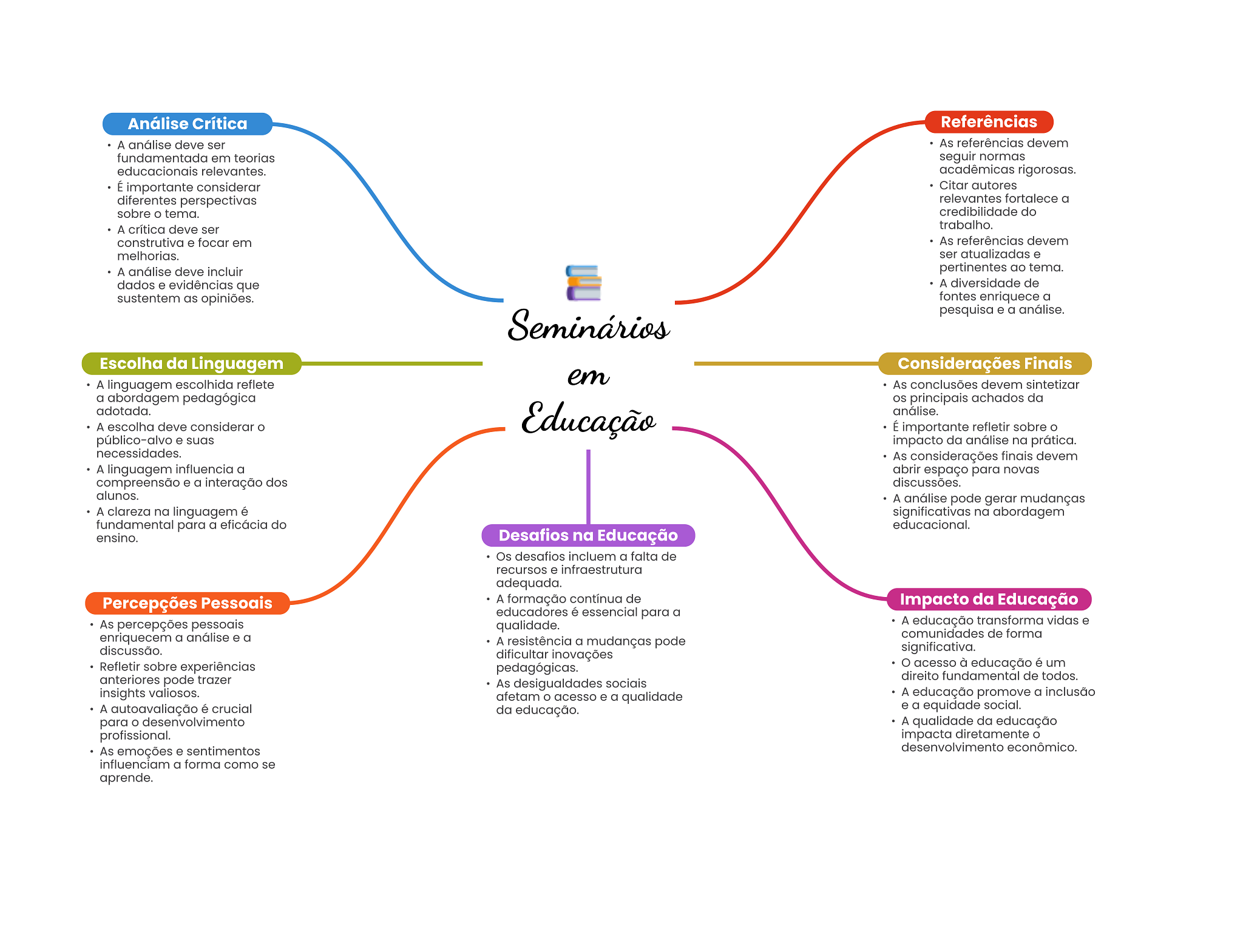 Análise Crítica Referências A análise deve ser As referências devem fundamentada em teorias seguir normas educacionais relevantes. acadêmicas rigorosas. É importante considerar Citar autores diferentes perspectivas relevantes fortalece a sobre tema. credibilidade do A crítica deve ser trabalho. construtiva e focar em As referências devem melhorias. ser atualizadas e A análise deve incluir pertinentes ao tema. dados e evidências que A diversidade de sustentem as opiniões. fontes enriquece a pesquisa e a análise. Seminários Escolha da Linguagem Considerações Finais em A linguagem escolhida reflete As conclusões devem sintetizar a abordagem pedagógica principais achados da adotada. Educação análise. A escolha deve considerar É importante refletir sobre público-alvo e suas impacto da análise na prática. necessidades. As considerações finais devem A linguagem influencia a abrir espaço para novas compreensão e a interação dos discussões. alunos. A análise pode gerar mudanças A clareza na linguagem é significativas na abordagem fundamental para a eficácia do educacional. ensino. Desafios na Educação Os desafios incluem a falta de recursos e infraestrutura adequada. Percepções Pessoais A formação contínua de Impacto da Educação educadores é essencial para a As percepções pessoais qualidade. A educação transforma vidas e enriquecem a análise e a comunidades de forma A resistência a mudanças pode discussão. significativa. dificultar inovações Refletir sobre experiências pedagógicas. acesso à educação é um anteriores pode trazer direito fundamental de todos. As desigualdades sociais insights valiosos. afetam acesso e a qualidade A educação promove a inclusão A autoavaliação é crucial da educação. e a equidade social. para desenvolvimento A qualidade da educação profissional. impacta diretamente As emoções e sentimentos desenvolvimento econômico. influenciam a forma como se aprende.