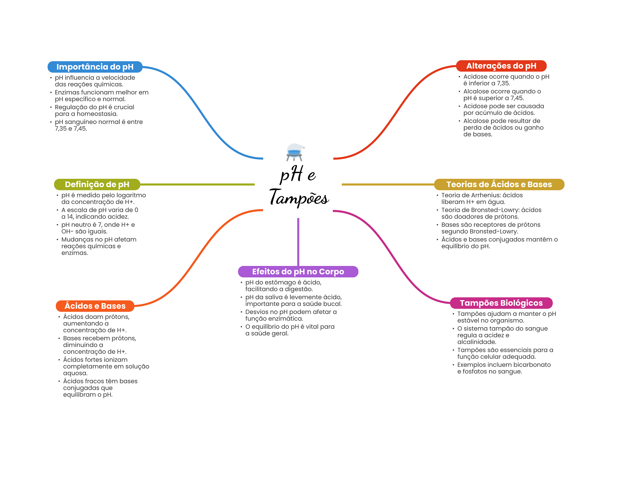 Importância do pH Alterações do pH pH influencia a velocidade Acidose ocorre quando pH das reações químicas. é inferior a 7,35. Enzimas funcionam melhor em Alcalose ocorre quando pH específico e normal. pH é superior a 7,45. Regulação do pH é crucial Acidose pode ser causada para a homeostasia. por acúmulo de ácidos. pH sanguíneo normal é entre Alcalose pode resultar de 7,35 e 7,45. perda de ácidos ou ganho de bases. pH e Definição de pH Teorias de Ácidos e Bases pH é medido pelo logaritmo da concentração de H+. Tampões Teoria de Arrhenius: ácidos liberam H+ em água. A escala de pH varia de 0 Teoria de Bronsted-Lowry: ácidos a 14, indicando acidez. são doadores de prótons. pH neutro onde H+ e Bases são receptores de prótons são iguais. segundo Bronsted-Lowry. Mudanças no pH afetam Ácidos e bases conjugados mantêm reações químicas e equilíbrio do enzimas. Efeitos do pH no Corpo pH do estômago é ácido, facilitando a digestão. pH da saliva é levemente ácido, Ácidos e Bases importante para a saúde bucal. Tampões Biológicos Desvios no pH podem afetar a Ácidos doam prótons, Tampões ajudam a manter O pH função enzimática. aumentando a estável no organismo. concentração de H+. equilíbrio do pH é vital para O sistema tampão do sangue a saúde geral. Bases recebem prótons, regula a acidez e diminuindo a alcalinidade. concentração de H+. Tampões são essenciais para a Ácidos fortes ionizam função celular adequada. completamente em solução Exemplos incluem bicarbonato aquosa. e fosfatos no sangue. Ácidos fracos têm bases conjugadas que equilibram pH.