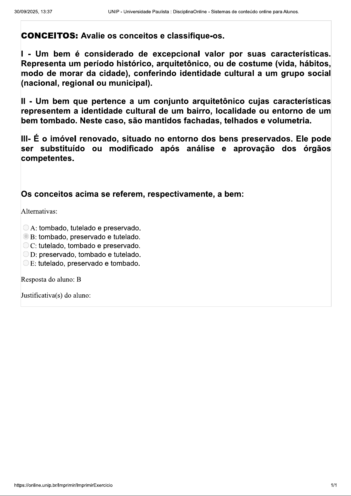 30/09/2025, 13:37 UNIP Universidade Paulista : DisciplinaOnline Sistemas de conteúdo online para Alunos. CONCEITOS: Avalie os conceitos e classifique-os. I - Um bem é considerado de excepcional valor por suas características. Representa um período histórico, arquitetônico, ou de costume (vida, hábitos, modo de morar da cidade), conferindo identidade cultural a um grupo social (nacional, regional ou municipal). II - Um bem que pertence a um conjunto arquitetônico cujas características representem a identidade cultural de um bairro, localidade ou entorno de um bem tombado. Neste caso, são mantidos fachadas, telhados e volumetria. III- É imóvel renovado, situado no entorno dos bens preservados. Ele pode ser substituído ou modificado após análise e aprovação dos órgãos competentes. Os conceitos acima se referem, respectivamente, a bem: Alternativas: A: tombado, tutelado e preservado. B: tombado, preservado e tutelado. C: tutelado, tombado e preservado. D: preservado, tombado e tutelado. E: tutelado, preservado e tombado. Resposta do aluno: Justificativa(s) do aluno: 1/1