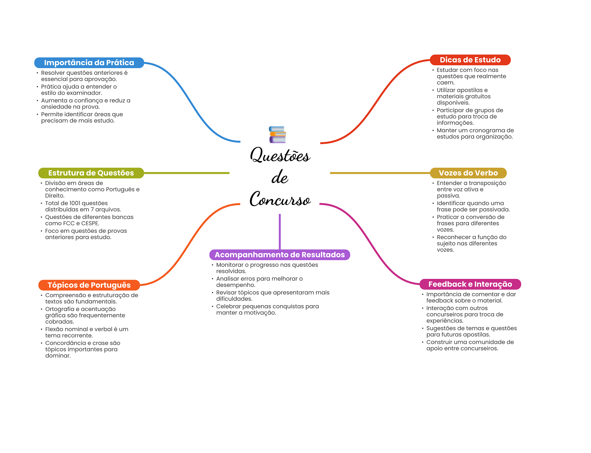 Importância da Prática Dicas de Estudo Estudar com foco nas Resolver questões anteriores é essencial para aprovação. questões que realmente caem. Prática ajuda a entender estilo do examinador. Utilizar apostilas e materiais gratuitos Aumenta a confiança e reduz a disponíveis. ansiedade na prova. Participar de grupos de Permite identificar áreas que estudo para troca de precisam de mais estudo. informações. Manter um cronograma de estudos para organização. Questões Estrutura de Questões de Vozes do Verbo Divisão em áreas de Entender a transposição conhecimento como Português e entre ativa e Direito. Concurso passiva. Total de 1001 questões Identificar quando uma distribuídas em 7 arquivos. frase pode ser passivada. Questões de diferentes bancas Praticar a conversão de como FCC e CESPE. frases para diferentes Foco em questões de provas vozes. anteriores para estudo. Reconhecer a função do sujeito nas diferentes vozes. Acompanhamento de Resultados Monitorar O progresso nas questões resolvidas. Analisar erros para melhorar Tópicos de Português desempenho. Feedback e Interação Compreensão e estruturação de Revisar tópicos que apresentaram mais Importância de comentar e dar textos são fundamentais. dificuldades. feedback sobre material. Ortografia e acentuação Celebrar pequenas conquistas para Interação com outros gráfica são frequentemente manter a motivação. concurseiros para troca de cobradas. experiências. Flexão nominal e verbal é um Sugestões de temas e questões tema recorrente. para futuras apostilas. Concordância e crase são Construir uma comunidade de tópicos importantes para apoio entre concurseiros. dominar.