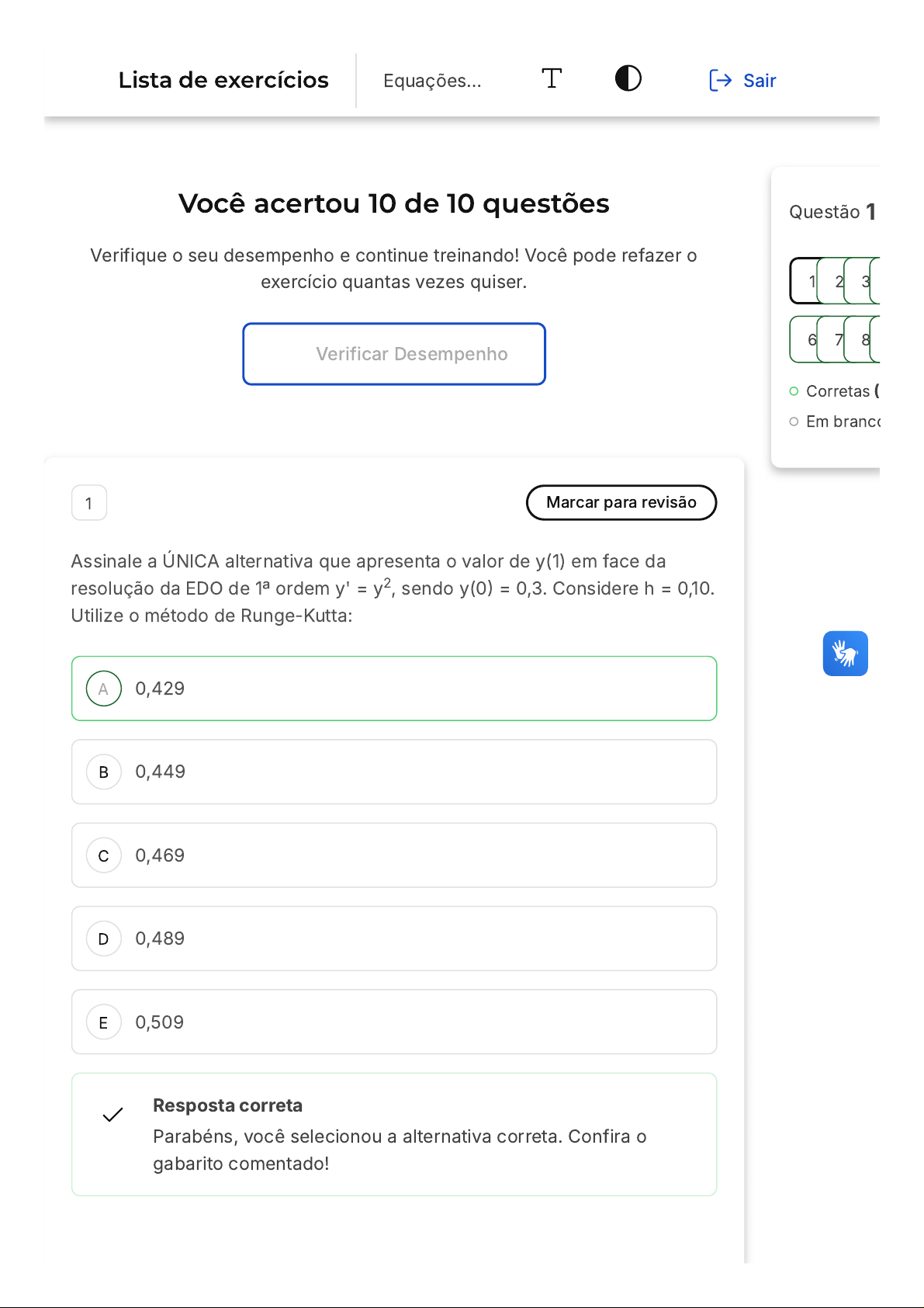 Você acertou 10 de 10 questões Verifique o seu desempenho e continue treinando! Você pode refazer o exercício quantas vezes quiser. Verificar Desempenho A B C D E 1 Marcar para revisão Assinale a ÚNICA alternativa que apresenta o valor de y(1) em face da resolução da EDO de 1ª ordem y' = y , sendo y(0) = 0,3. Considere h = 0,10. Utilize o método de Runge-Kutta: 2 0,429 0,449 0,469 0,489 0,509 Resposta correta Parabéns, você selecionou a alternativa correta. Confira o gabarito comentado! Questão 1 Corretas ( Em branco 1 2 3 6 7 8 Lista de exercícios Equações… Sair Gabarito Comentado A resolução do problema de valor inicial em equações diferenciais ordinárias de primeira ordem requer que o enunciado forneça alguns elementos importantes, como: - A equação diferencial ordinária de primeira ordem propriamente dita; - O ponto inicial; - O ponto final; - A quantidade de intervalos (ou o tamanho de cada intervalo); e - O valor da função no ponto inicial. Neste exemplo, temos que: - A equação diferencial ordinária de primeira ordem propriamente dita é y' = y ; - O ponto inicial é 0; - O ponto final é 1; - O tamanho de cada intervalo é 0,1; e - O valor da função no ponto inicial é 0,3. Isso posto, utilize o método indicado a seguir: Executando o código indicado, você obterá a resposta 0.428 . 2 A B C D E 2 Marcar para revisão Assinale a ÚNICA alternativa que apresenta o valor de y(0,4) em face da resolução da EDO de 1ª ordem y' = y + 3, sendo y(0) = 3. Considere h = 0,1. Utilize o método de Euler: 5,785 5,885 5,985 6,085 6,185 Resposta correta Parabéns, você selecionou a alternativa correta. Confira o gabarito comentado! Gabarito Comentado Como vimos neste tema, a resolução do problema de valor inicial em equações diferenciais ordinárias de primeira ordem requer que o enunciado forneça alguns elementos importantes, como: - A equação diferencial ordinária de primeira ordem propriamente dita; O ponto inicial; O ponto final; A quantidade de intervalos (ou o tamanho de cada intervalo); e O valor da função no ponto inicial. Neste exemplo, temos que: - A equação diferencial ordinária de primeira ordem propriamente dita é y' = y + 3; O ponto inicial é 0; O ponto final é 0,4; O tamanho de cada intervalo é 0,1; e O valor da função no ponto inicial é 3. Isso posto, utilize o método indicado a seguir: A B C D E 3 Marcar para revisão Assinale a ÚNICA alternativa que apresenta o valor de y(2) em face da resolução da EDO de 1ª ordem y' = y , sendo y(0) = 0,3. Considere h = 0,20. Utilize o método de Runge-Kutta: 2 0,75 0,77 0,79 0,81 0,83 Resposta correta Parabéns, você selecionou a alternativa correta. Confira o gabarito comentado! Gabarito Comentado A resolução do problema de valor inicial em equações diferenciais ordinárias de primeira ordem requer que o enunciado forneça alguns elementos importantes, como: - A equação diferencial ordinária de primeira ordem propriamente dita; - O ponto inicial; - O ponto final; - A quantidade de intervalos (ou o tamanho de cada intervalo); e - O valor da função no ponto inicial. Neste exemplo, temos que: - A equação diferencial ordinária de primeira ordem propriamente dita é y' = y ;2 - O ponto inicial é 0; - O ponto final é 2; - O tamanho de cada intervalo é 0,2; e - O valor da função no ponto inicial é 0,3. Isso posto, utilize o método indicado a seguir: Executando o código indicado, você obterá a resposta 0.74 4 Marcar para revisão Assinale a ÚNICA alternativa que apresenta o valor de y(0,4) em face da resolução da EDO de 1ª ordem y' = 2.sen(y), sendo y(0) = 3. Considere h = 0,1. Utilize o método de Euler: A B C D E 3,084 3,184 3,284 3,384 3,484 Resposta correta Parabéns, você selecionou a alternativa correta. Confira o gabarito comentado! Gabarito Comentado Como vimos neste tema, a resolução do problema de valor inicial em equações diferenciais ordinárias de primeira ordem requer que o enunciado forneça alguns elementos importantes, como: - A equação diferencial ordinária de primeira ordem propriamente dita; O ponto inicial; O ponto final; A quantidade de intervalos (ou o tamanho de cada intervalo); e O valor da função no ponto inicial. Neste exemplo, temos que: - A equação diferencial ordinária de primeira ordem propriamente dita é y' = 2.sen(y); O ponto inicial é 0; O ponto final é 0,4; O tamanho de cada intervalo é 0,1; e O valor da função no ponto inicial é 3. Isso posto, utilize o método indicado a seguir: A B C D E 5 Marcar para revisão Assinale a ÚNICA alternativa que apresenta o valor de y(3) em face da resolução da EDO de 1ª ordem y'= sen (y), sendo y(0) = 0,2. Considere h = 0,30. Utilize o método de Runge-Kutta: 2 0,477 0,577 0,677 0,777 0,877 Resposta correta Parabéns, você selecionou a alternativa correta. Confira o gabarito comentado! Gabarito Comentado A resolução do problema de valor inicial em equações diferenciais ordinárias de primeira ordem requer que o enunciado forneça alguns elementos importantes, como: - A equação diferencial ordinária de primeira ordem propriamente dita; - O ponto inicial; - O ponto final; - A quantidade de intervalos (ou o tamanho de cada intervalo); e - O valor da função no ponto inicial. Neste exemplo, temos que: - A equação diferencial ordinária de primeira ordem propriamente dita é y' = sen (y); - O ponto inicial é 0; - O ponto final é 3; - O tamanho de cada intervalo é 0,3; e - O valor da função no ponto inicial é 0,2. Isso posto, utilize o método indicado a seguir: 2 A B C Executando o código indicado, você obterá a resposta 0.477. 6 Marcar para revisão Assinale a ÚNICA alternativa que apresenta o valor de y(3) em face da resolução da EDO de 1ª ordem y' = cos(y), sendo y(0) = 0,3. Considere h = 0,30. Utilize o método de Runge-Kutta: 1,497 1,597 1,697 D E 1,797 1,897 Resposta correta Parabéns, você selecionou a alternativa correta. Confira o gabarito 