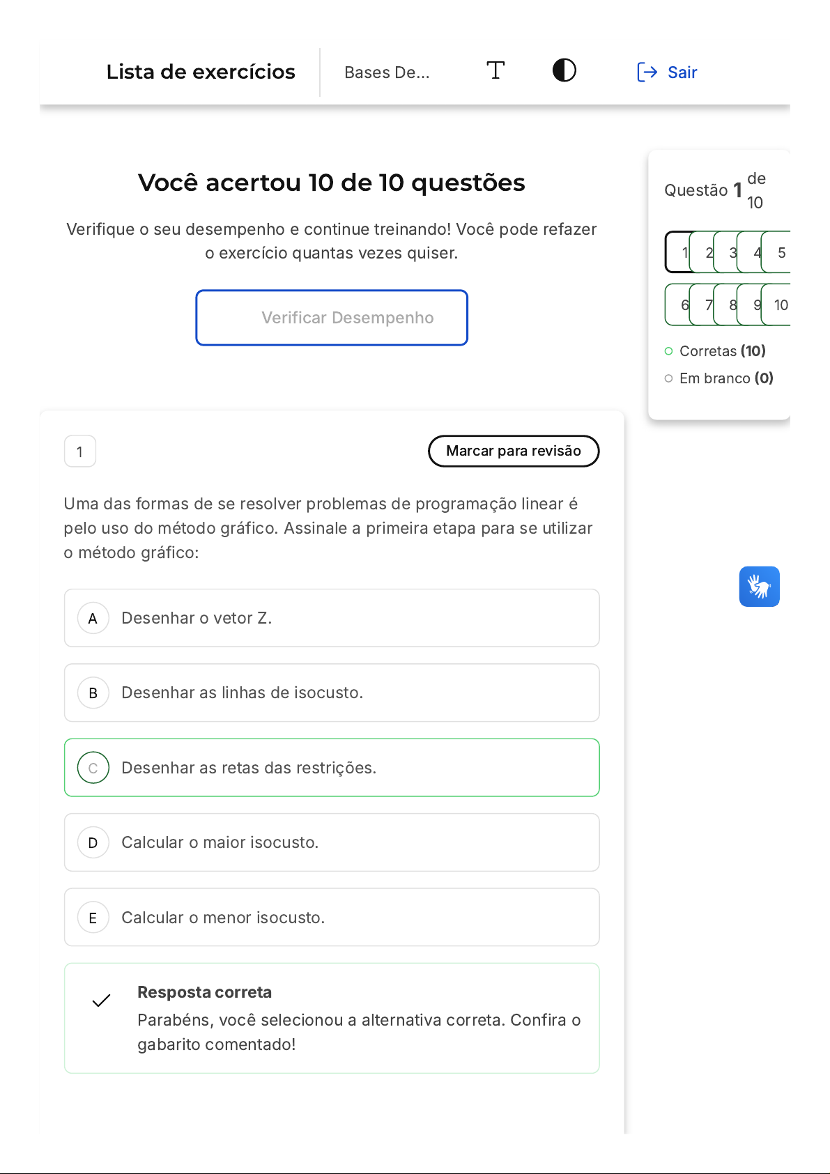 Você acertou 10 de 10 questões Verifique o seu desempenho e continue treinando! Você pode refazer o exercício quantas vezes quiser. Verificar Desempenho A B C D E 1 Marcar para revisão Uma das formas de se resolver problemas de programação linear é pelo uso do método gráfico. Assinale a primeira etapa para se utilizar o método gráfico: Desenhar o vetor Z. Desenhar as linhas de isocusto. Desenhar as retas das restrições. Calcular o maior isocusto. Calcular o menor isocusto. Resposta correta Parabéns, você selecionou a alternativa correta. Confira o gabarito comentado! Questão 1 de 10 Corretas (10) Em branco (0) 1 2 3 4 5 6 7 8 9 10 Lista de exercícios Bases De… Sair Gabarito Comentado O método gráfico para resolver problemas de programação linear envolve uma série de etapas. A primeira delas, como indicado na alternativa correta, é desenhar as retas correspondentes às restrições do problema. Isso é essencial para estabelecer o espaço de soluções viáveis. Após essa etapa, o vetor Z (função objetivo) é desenhado. Em seguida, são traçadas linhas ortogonais ao vetor Z, que são as linhas de isocusto, representando as retas que possuem o mesmo valor de Z. Por fim, é calculado o valor de Z no ponto ótimo, que é a linha de isocusto com maior valor de Z que ainda pertence ao espaço de soluções. Portanto, a primeira etapa para se utilizar o método gráfico é desenhar as retas das restrições. 2 Marcar para revisão Uma fábrica de bicicletas acaba de receber um pedido de R$750.000,00. Foram encomendadas 3.000 bicicletas do modelo 1, 2.000 do modelo 2 e 000 do modelo 3. São necessárias 2 horas para a montagem da bicicleta do modelo 1 e 1 hora para sua pintura. Para a bicicleta do modelo 2, leva-se 1,5 hora para a montagem e 2 horas para pintura. Para a bicicleta do modelo 3, são necessárias 3 horas de montagem e 1 hora de pintura. A fábrica tem disponibilidade de 10.000 horas para montagem e 6.000 horas para pintura até a entrega da encomenda. Os custos para a fabricação das bicicletas são: R 400,00 para a bicicleta 2 e R$430,00 para a bicicleta 3. A fábrica teme não ter tempo hábil para produzir toda a encomenda e, por isso, cotou o custo de terceirizar a sua fabricação. O custo para comprar uma bicicleta do modelo 1 seria de R 540,00, e de R$580,00 para a bicicleta do modelo 3. Para desenvolver o modelo de programação linear para minimizar o custo de produção e da encomenda de bicicletas, considere as seguintes variáveis de decisão: x = quantidade de bicicletas do modelo 1 a ser fabricada internamente x = quantidade de bicicletas do modelo 2 a ser fabricada internamente 350, 00paraabicicleta1,R 460, 00, paraabicicletadomodelo2,R 1 2 A B C D E x = quantidade de bicicletas do modelo 3 a ser fabricada internamente c = quantidade de bicicletas do modelo 1 a ser comprada de concorrente c = quantidade de bicicletas do modelo 2 a ser comprada de concorrente c = quantidade de bicicletas do modelo 3 a ser comprada de concorrente Assim, sobre a solução ótima deste problema, é correto afirmar que o custo total de produção e encomendas de bicicletas é de: 3 1 2 3 R$1.236.000,00 R$2.436.000,00 R$3.336.000,00 R$4.336.000,00 R$6.236.000,00 Resposta correta Parabéns, você selecionou a alternativa correta. Confira o gabarito comentado! Gabarito Comentado Usando o Solver do Excel baseado nas restrições e função objetivo: A B 3 Marcar para revisão Adaptado de Cesgranrio - Concurso Petrobrás/2012, cargo: Analista de Pesquisa Operacional Júnior Determinada fábrica de móveis produz mesas, escrivaninhas e cadeiras de madeira. Esses três produtos passam pelo setor de carpintaria. Se o setor de carpintaria se dedicasse apenas à fabricação de mesas, 1.000 unidades seriam produzidas por dia; caso o setor se dedicasse apenas à fabricação de escrivaninhas, 500 unidades seriam produzidas por dia; se o setor de carpintaria se dedicasse à fabricação de apenas cadeiras, seriam produzidas 1.500 cadeiras por dia. Cada cadeira contribui em R 400,00 e cada mesa contribui em R$500,00. Considere as seguintes variáveis inteiras como variáveis de decisão: X = quantidade de mesas produzidas X = quantidade de cadeiras produzidas X = quantidade de escrivaninhas produzidas O número de mesas produzidas é: 100, 00paraolucrodaempresa, cadaescrivaninhacontribuiemR 1 2 3 2000 3000 C D E 1000 100 0 Resposta correta Parabéns, você selecionou a alternativa correta. Confira o gabarito comentado! Gabarito Comentado 4 Marcar para revisão Adaptado de Goldbarg e Luna (2005, p. 36) A Tabela a seguir apresenta a proporção de cada material na mistura para a obtenção das ligas passíveis de fabricação por uma metalúrgica que deseja maximizar sua receita bruta. O preço está cotado em reais por tonelada da liga fabricada. Também em toneladas estão expressas as restrições de disponibilidade de matéria-prima. A B C D E A variável de decisão para a modelagem deste problema é x , que indica a quantidade em toneladas produzidas da liga especial de baixa resistência (i = 1) e da especial de alta resistência (i = 2). Assim, para a solução ótima deste problema, a produção de ligas especiais de baixa resistência pela metalúrgica deve ser de: i 1,4 11,4 20 45,4 100,4 Resposta correta Parabéns, você selecionou a alternativa correta. Confira o gabarito comentado! Gabarito Comentado Utilizando o Solver do Excel: A B C D E 5 Marcar para revisão Para modelar as restrições em um problema de programação linear, muitas vezes temos que trabalhar com inequações. Para converter uma restrição do tipo =, utilizamos variáveis de excesso. As demais alternativas apresentadas, como variáveis artificiais, aleatórias e ótimas, não são aplicáveis neste contexto específico de conversão de inequações em equações. 6 Marcar para revisão Adaptado de Cesgranrio - Concurso Petrobrás/2012, cargo: Analista de Pesquisa Operacional Júnior Deter