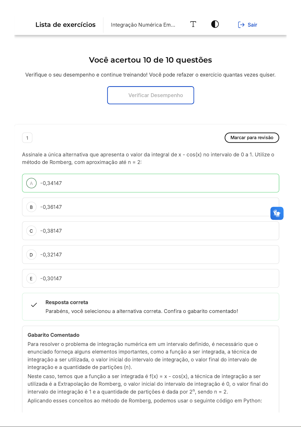 Executando este código, obtemos o resultado -0,34147, que corresponde à alternativa A, sendo esta