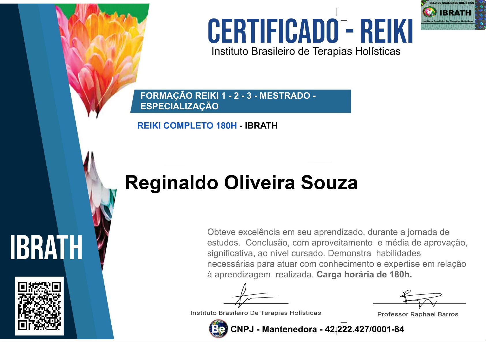 Aluno(a): Reginaldo Oliveira Souza Curso ministrado por: Raphael Barros Carga horária: 180h Conteúdo Programático: Módulo 1 - Aulas 1.1 Introdução Especialização Em Reiki 1.2 Como convidar para a comunidade 1.3 Estrutura de Ensino 1.4 O que é REIKI 1.5 Historia Reiki 1.6 5 Principio Reiki 1.7 Iniciação 1.8 Simbolismos Reiki 1.9 Conhecimentos básicos Especialização em Reiki 1.10 Fluxos Energéticos 1.11 Exercício Fluxo energético 1.12 Poder da intenção 1.13 O poder dos Símbolos Pt1 1.14 O poder dos Símbolos Pt2 1.15 O poder dos Símbolos Pt3 1.16 O poder dos Símbolos Pt4 1.17 O poder dos Símbolos Pt5 1.18 Cuidados 1.19 Ambiente 1.20 Procedimentos 1.21 Canalização 1.22 Transmutação 1.23 Desimpregnação 1.24 Escaneamento 1.25 Direcionamento Energético 1.26 Auto- Aplicação 1.27 Técnicas Pt2 1.28 TÉCNICAS REIKI 1.29 Técnicas Pt3 1.30 Técnicas Pt4 1.31 Técnicas Pt5 1.32 Técnicas Pt6 1.33 Aplicação pt1 1.34 Aplicação pt2 1.35 Aplicação pt3 1.36 Aplicação pt4 1.37 Aplicação e Símbolos 1.38 Como potencializar Reiki 1.39 Sensibilidade 1.40 O que é ser Mestre? 1.41 Aulas finais Reiki 1.42 Importante! 1.43 Dúvidas Comuns 01 1.44 Dúvidas Comuns 02 Mesa Radionica Reiki 2.1 Principios Básicos 2.2 Como Desimpregnar 2.3 Alinhamento Chakras 2.4 Divulgação 2.5 Possibilidades 2.6 Vivência 2.7 Considerações Finais Certificado emitido em: 16 de Abril, 2024