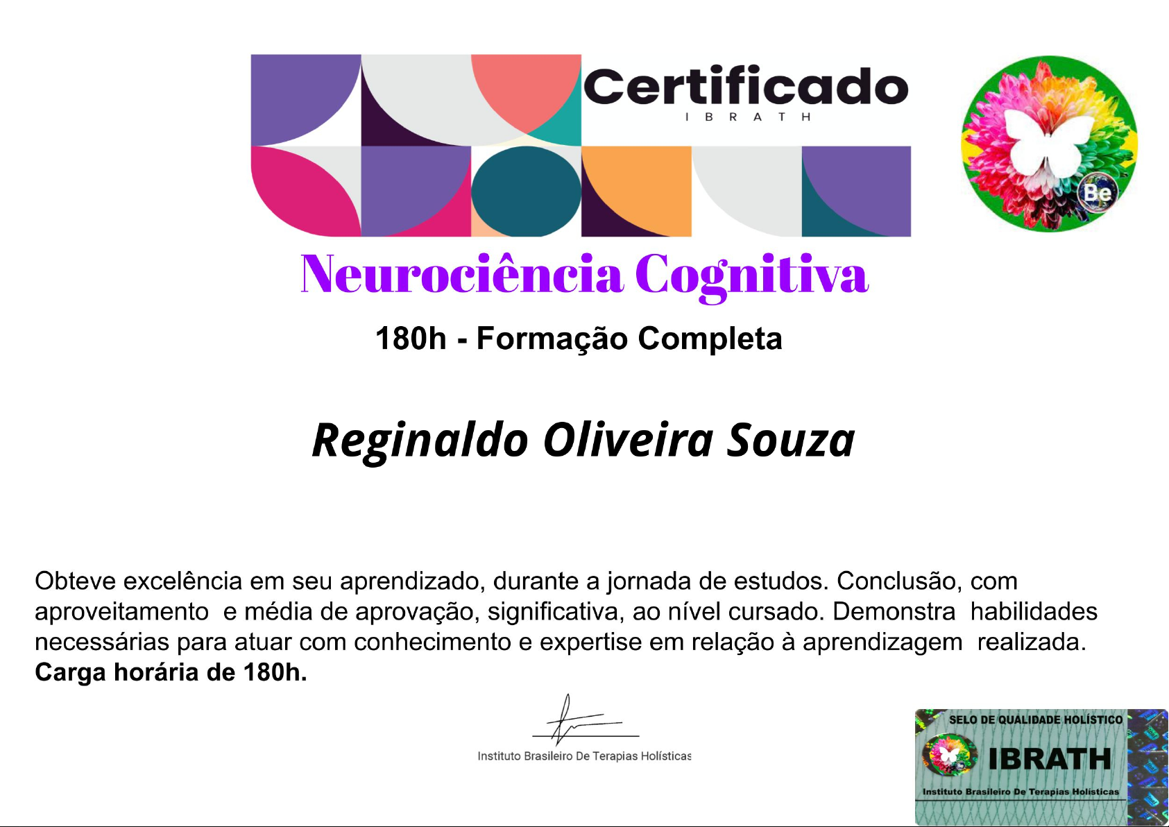 Aluno(a): Reginaldo Oliveira Souza Conteúdo Programático: 1.1 Introdução 1.2 Aviso Importante! 1.3 Aplicações práticas Neuro Ciência 1.4 Plasticidade Cerebral 1.5 Memória e Aprendizado 1.6 A Atenção 1.7 Percepção 1.8 Consciência 1.9 Funções executivas 1.10 Linguagem e processamento da fala 1.11 Padrões de Tomada de decisão 1.12 Emoções e Cognição Social 1.13 Neuroimagem e Mapeamento Cerebral 1.14 Neuroplasticidade 1.15 Inteligência e Cognição 1.16 Conectividade Cerebral 1.17 Sensação E Percepção 1.18 Desenvolvimento Neural e Cognitivo 1.19 Transtornos Cognitivos e Neurológicos 1.20 Consciência e Estados Alterados 1.21 Cognição Espacial 1.22 Memória de longo prazo 1.23 Interação corpo e mente Certificado emitido em: 16 de Abril, 2024
