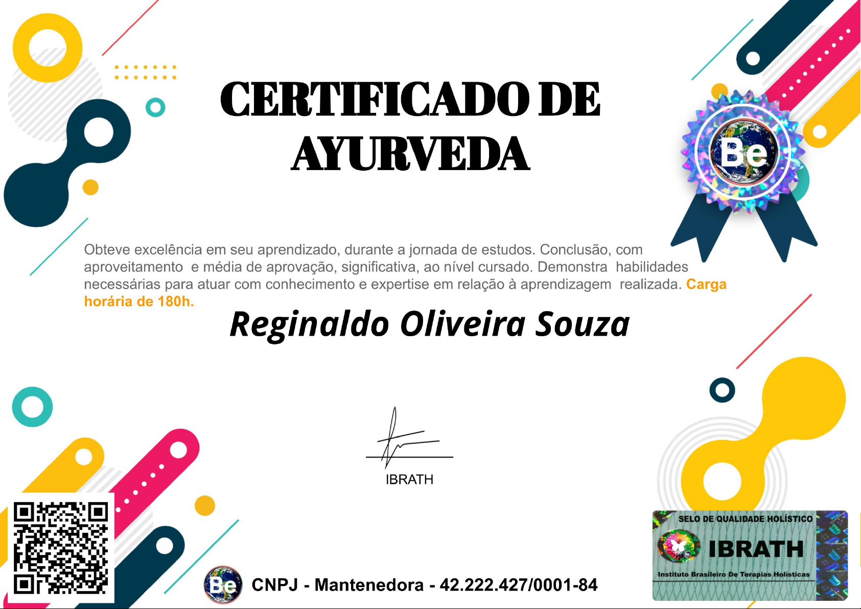 Aluno(a): Reginaldo Oliveira Souza Conteúdo Programático: Formação Ayurveda 1.1 Introducação 1.2 Princípios Cósmicos 1.3 Princípios Cósmicos 1.4 As quatro metas de vida segundo o Ayurveda 1.5 Os 5 Elementos 1.6 Revisão Ayurveda 1.7 Doshas Ayurveda - Vatta Dosha 1.8 Dosha Pitta 1.9 Dosha Kapha 1.10 Relacionamento dos DOSHAS 1.11 Tipologia Física Doshas 1.12 Os sete tecidos Ayurveda 1.13 Formação dos Dhatus 1.14 Os 20 Atributos Ayurveda 1.15 Os Srotas 1.16 Os três Gunas 1.17 Prakriti e Vikruti 1.18 Os Rasas Medicina Preventiva 2.1 Saúde Preventiva 2.2 Variações Sazonais 2.3 Diagnóstico e Tratamento 2.4 Os trajetos da Doença 2.5 Revisão Ayurveda 2.6 Tratamentos Ayurveda 2.7 Revisão Desintoxicação, equlibrio e tratamento 3.1 Métodos de Desintoxicação 3.2 Estudo mapa Mental desintoxicação na ayurveda 3.3 Desintoxicação 3.4 Equilibrio doshas 3.5 Tratamento do vata 3.6 Tratamento do Pita 3.7 Tratamento Kapha 3.8 Tratamento do DHATUS Recursos Adicionais 4.1 Mente & consciência na Ayurveda 4.2 Doshas e a Mente 4.3 O papel da Meditação 4.4 Conteúdo extra Certificado emitido em: 16 de Abril, 2024