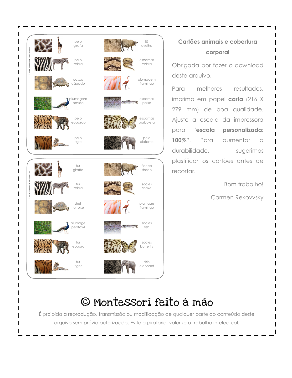 © Montessori feito à mão É proibida a reprodução, transmissão ou modificação de qualquer parte do conteúdo deste arquivo sem prévia autorização. Evite a pirataria, valorize o trabalho intelectual. Cartões animais e cobertura corporal Obrigada por fazer o download deste arquivo. Para melhores resultados, imprima em papel carta (216 X 279 mm) de boa qualidade. Ajuste a escala da impressora para “escala personalizada: 100%”. Para aumentar a durabilidade, sugerimos plastificar os cartões antes de recortar. Bom trabalho! Carmen Rekovvsky pelo girafa lã ovelha pelo zebra escamas cobra casco cágado plumagem flamingo plumagem pavão escamas peixe pelo leopardo escamas borboleta pelo tigre pele elefante © 2 0 1 8 M o n te ss o ri f e it o à m ã o fur giraffe fleece sheep fur zebra scales snake shell tortoise plumage flamingo plumage peafowl scales fish fur leopard scales butterfly fur tiger skin elephant © 2 0 1 8 M o n te ss o ri f e it o à m ã o Uso exclusivo autorizado: Waleria Botechia, waleria.nascimento@gmail.com, 11998016029 leopardo pavão cágado elefante zebra girafa borboleta peixe flamingo cobra ovelha tigre Uso exclusivo autorizado: Waleria Botechia, waleria.nascimento@gmail.com, 11998016029 pelo plumagem casco pele pelo pelo escamas escamas plumagem escamas lã pelo Uso exclusivo autorizado: Waleria Botechia, waleria.nascimento@gmail.com, 11998016029 leopard peafowl tortoise elephant zebra giraffe butterfly fish flamingo snake lamb tiger Uso exclusivo autorizado: Waleria Botechia, waleria.nascimento@gmail.com, 11998016029 fur plumage shell skin fur fur scales scales plumage scales fleece fur Uso exclusivo autorizado: Waleria Botechia, waleria.nascimento@gmail.com, 11998016029 © 2 0 1 8 M o n te ss o ri f e it o à m ã o © 2 0 1 8 M o n te ss o ri f e it o à m ã o © 2 0 1 8 M o n te ss o ri f e it o à m ã o © 2 0 1 8 M o n te ss o ri f e it o à m ã o Uso exclusivo autorizado: Waleria Botechia, waleria.nascimento@gmail.com, 11998016029 © 2 0 1 8 M o n te ss o ri f e it o à m ã o © 2 0 1 8 M o n te ss o ri f e it o à m ã o © 2 0 1 8 M o n te ss o ri f e it o à m ã o © 2 0 1 8 M o n te ss o ri f e it o à m ã o Uso exclusivo autorizado: Waleria Botechia, waleria.nascimento@gmail.com, 11998016029 © 2 0 1 8 M o n te ss o ri f e it o à m ã o © 2 0 1 8 M o n te ss o ri f e it o à m ã o © 2 0 1 8 M o n te ss o ri f e it o à m ã o © 2 0 1 8 M o n te ss o ri f e it o à m ã o Uso exclusivo autorizado: Waleria Botechia, waleria.nascimento@gmail.com, 11998016029 © 2 0 1 8 M o n te ss o ri f e it o à m ã o © 2 0 1 8 M o n te ss o ri f e it o à m ã o © 2 0 1 8 M o n te ss o ri f e it o à m ã o © 2 0 1 8 M o n te ss o ri f e it o à m ã o Uso exclusivo autorizado: Waleria Botechia, waleria.nascimento@gmail.com, 11998016029 © 2 0 1 8 M o n te ss o ri f e it o à m ã o © 2 0 1 8 M o n te ss o ri f e it o à m ã o © 2 0 1 8 M o n te ss o ri f e it o à m ã o © 2 0 1 8 M o n te ss o ri f e it o à m ã o Uso exclusivo autorizado: Waleria Botechia, waleria.nascimento@gmail.com, 11998016029 © 2 0 1 8 M o n te ss o ri f e it o à m ã o © 2 0 1 8 M o n te ss o ri f e it o à m ã o © 2 0 1 8 M o n te ss o ri f e it o à m ã o © 2 0 1 8 M o n te ss o ri f e it o à m ã o Uso exclusivo autorizado: Waleria Botechia, waleria.nascimento@gmail.com, 11998016029