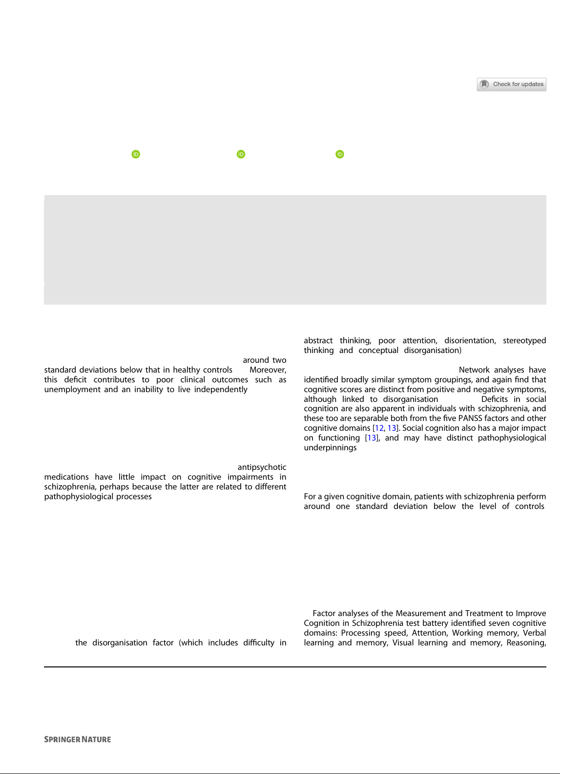 EXPERT REVIEW OPEN Cognitive impairment in schizophrenia: aetiology, pathophysiology, and treatment Robert A. McCutcheon 1,2,3✉, Richard S. E. Keefe 4 and Philip K. McGuire 1,3,5 © The Author(s) 2023, corrected publication 2023 Cognitive deficits are a core feature of schizophrenia, account for much of the impaired functioning associated with the disorder and are not responsive to existing treatments. In this review, we first describe the clinical presentation and natural history of these deficits. We then consider aetiological factors, highlighting how a range of similar genetic and environmental factors are associated with both cognitive function and schizophrenia. We then review the pathophysiological mechanisms thought to underlie cognitive symptoms, including the role of dopamine, cholinergic signalling and the balance between GABAergic interneurons and glutamatergic pyramidal cells. Finally, we review the clinical management of cognitive impairments and candidate novel treatments. Molecular Psychiatry (2023) 28:1902–1918; https://doi.org/10.1038/s41380-023-01949-9 INTRODUCTION Individuals with schizophrenia show a substantial impairment in overall cognitive performance, which, on average, is around two standard deviations below that in healthy controls [1]. Moreover, this deficit contributes to poor clinical outcomes such as unemployment and an inability to live independently [2]. While cognitive function in schizophrenia is an area of increasing research interest (Fig. 1) [3], this has yet to translate into the development of novel treatments for cognitive problems. All currently approved pharmacological treatments for schizophrenia exert their effects via antagonism of the dopamine D2 receptor [4, 5]. This mechanism of action is efficacious for symptoms that are thought to be driven by excessive striatal dopamine signalling, such as hallucinations and delusions. However, antipsychotic medications have little impact on cognitive impairments in schizophrenia, perhaps because the latter are related to different pathophysiological processes [5]. In the current paper, we outline the clinical nature of cognitive impairment in schizophrenia and consider potential aetiological factors. We then discuss pathophy- siology, before concluding with an examination of current and potential future treatment options. THE NATURE OF COGNITIVE IMPAIRMENTS IN SCHIZOPHRENIA Cognitive deficits appear to be distinct from positive and negative symptoms Factor analyses of the Positive and Negative Syndrome Scale (PANSS) indicate that a five-factor model (positive, negative, disorganised, excited, and depressed) captures the symptom structure of schizophrenia better than the original a priori grouping of positive, negative, and general symptoms [6, 7]. Of these five factors, the disorganisation factor (which includes difficulty in abstract thinking, poor attention, disorientation, stereotyped thinking and conceptual disorganisation) shows the strongest association with cognitive test scores, but still only accounts for a small proportion of the variance [8, 9]. Network analyses have identified broadly similar symptom groupings, and again find that cognitive scores are distinct from positive and negative symptoms, although linked to disorganisation [10, 11]. Deficits in social cognition are also apparent in individuals with schizophrenia, and these too are separable both from the five PANSS factors and other cognitive domains [12, 13]. Social cognition also has a major impact on functioning [13], and may have distinct pathophysiological underpinnings. This important aspect of cognition in schizophrenia has been reviewed in detail elsewhere [14, 15], and is not within the scope of the present review. Are impairments global or domain-specific? For a given cognitive domain, patients with schizophrenia perform around one standard deviation below the level of controls. However, the psychometric properties of composite scores are such that they are typically more extreme than their constituent parts [16]. Thus, patients show an impairment of around 1.5 standard deviations on overall composite scores relative to controls [1, 17–22]. An unresolved issue is whether there are distinct domains of cognitive impairment in schizophrenia, or whether the deficits are better summarised as global. This issue maps to a parallel debate over whether the pathophysiology of schizophrenia involves specific loci of brain dysfunction or a systems-level disruption. Factor analyses of the Measurement and Treatment to Improve Cognition in Schizophrenia test battery identified seven cognitive domains: Processing speed, Attention, Working memory, Verbal learning and memory, Visual learning and memory, Reasoning, Received: 19 August 2022 Revised: 3 January 2023 Accepted: 6 January 2023 Published online: 23 January 2023 1Department of Psychiatry, University of Oxford, Oxford, UK. 2Department of Psychosis Studies, Institute of Psychiatry, Psychology & Neuroscience, London, UK. 3Oxford health NHS Foundation Trust, Oxford health NHS Foundation Trust, Oxford, UK. 4Departments of Psychiatry and Behavioral Sciences, Duke University Medical Center, Durham, NC, USA. 5NIHR Oxford Health Biomedical Research Centre, Oxford, UK. ✉email: Robert.mccutcheon@psych.ox.ac.uk www.nature.com/mp Molecular Psychiatry 1 2 3 4 5 6 7 8 9 0 () ;,: http://crossmark.crossref.org/dialog/?doi=10.1038/s41380-023-01949-9&domain=pdf http://crossmark.crossref.org/dialog/?doi=10.1038/s41380-023-01949-9&domain=pdf http://crossmark.crossref.org/dialog/?doi=10.1038/s41380-023-01949-9&domain=pdf http://crossmark.crossref.org/dialog/?doi=10.1038/s41380-023-01949-9&domain=pdf http://orcid.org/0000-0003-1102-2566 http://orcid.org/0000-0003-1102-2566 http://orcid.org/0000-0003-1102-2566 http://orcid.org/0000-0003-1102-2566 http://orcid.org/0000-0003-1102-2566 http://orcid.org/0000-0002-0173-8897 http://orcid.org/0000-0002-0173-8897 http://orcid.org/0000-0002-0173-8897 http: