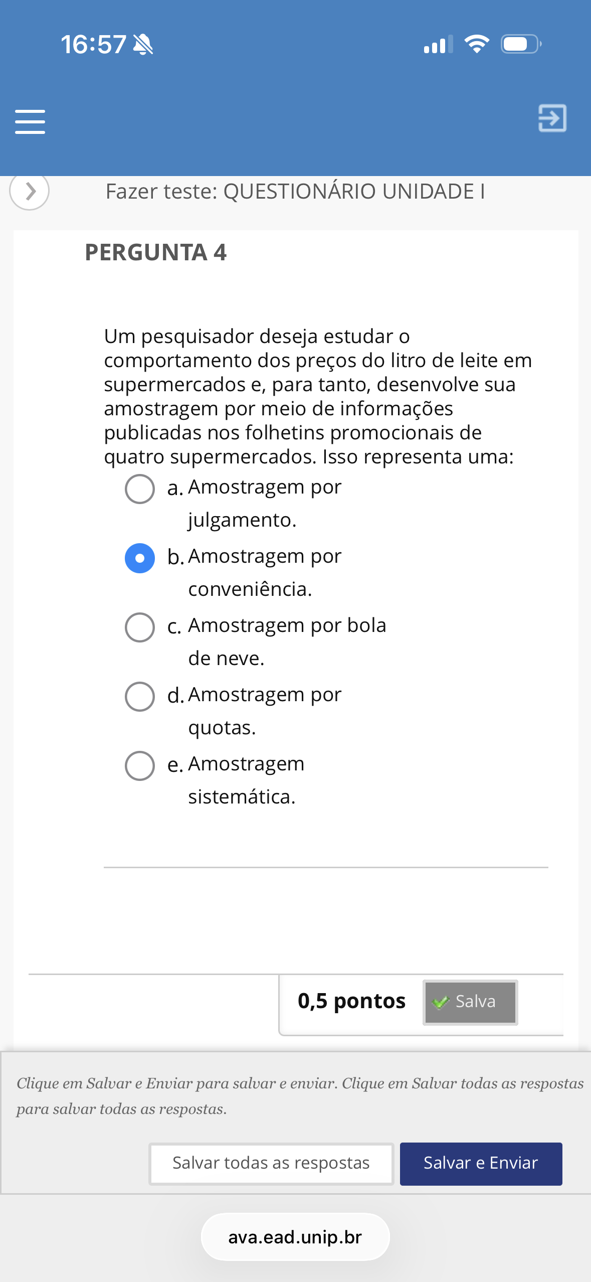 16:57 Fazer teste: QUESTIONÁRIO UNIDADE I PERGUNTA 4 Um pesquisador deseja estudar comportamento dos preços do litro de leite em supermercados e, para tanto, desenvolve sua amostragem por meio de informações publicadas nos folhetins promocionais de quatro supermercados. Isso representa uma: a. Amostragem por julgamento. b. Amostragem por conveniência. C. Amostragem por bola de neve. d. Amostragem por quotas. e. Amostragem sistemática. 0,5 pontos Salva Clique em Salvar e Enviar para salvar e enviar. Clique em Salvar todas as respostas para salvar todas as respostas. Salvar todas as respostas Salvar e Enviar ava.ead.unip.br